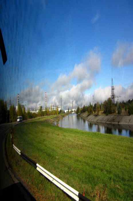 Проходит еще немного времени, и мы подъезжаем к самой Чернобыльской атомной электростанции. Нас встречает канал для подачи охлаждающей воды. Купаться в нем не рекомендуется, да и рыбу ловить тоже. Последняя, при таких условиях, очень вольготно себя чувствует, растет, размножается и совершенно не реагирует на удивленных туристов.