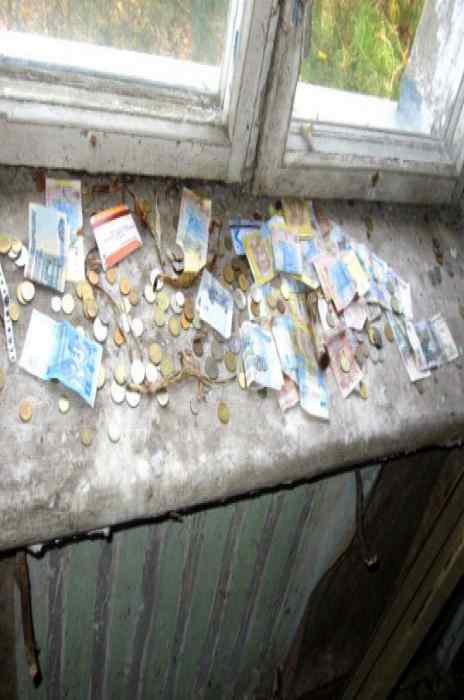 Но можно встретить в Припяти и довольно необычные моменты. Так, например, один подоконник стал своеобразным фонтаном, куда приходящие бросают монетки, хотя первые деньги появились на нем с совершенно другой целью. Для того чтобы проверить заходит кто-либо в эту квартиру или нет, на подоконнике оставили несколько монет, если монеты исчезнут – значит, здесь кто-то бывает, нет – значит, нет. Люди действительно в квартиру заходили, но вот реакция на монеты была совершенно противоположной, чем задумывалось – через какое-то время на подоконнике уже лежало около 200$ различными валютами и номиналом.
