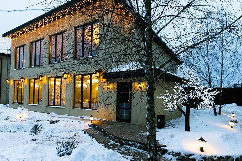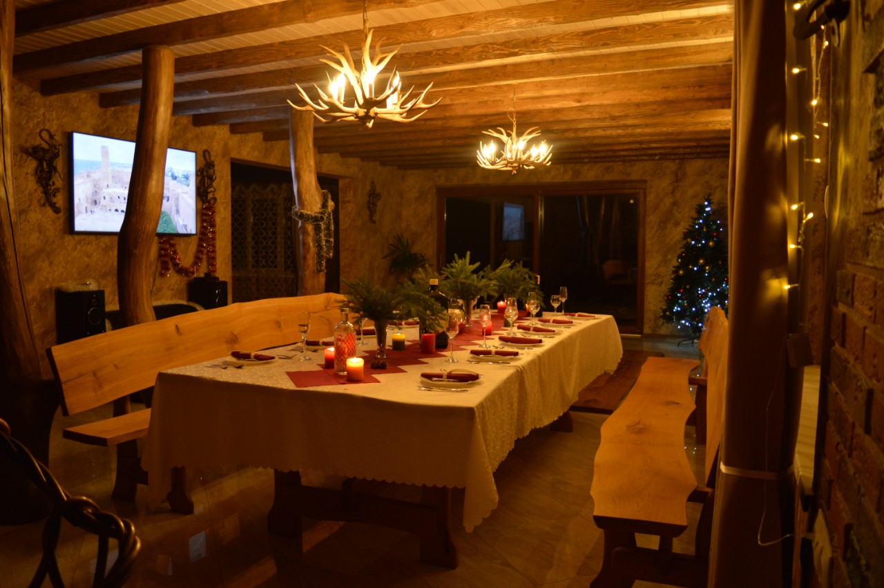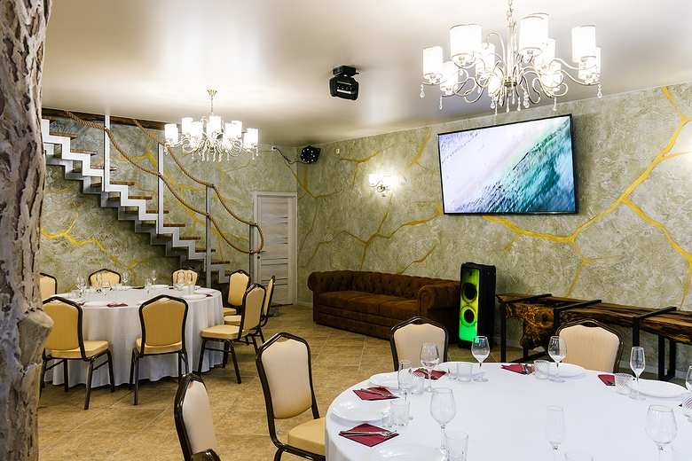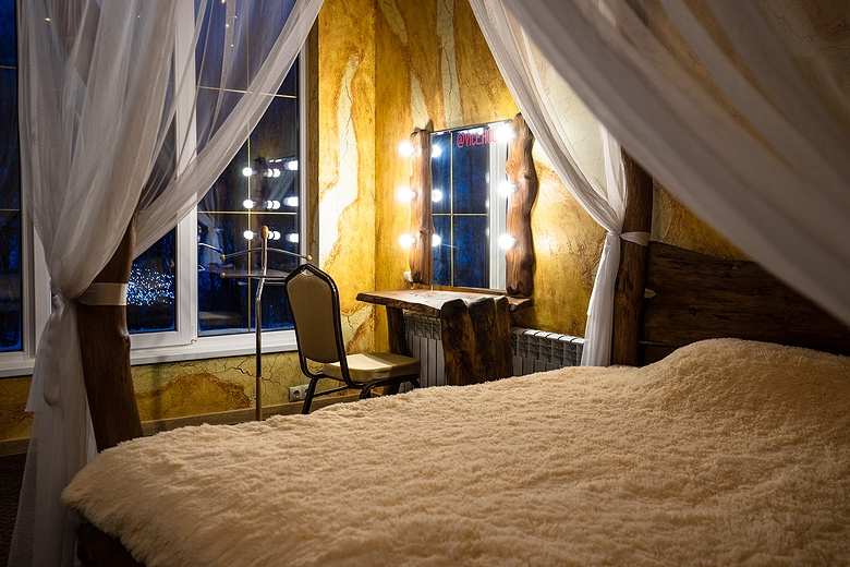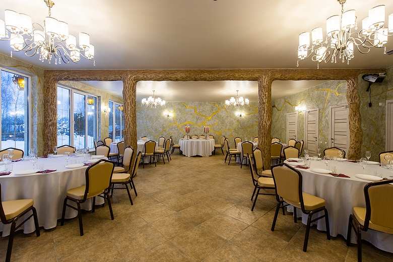Внутри дома есть 5 комнаты отдыха с двуспальными кроватями и мебелью, чтобы комфортно разместиться на несколько дней. Только современная сантехника и бытовая техника кухни: все блага цивилизации доступны даже в загородной поездке. Из дома оборудован выход на террасу, которая легко превращается в дополнительное место для праздника. Тут можно оборудовать настоящий банкетный зал на свежем воздухе. Для мероприятий внутри дома предлагается 2 банкетных зала (20-50 чел.) с уникальными интерьерами.