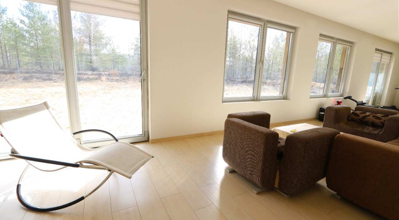 В доме предусмотрены большие витражные окна, пропускающие много солнечного света на отапливаемой веранде площадью 48 кв.м. Раздвижные прозрачные двери ведут на участок, или террасу где можно устраивать праздники, ужин с барбекю или теплые встречи с друзьями и родственниками.