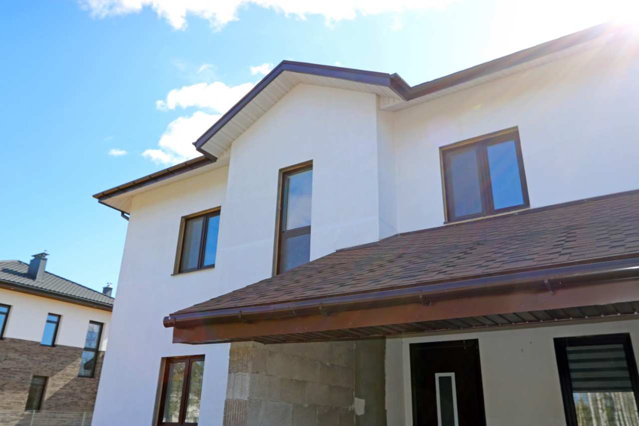 Дом площадью около 279 кв. м выполнен из газосиликатных блоков толщиной 400 мм. В наружной отделке стен предполагается установка вентилируемого утепленного фасада и использование комбинаций различных материалов (лиственница, фиброцементные панели, гиперпресованная плитка). Кровля – мягкая черепица.