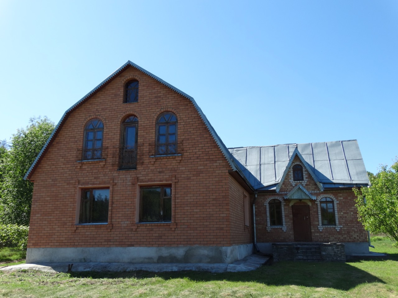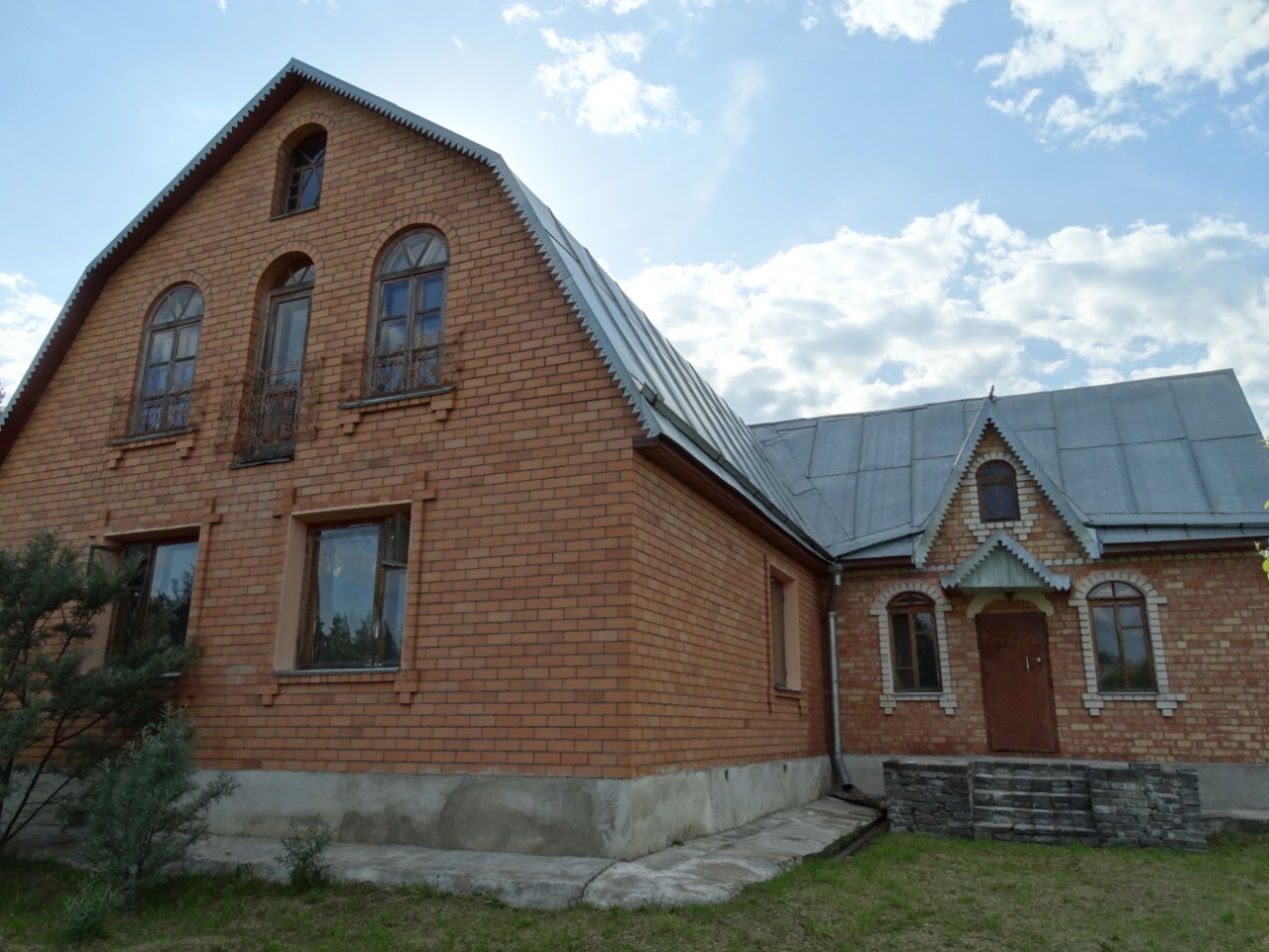 Новый сруб, обложен красным кирпичем.