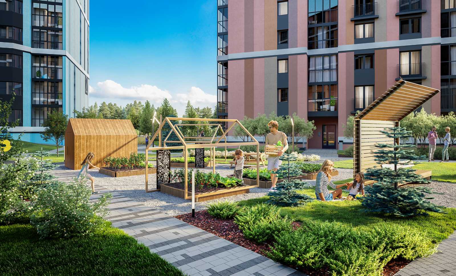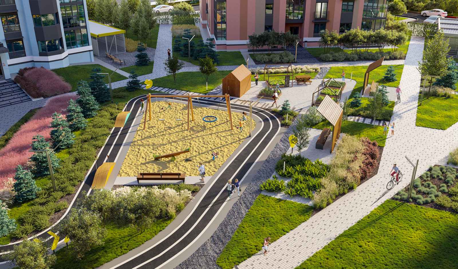 Дом возводится на закрытой территории с круглосуточным видеонаблюдением. Во дворе расположены детские площадки и стильные зоны отдыха, разработанные по индивидуальному проекту, а также велопарковки. Недалеко от дома находится многоуровневый паркинг и большая лесопарковая зона. Кроме того, в квартале «Центральный парк» появится настоящий парк городского типа.