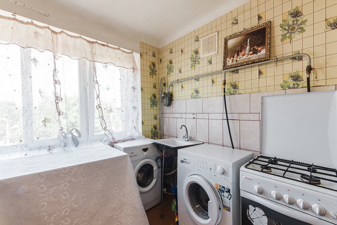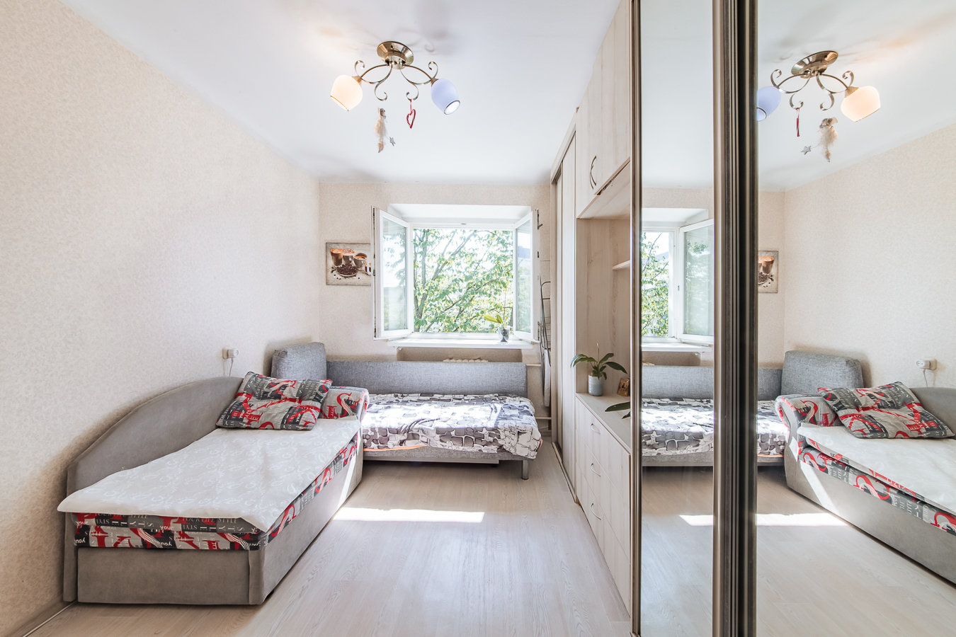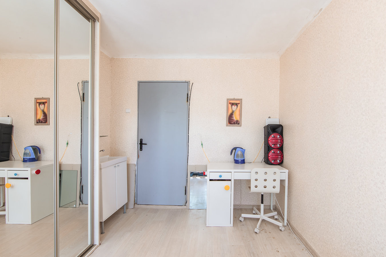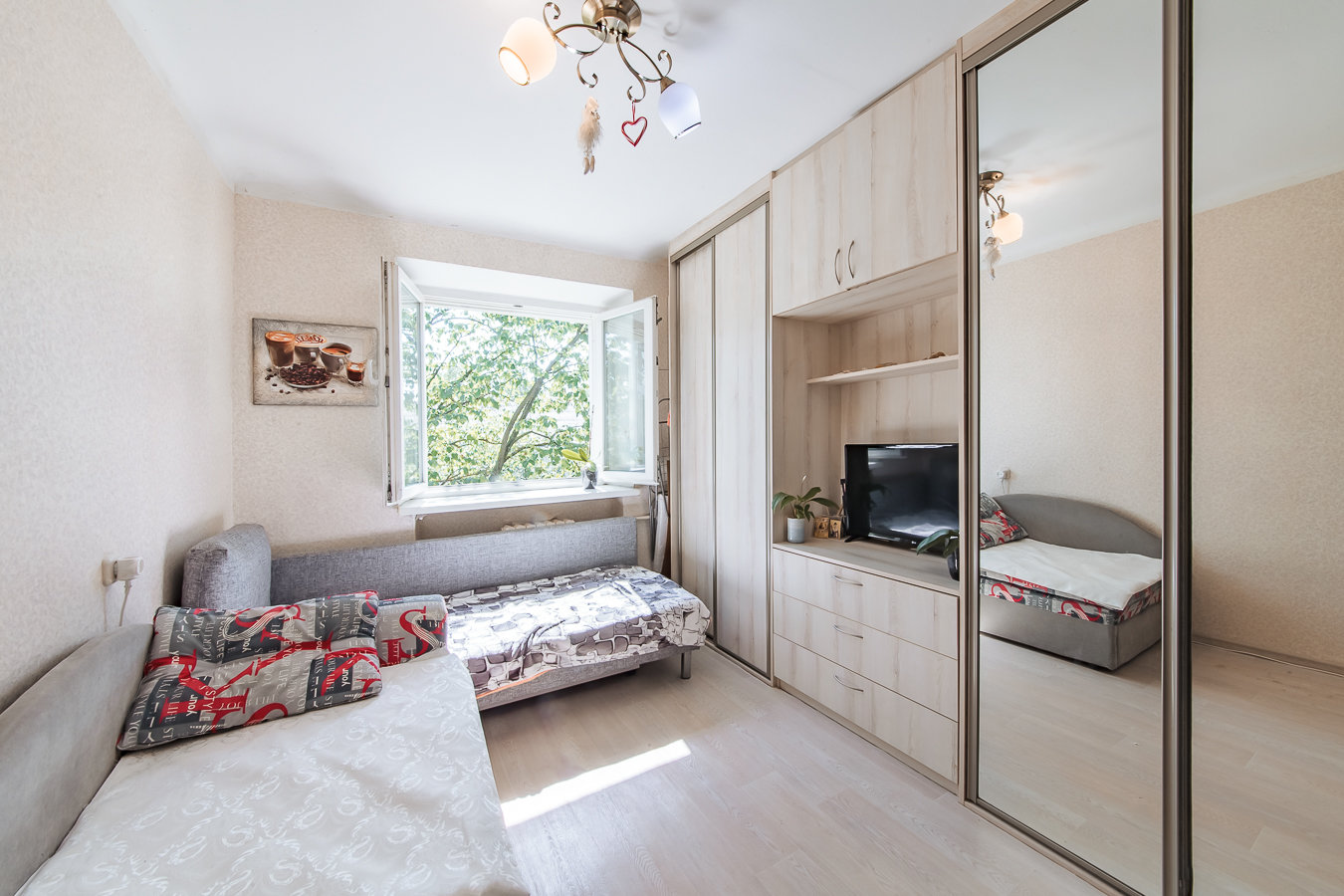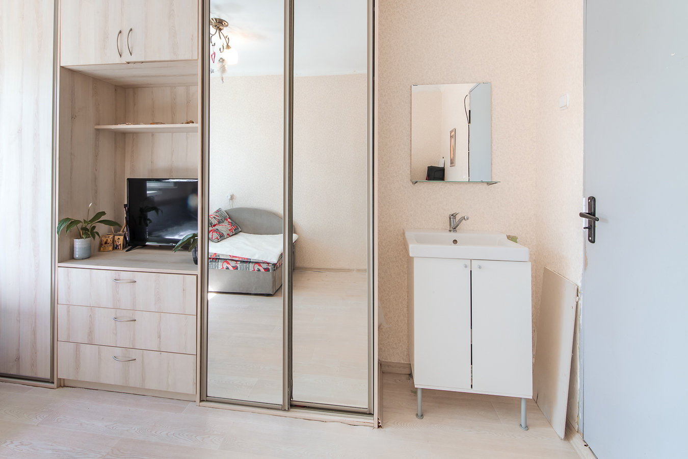 • в комнате выполнен свежий ремонт, окно ПВХ с двухкамерным стеклопакетом, новый встроенный шкаф, есть собственный умывальник ( холодная/горячая вода), стиральная машина, мягкая мебель