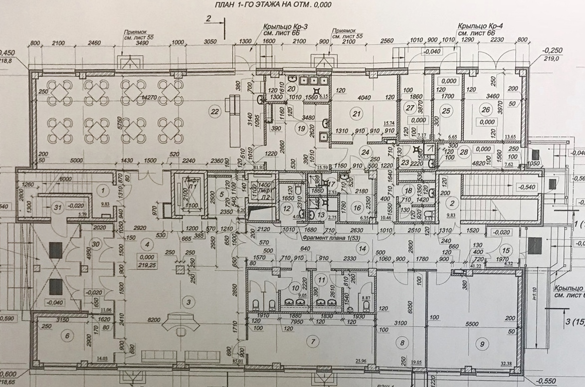 1-й этаж: вестибюль с рецепцией, комнатой охраны и администрации; буфет на 32 посадочных места; 2 административных помещения, с/у и др.;