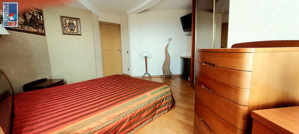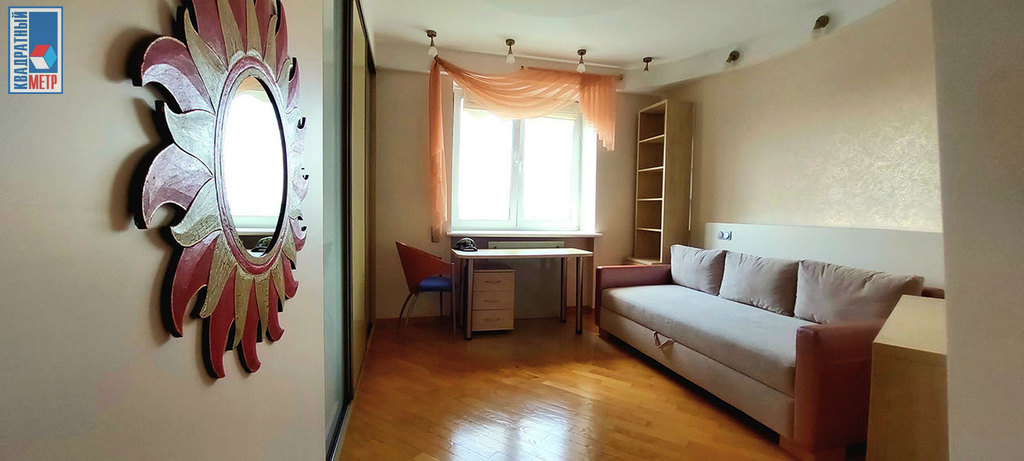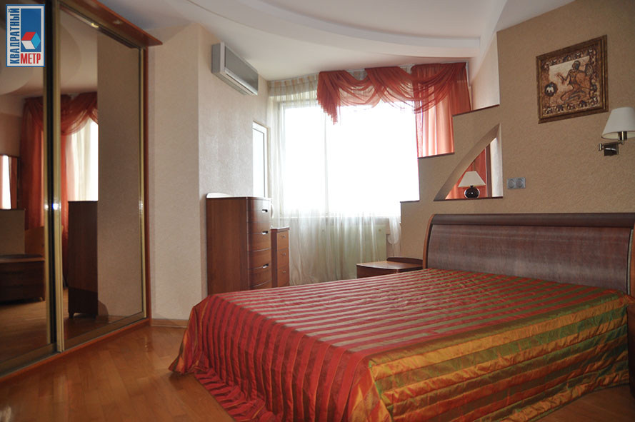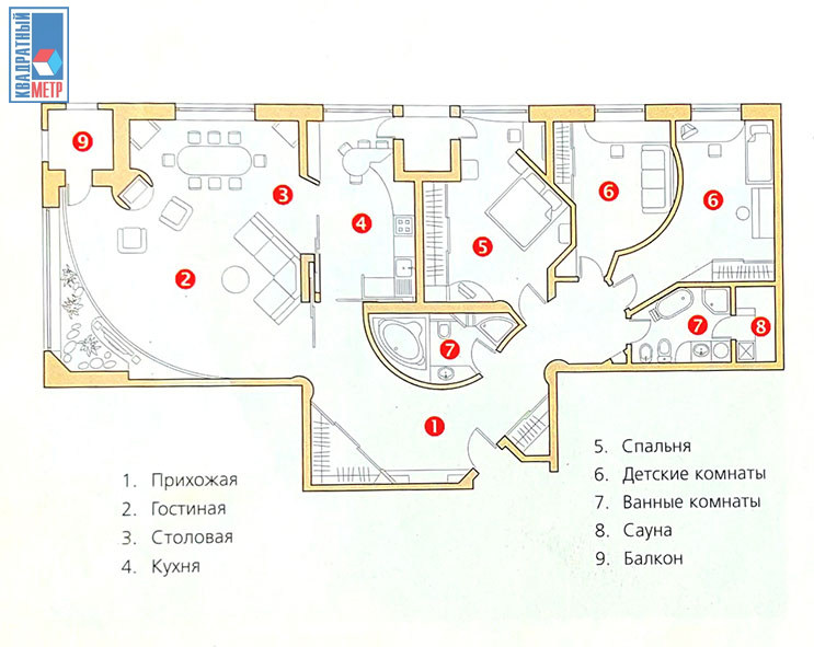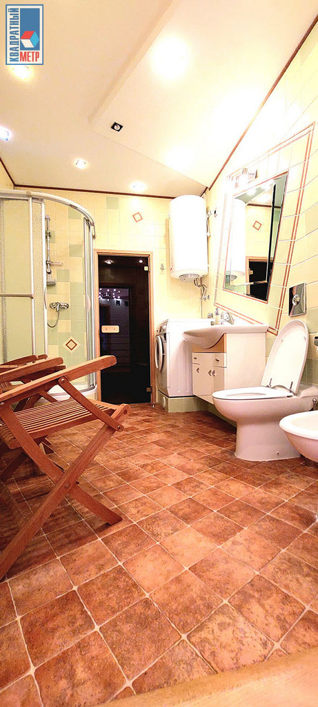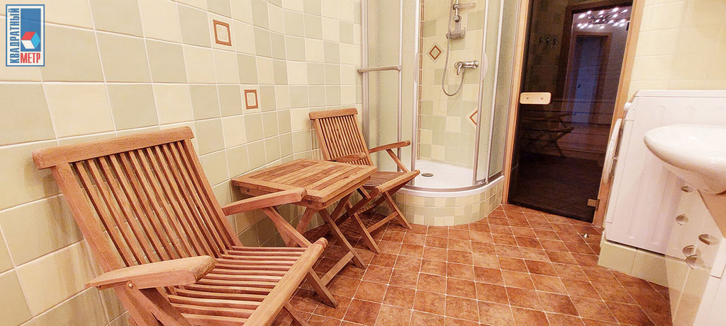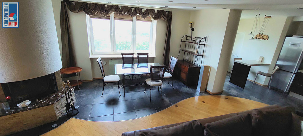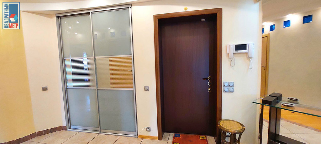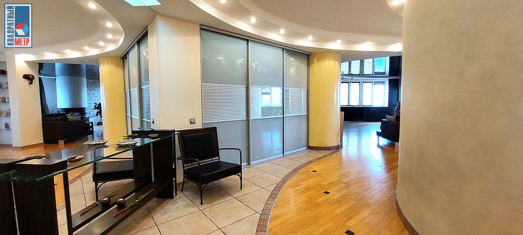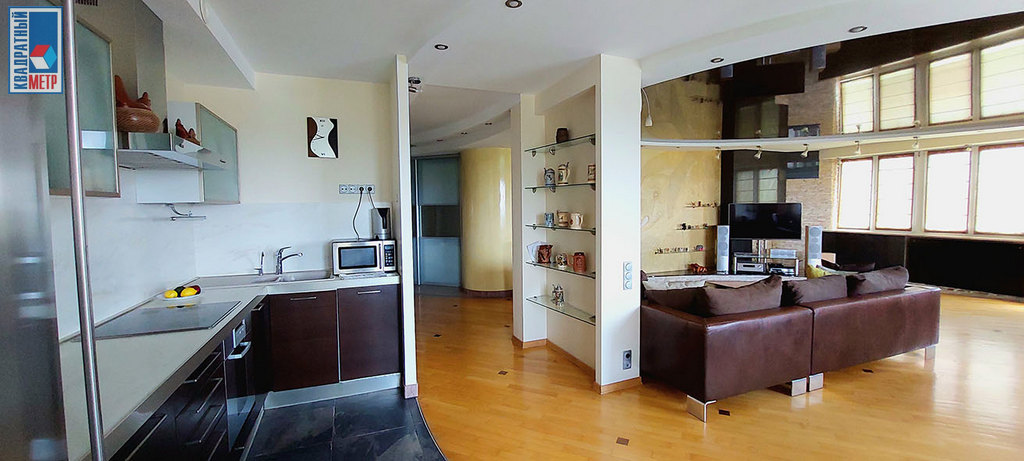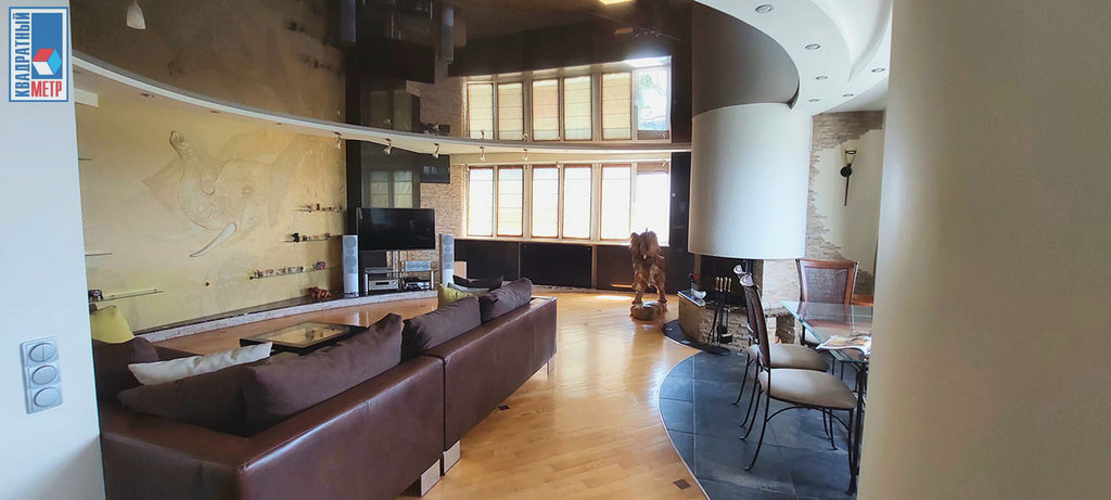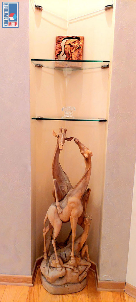 Дом, в котором находится эта квартира расположен в очень живописном месте Минска. Владельцы обратились к архитекторам Александру Трусову и Марине Скребко за помощью в создании спокойного тёплого интерьера. Планировка квартиры была на столько удачной, что авторы проекта предложили лишь незначительно изменить конфигурацию помещений и включить в общее пространство коридоры, чтобы сделать её более просторной. Новое планировочное решение было принято заказчиками сразу. В квартире где изначально присутствовали только стандартные прямоугольные помещения, удалось создать студийное пространство. строительство продолжалось около года: укрепляли потолки и стены, переносили перегородки. Стечение обстоятельств привело к тому, что работу над проектом пришлось приостановить. Спустя два года заказчики вернулись в Беларусь и решили самостоятельно осуществлять авторский надзор и довести оформление интерьера до логического завершения. Будучи творческими людьми, они стали полноценными соавторами проекта. Прежде всего они откорректировали колористическое решение, использовав тёплые желтоватые тона для стен, белые - для потолка, коричневые - в мебели. Цвет и фактура итальянской плитки Rex и Imola подбирались в зависимости от места использования. Пол в прихожей выложен розовато-бежевой плиткой с шероховатой поверхностью. Она огибает изогнутую ленту из светлого паркета, обозначая входную зону. Для столовой и кухни прекрасно подошла тёмно-серая напольная плитка - не маркая и в то же время эффектная. в ванной белая и розовая плитка для стен, пол отделан плиткой сложного красно-коричневого цвета. Cауна декорирована плиткой жизнерадостных оттенков лимонного и салатового. Итальянские двери фабрики Barausse из выбеленного дуба завершают интерьерную композицию. Безусловно, самым эффектным помещением квартиры является гостиная, объединённая со столовой. Зрительно увеличить пространство позволила использование натяжного потолка тёмного почти чёрного цвета. В глянце потолочной ткани отражается вся комната, в том числе коллекция слонов, размещённая на стеклянных полках на фоне декоративного панно, созданного художником Александром Шаппо. Ещё один слон-деревянный- украшает угол гостиной возле камина. Мастера из Индонезии вырезали скульптуру специально для этой квартиры. Другой угол гостиной отделан полированной тёмно-серей плиткой и декоративным камнем. В этой части разместился небольшой Зимний сад и оборудование для домашнего кинотеатра. Кухня небольшая с однорядной кухонной мебелью. Барная стойка используется как стол для завтрака. В простенке между кухней и гостиной сделаны полки, на которых выставлена коллекция пивных кружек. Диван в гостиной сделан белорусской фирмой Furman, а обеденный стол, стулья и горка для посуды-малазийскими мебельщиками. Прихожую украшает консоль китайской марки Red Apple. Итальянский гарнитур для спальни и кухня Lube довершают интернациональную композицию. Благодаря подбору мебели, различной по стилю, но прекрасно сочетающейся между собой, интерьер обрёл мягкий этнический характер. Спальня имеет сложную ломаную конфигурацию. Архитекторы предложили такое решение, чтобы вместить в неё всё необходимое - двуспальную кровать, объёмный встроенный шкаф, туалетный столик. Смещение оси, по которой установлена кроват