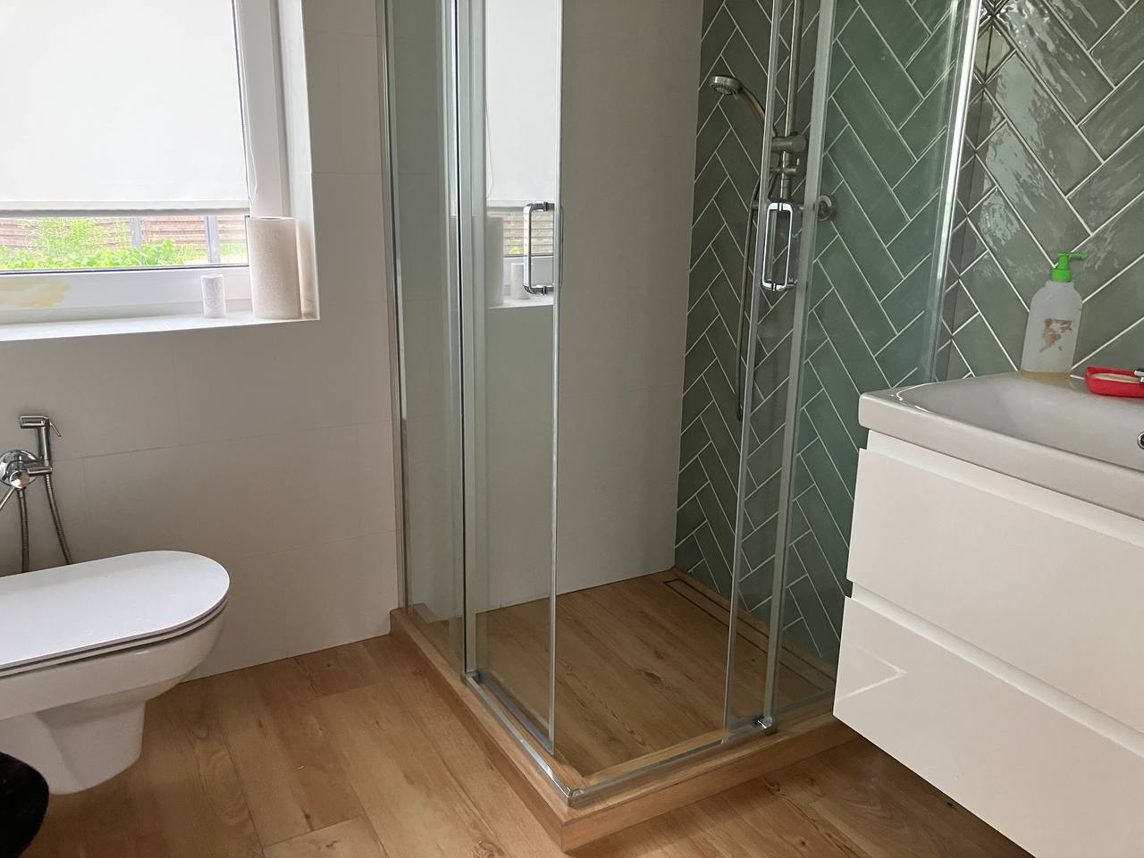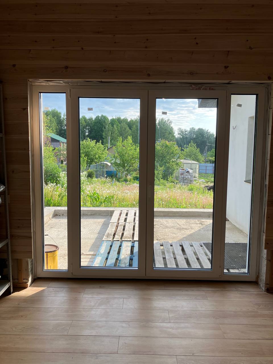 На первом этаже наполовину сделана чистовая отделка. В целом дом полностью готов к чистовой отделке (планировалась вагонка), на первом этаже уложена плитка на полу.