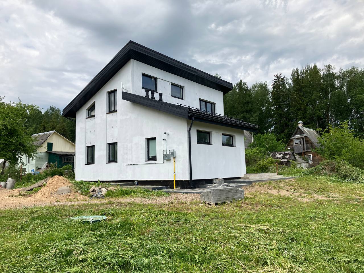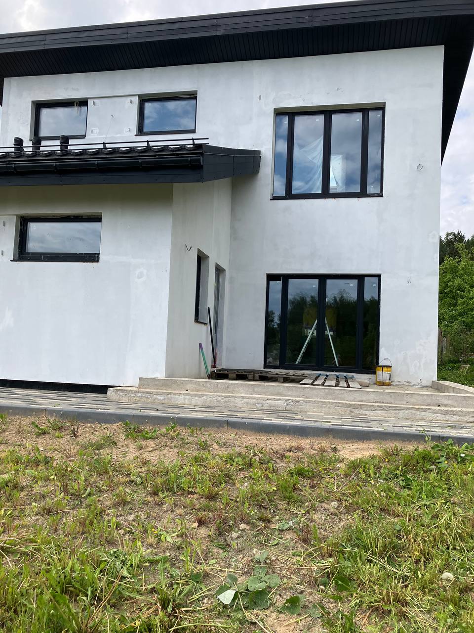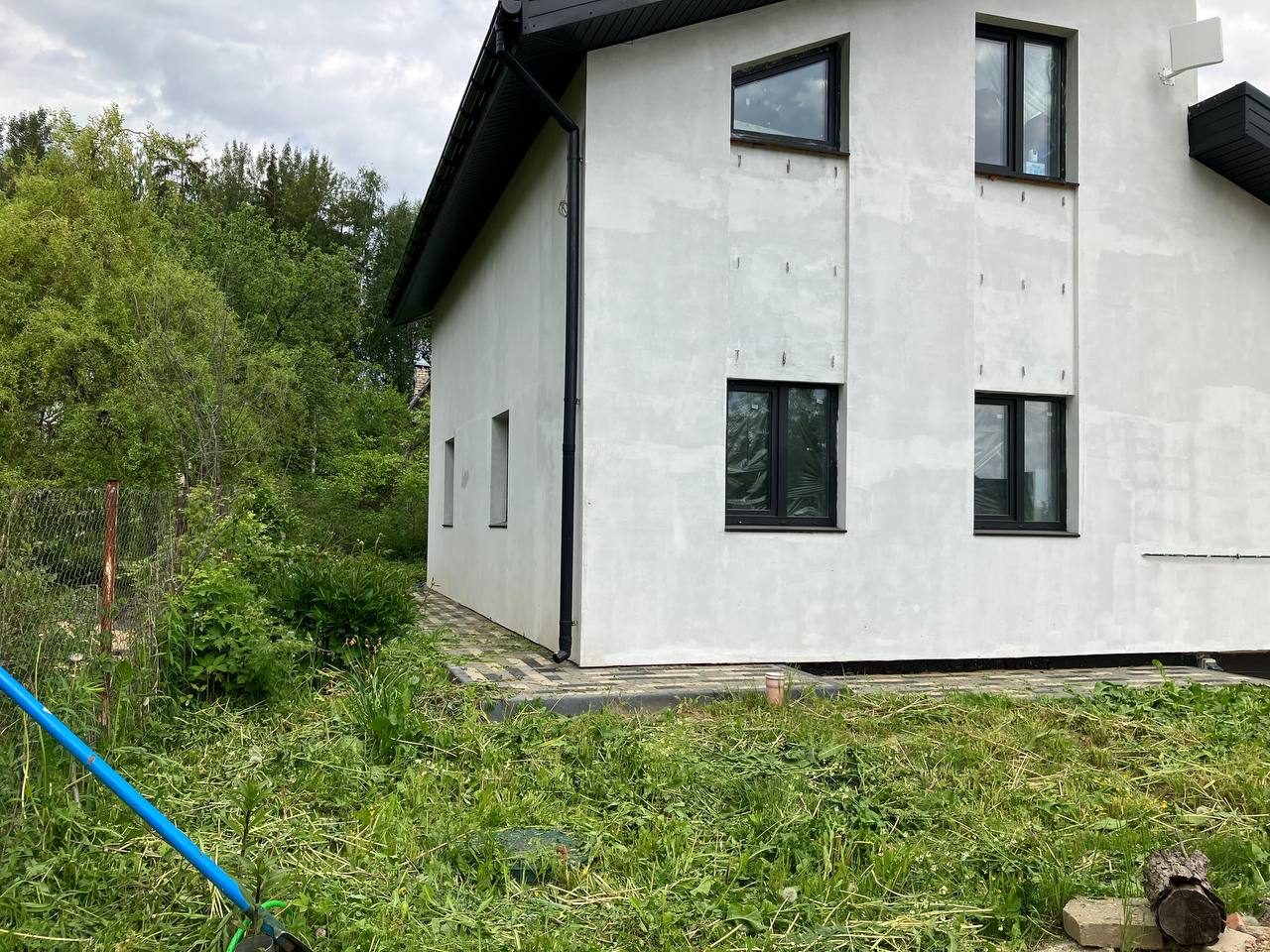 Дом покрыт грунтовкой и готов к оштукатуриванию, полностью сделан водосток, выведены кронштейны под планкен, возведено крыльцо под террасу, сделана отмостка.