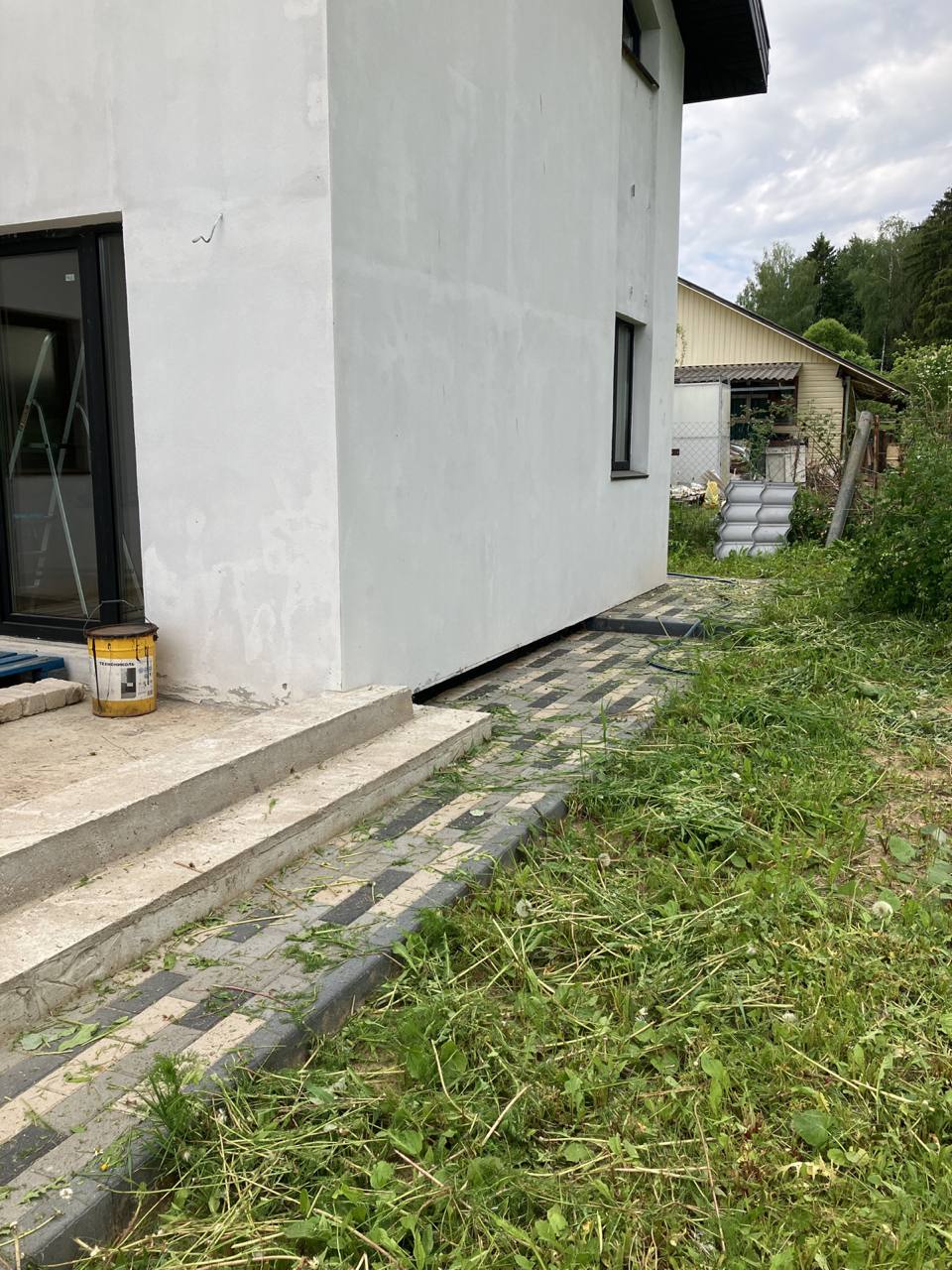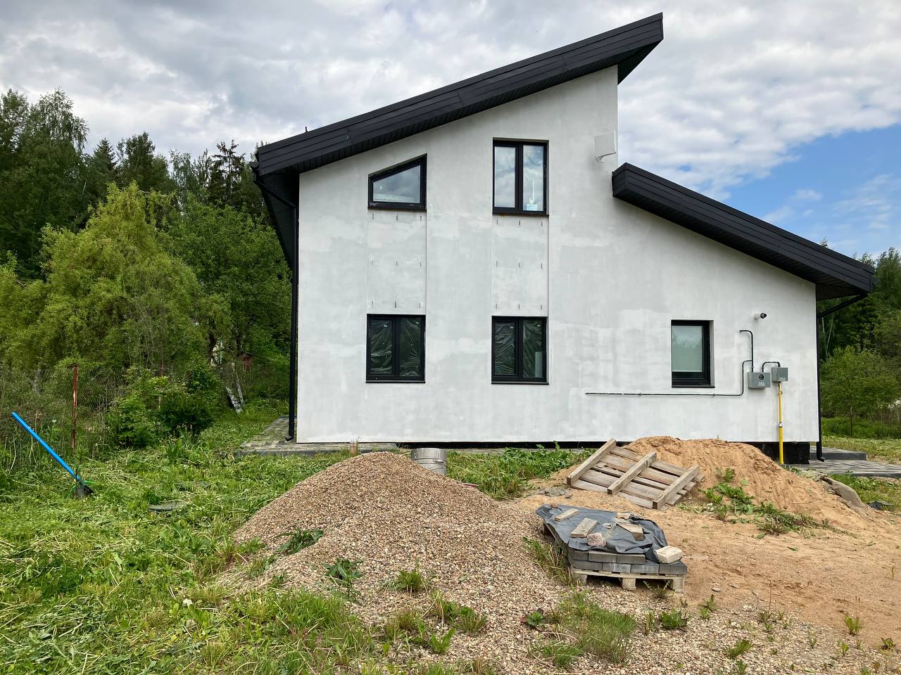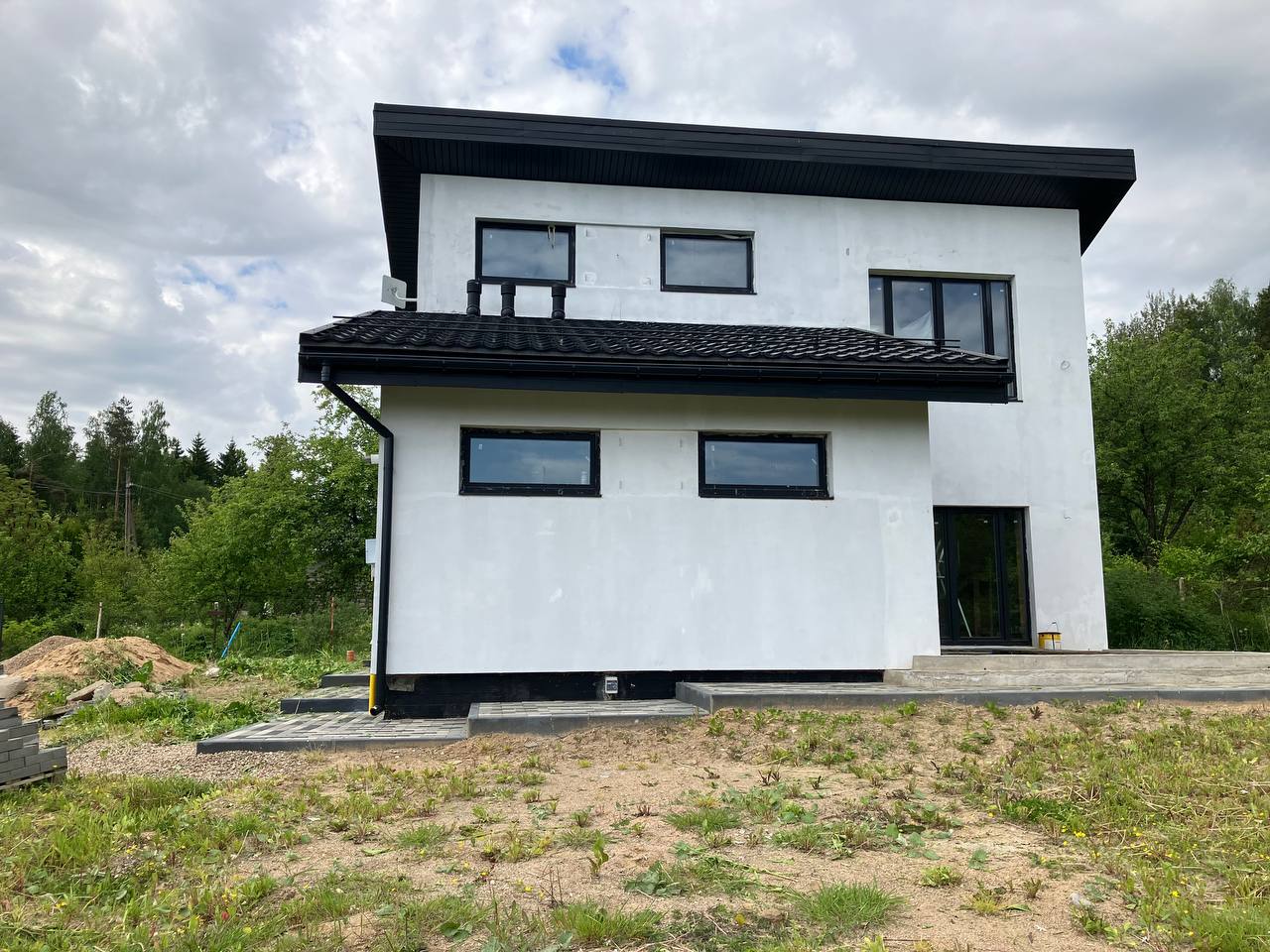 Дом покрыт грунтовкой и готов к оштукатуриванию, полностью сделан водосток, выведены кронштейны под планкен, возведено крыльцо под террасу, сделана отмостка.