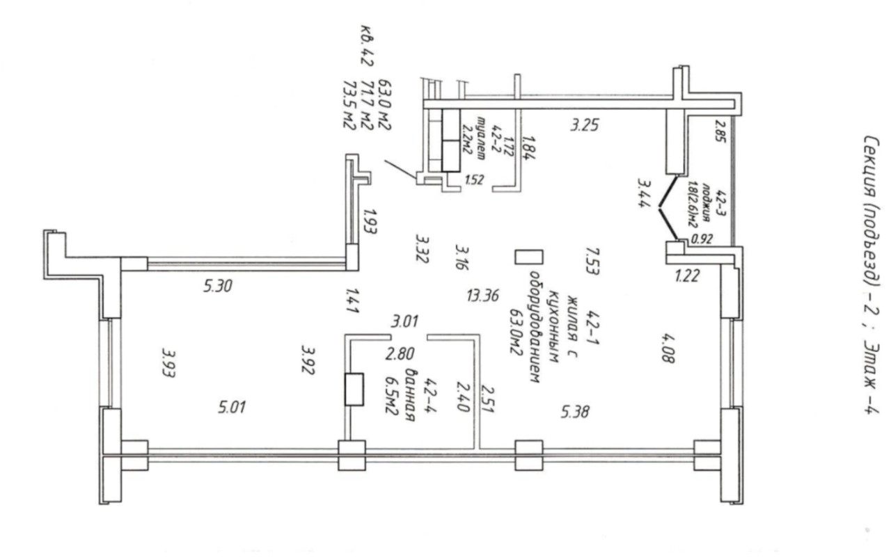 73.7 м2, - 2 большие комнаты, зал совмещен с кухней.