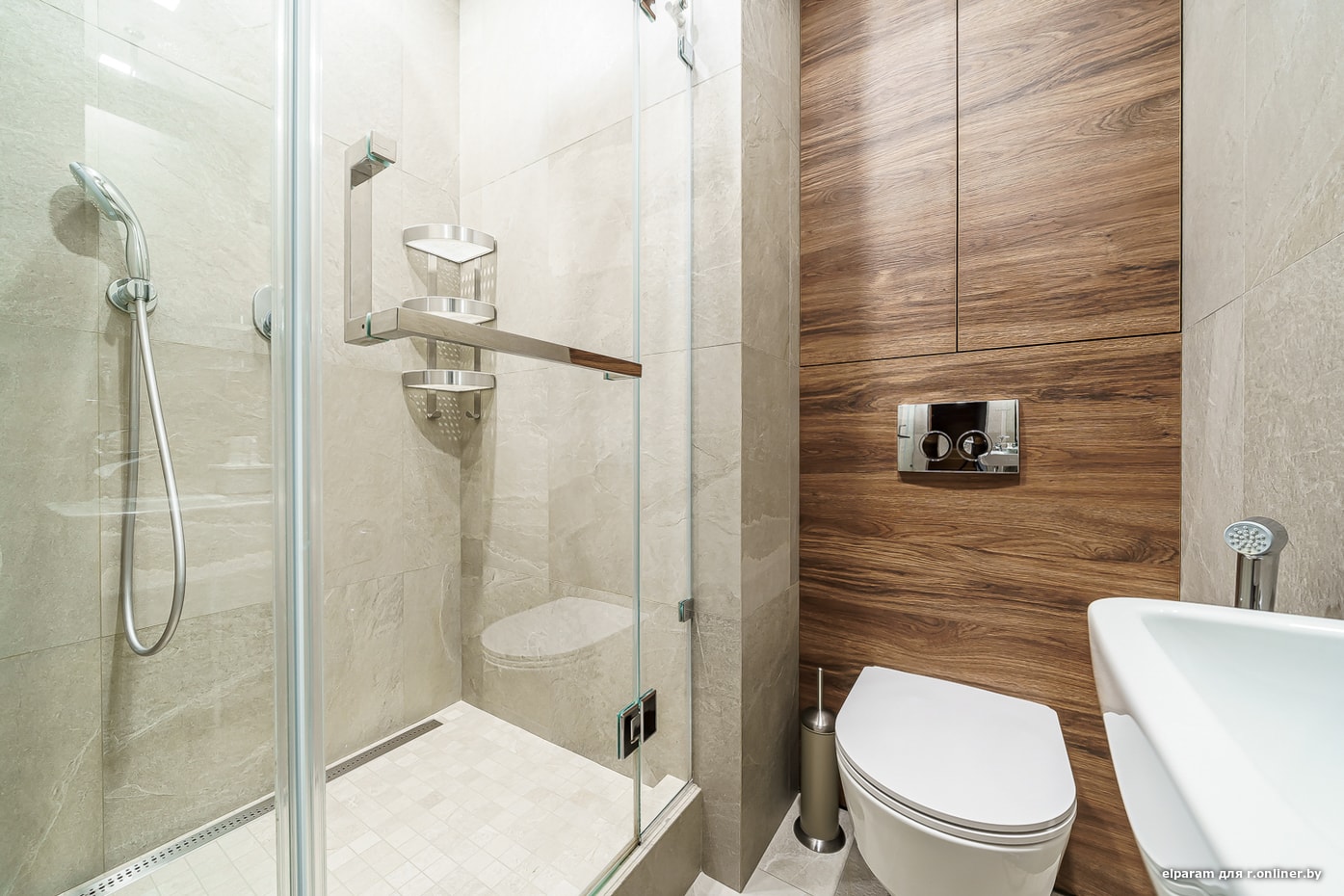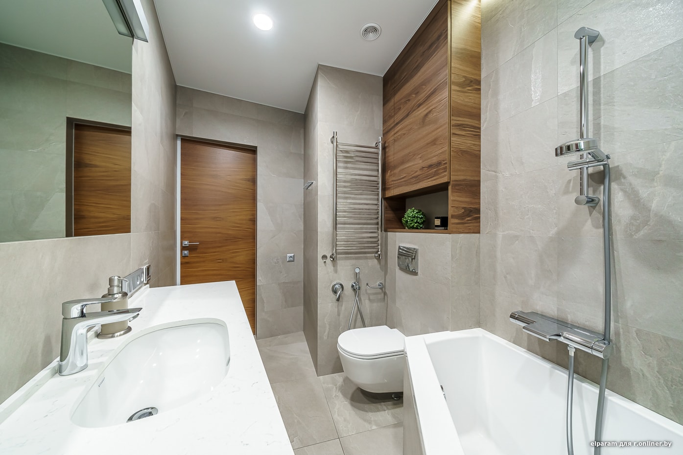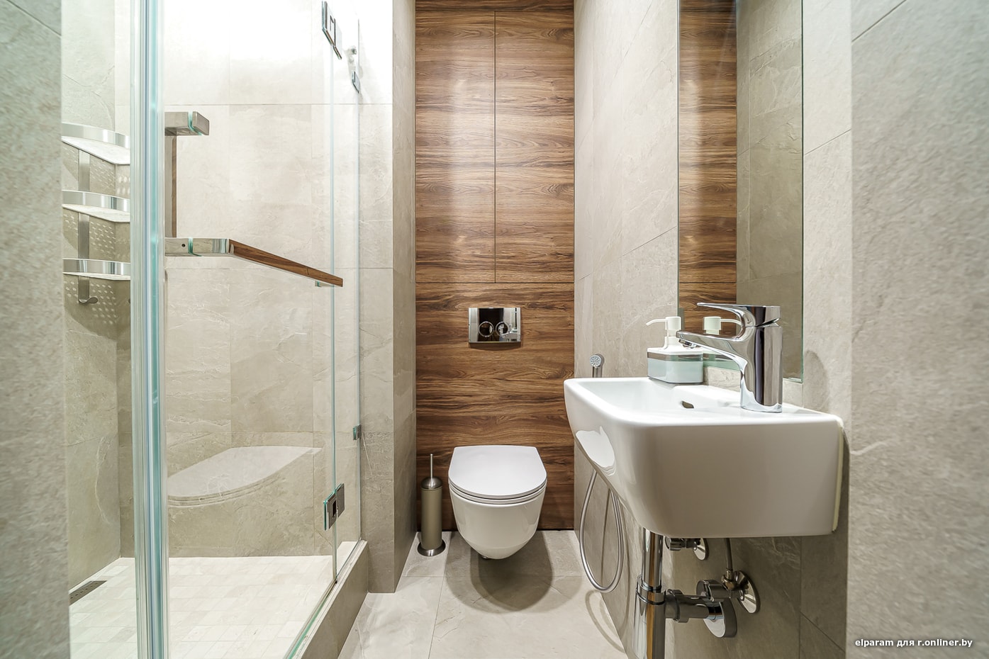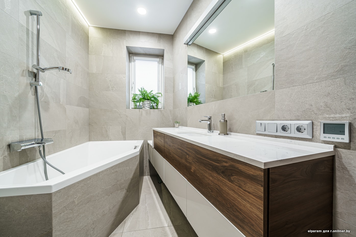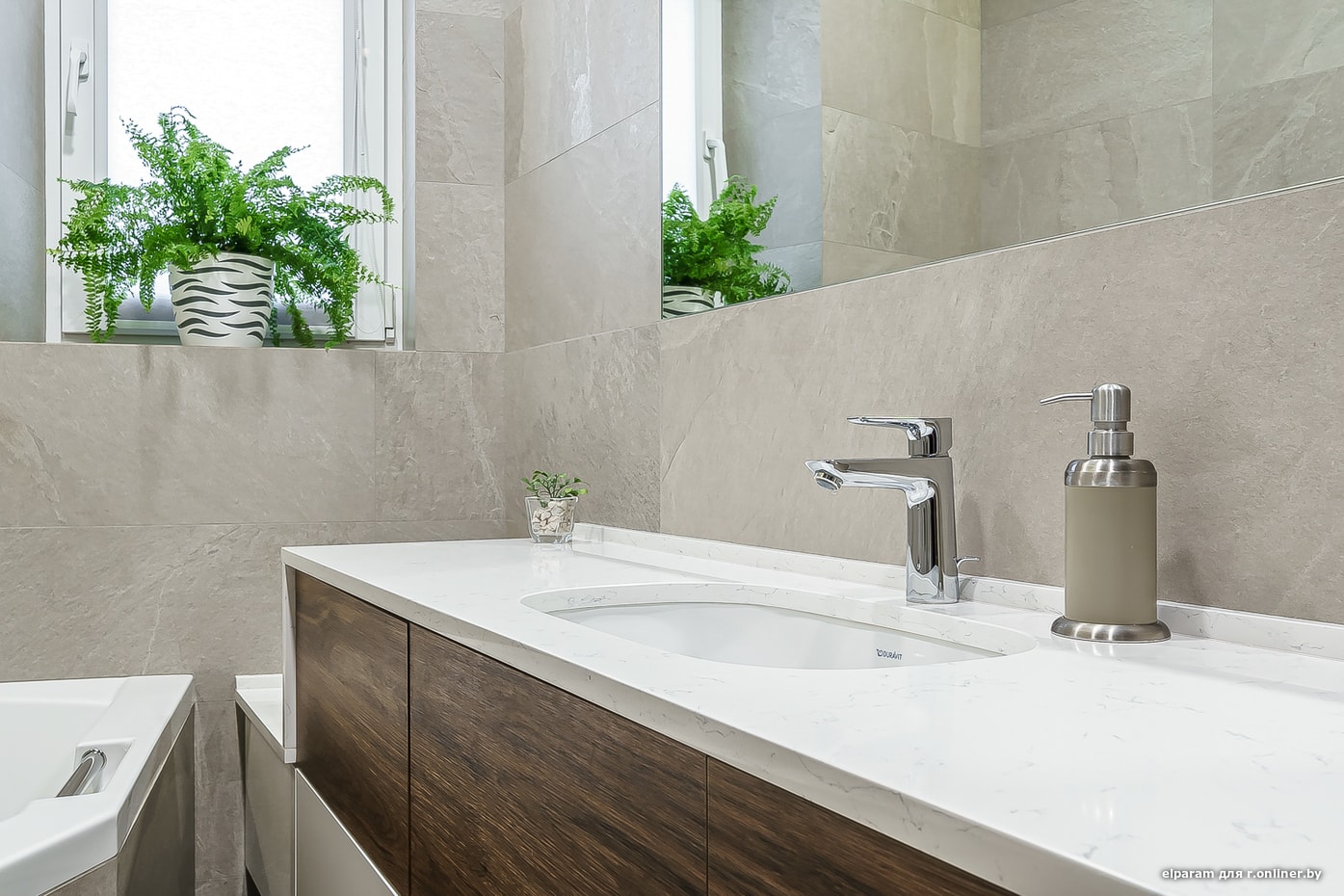2.1 Большая туалетная комната, оборудована объемной ванной с терморегулятором, теплым полом и широкой каменной столешницей с тумбой, в которой всегда найдется место для вашей косметики;