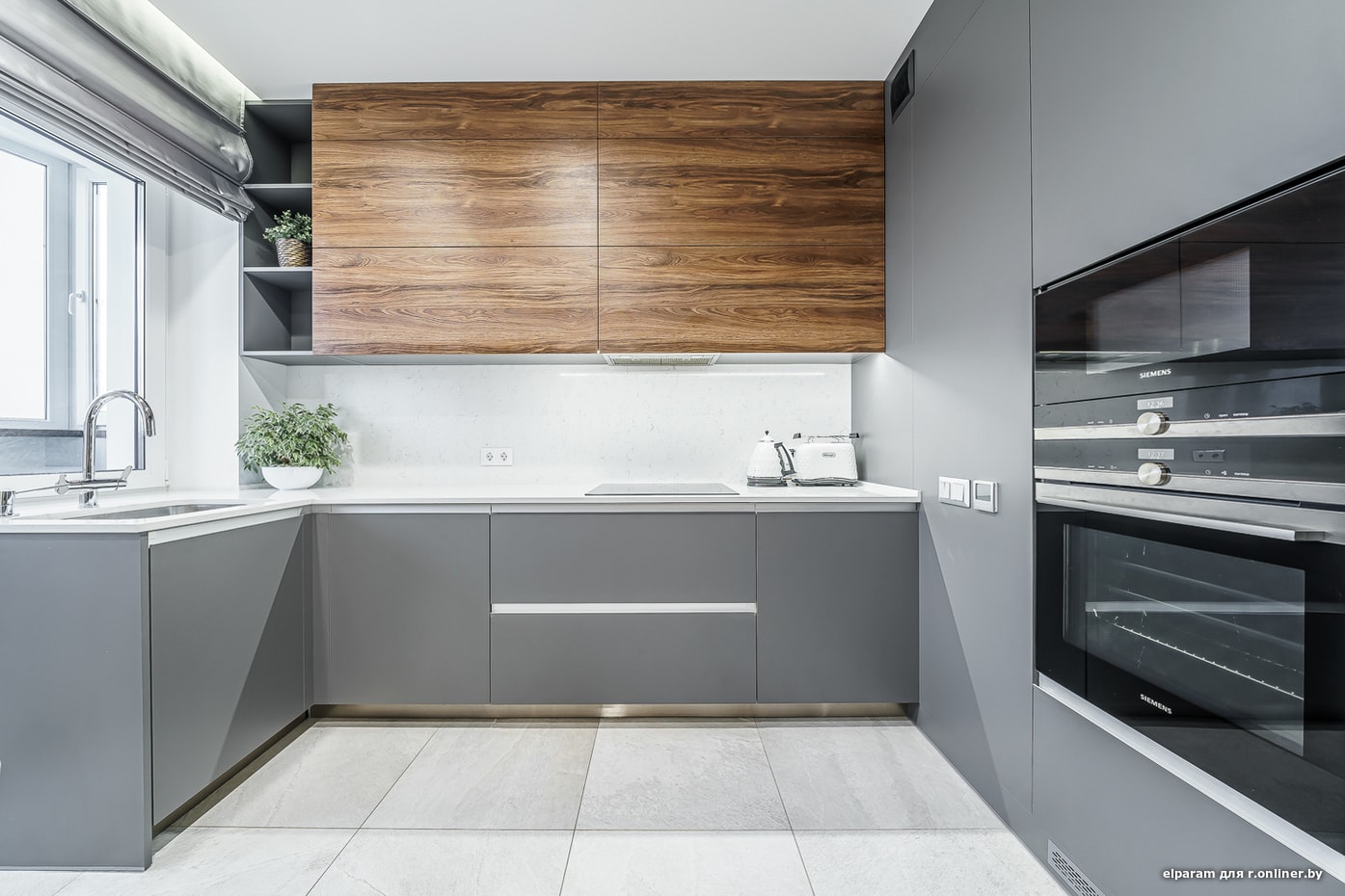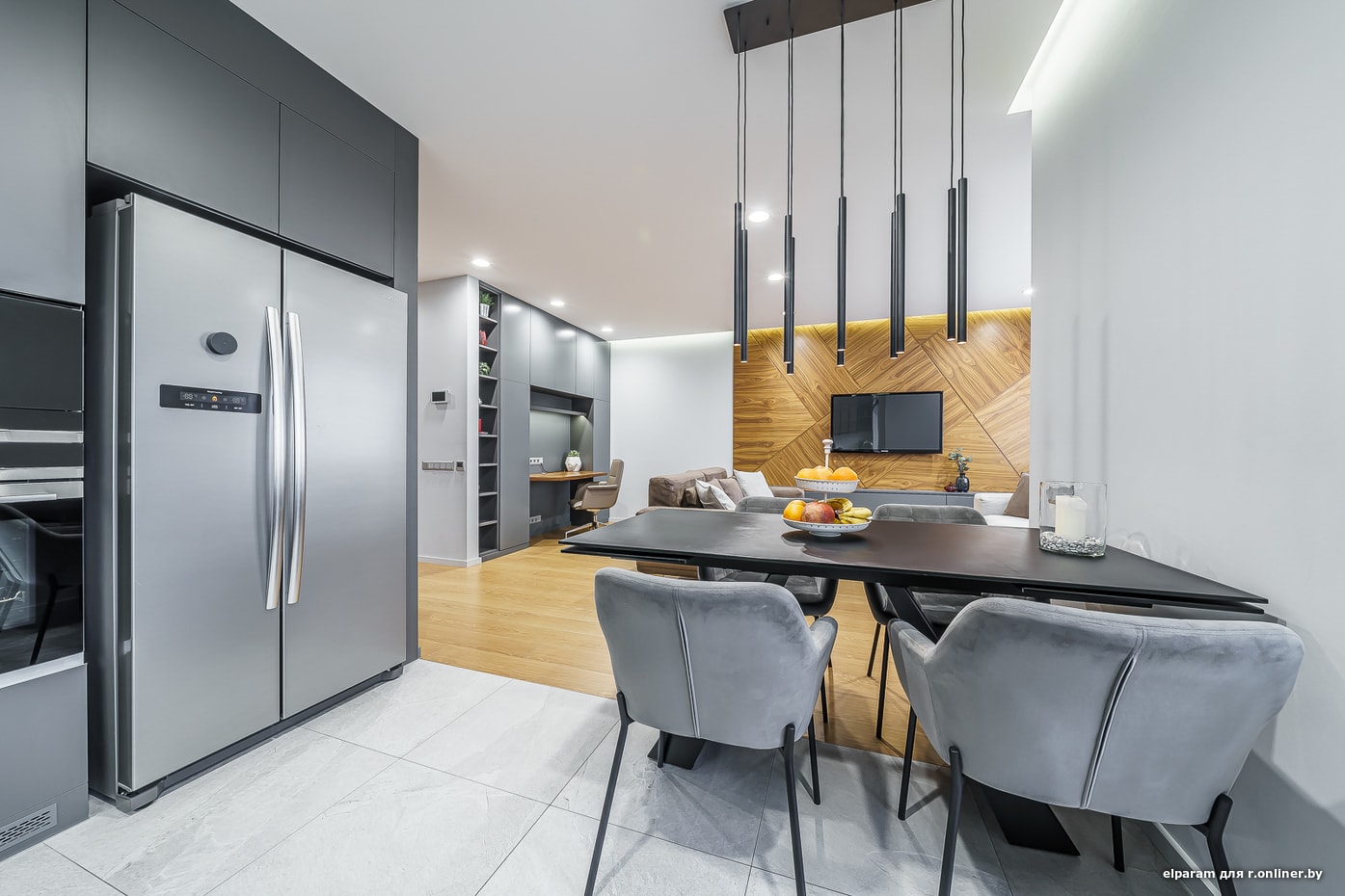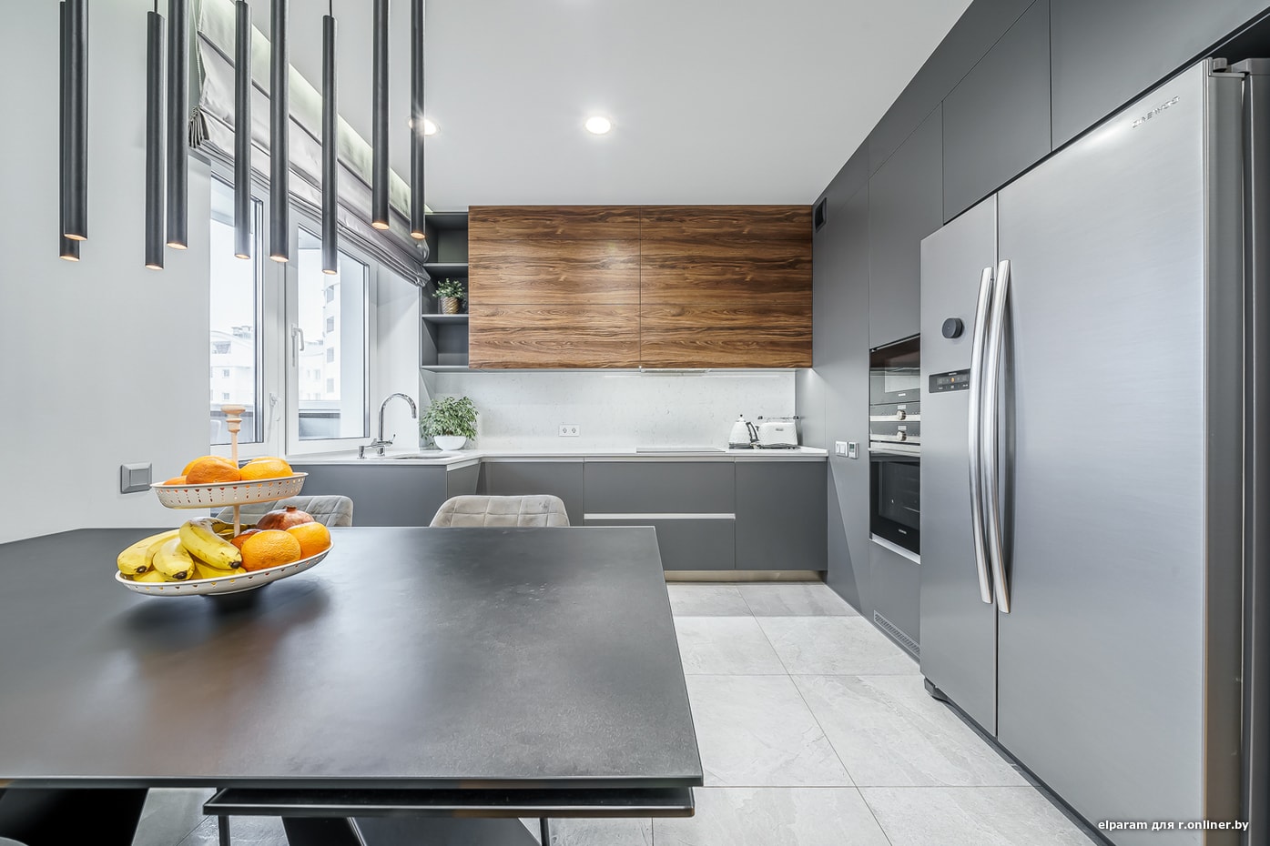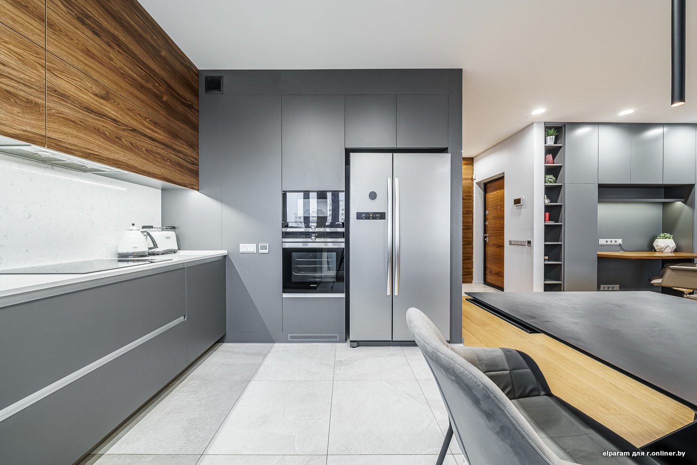 1.1 Место для готовки с каменной столешницей (Technistone), встроенной техникой Siemens (индукционная плита, умная духовка, микроволновка, а также главная помощница на кухне - большая посудомойка) и вместительный холодильник. Итальянский керамогранитный пол оборудован подогревом, чтобы вашим ногам было всегда тепло и приятно.