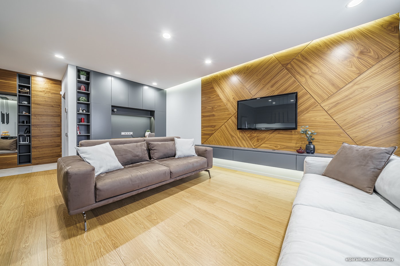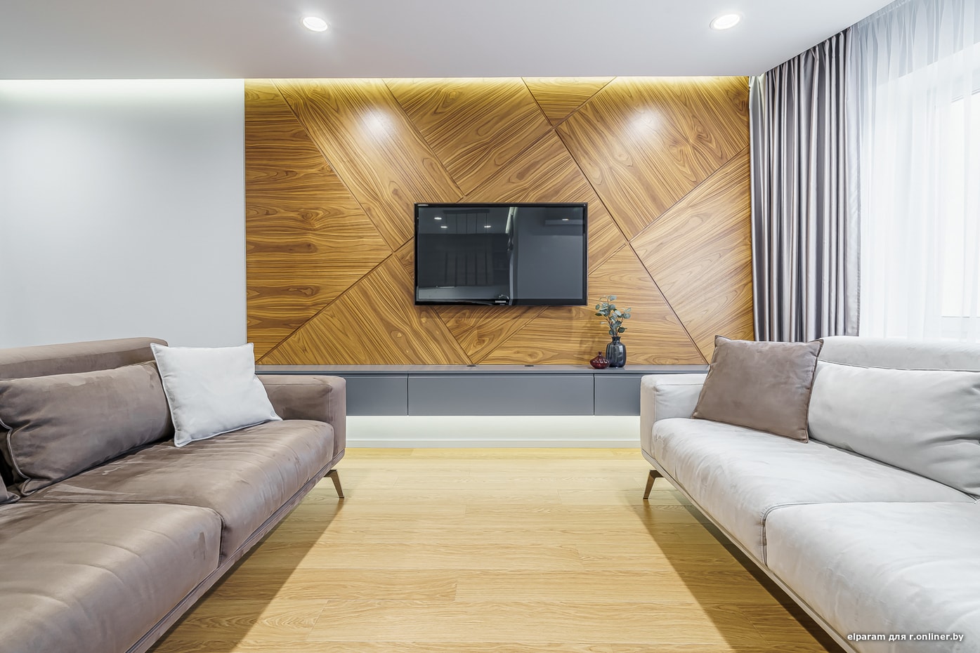 1. Гостиная, идеальная для отдыха семьи, разделена на несколько зон: