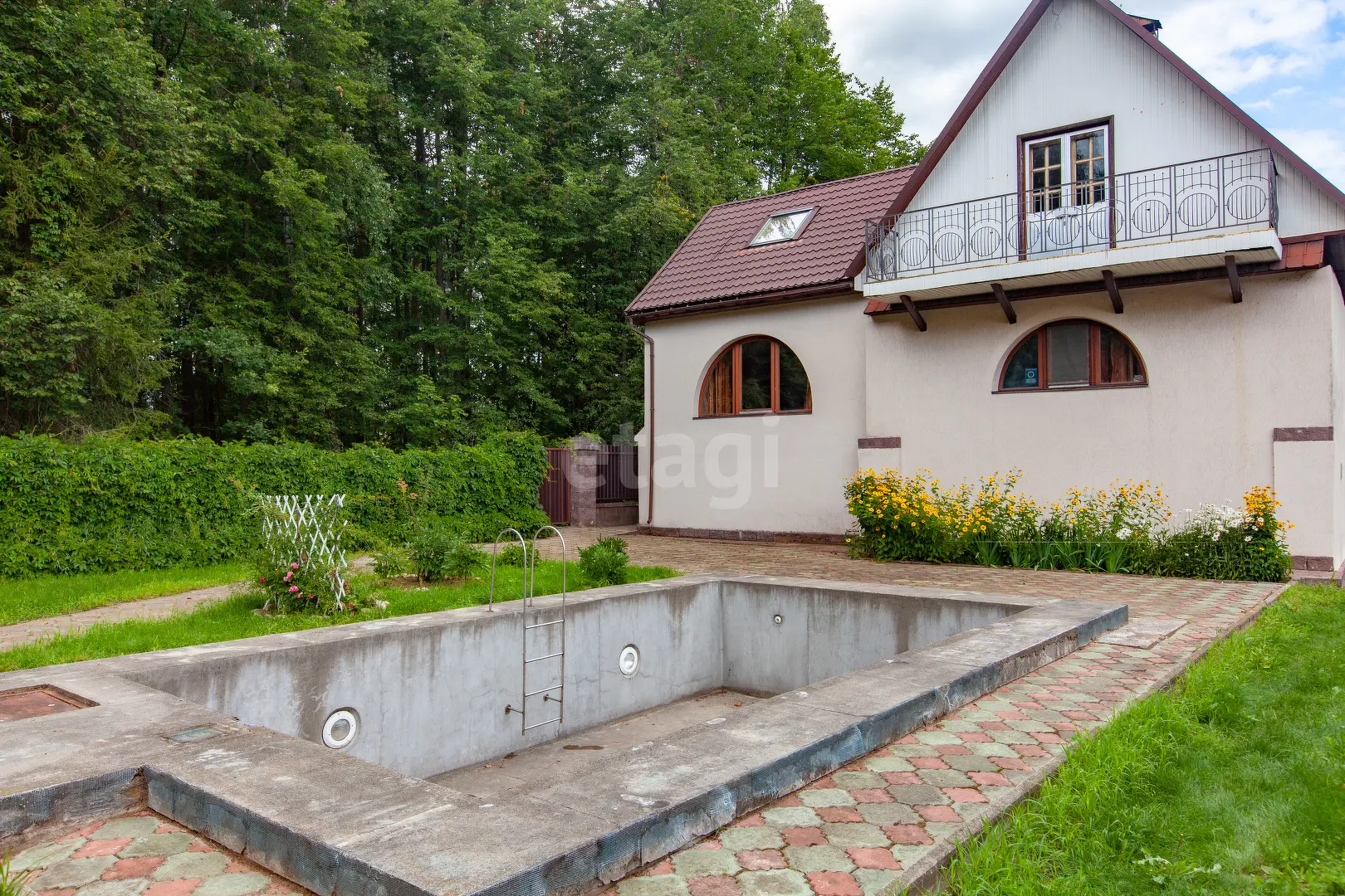 Во дворе находится бассейн.