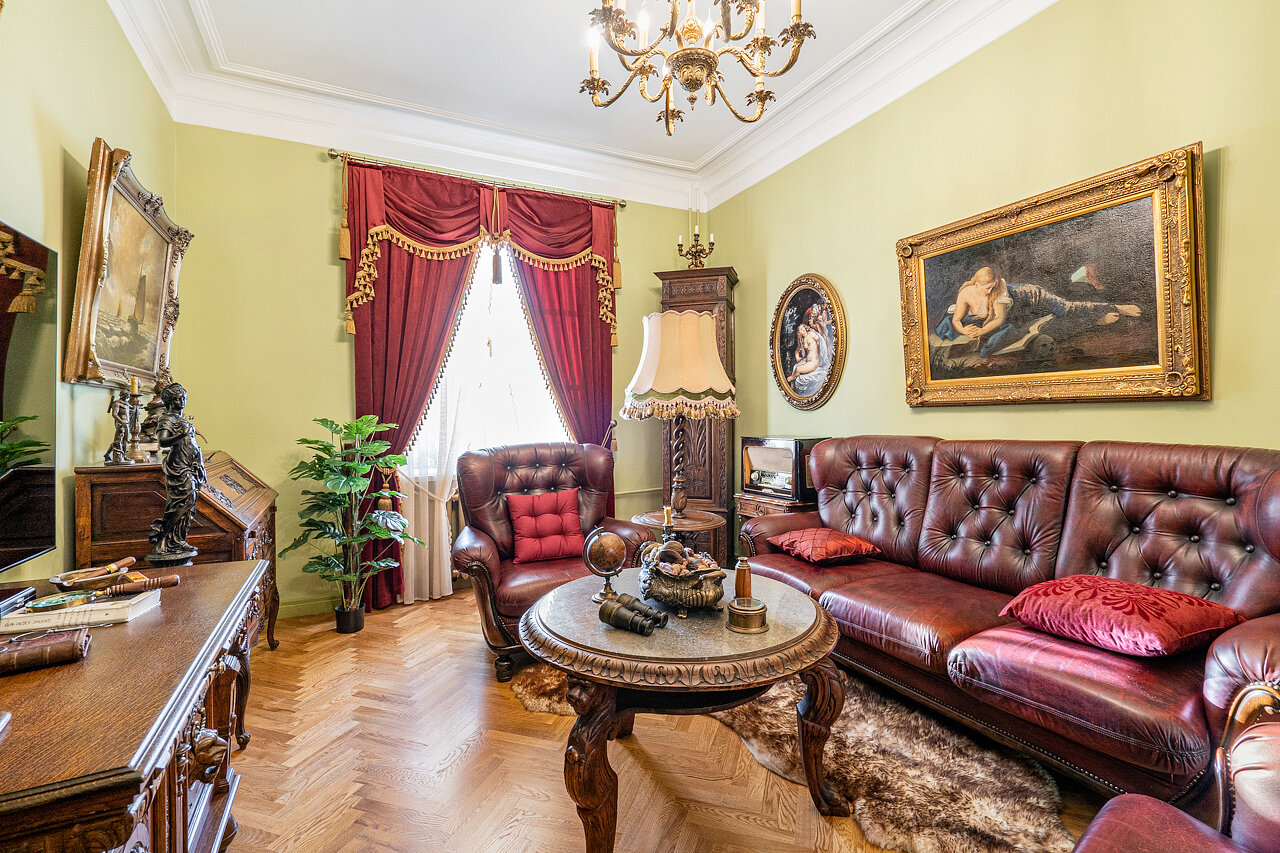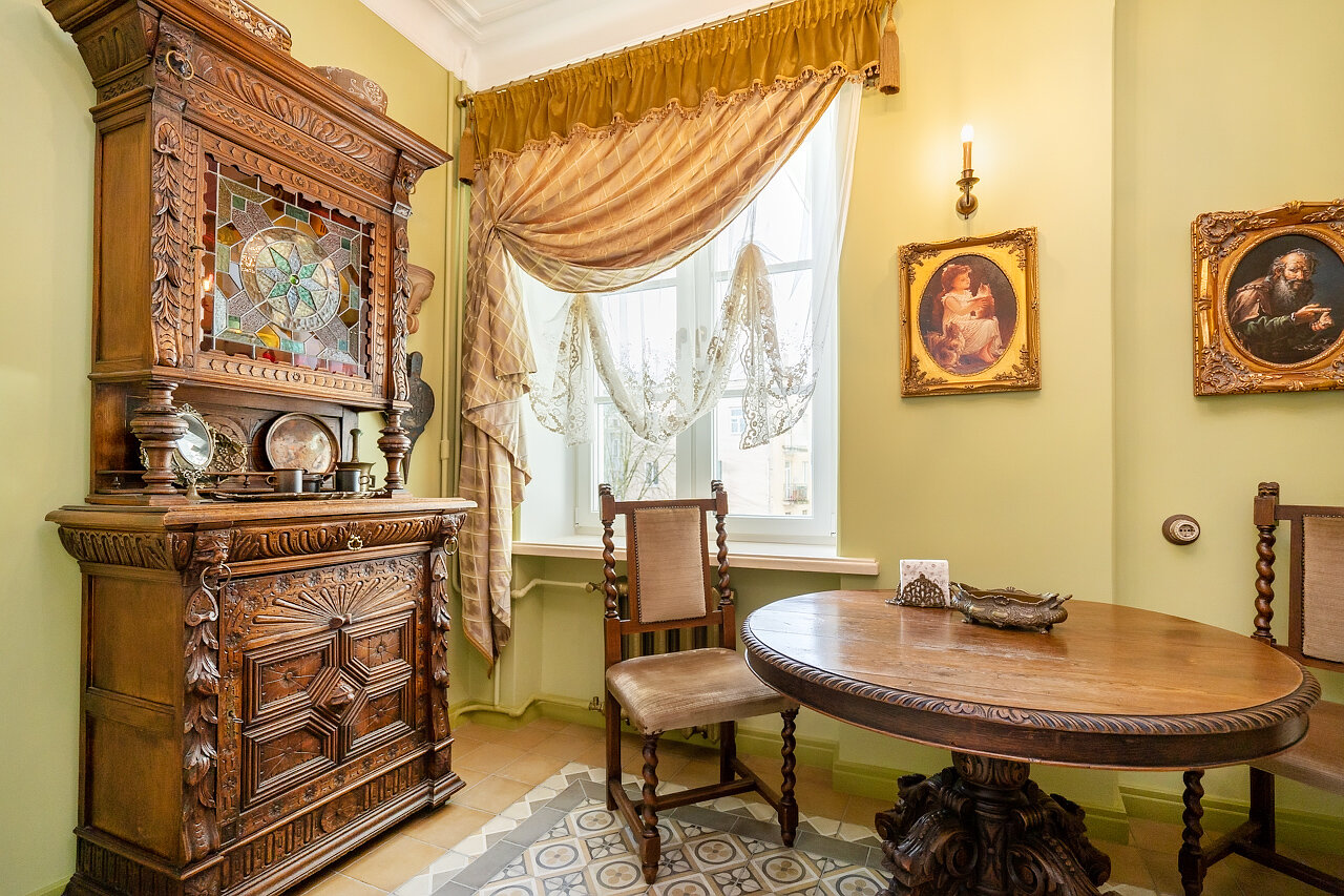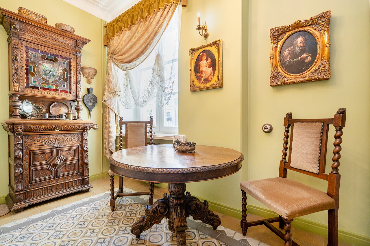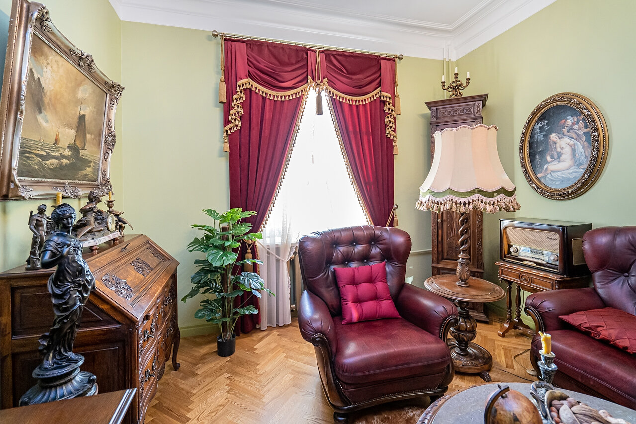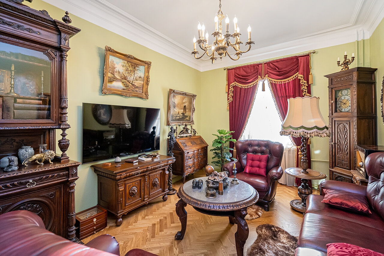 Натуральный дубовый паркет «Английская ёлка» – прочность и стильОригинальная лепнина после профессиональной реставрацииБронзовые антикварные люстры и бра – настоящий винтажШторы в стиле Викторианской эпохи создают атмосферу уюта