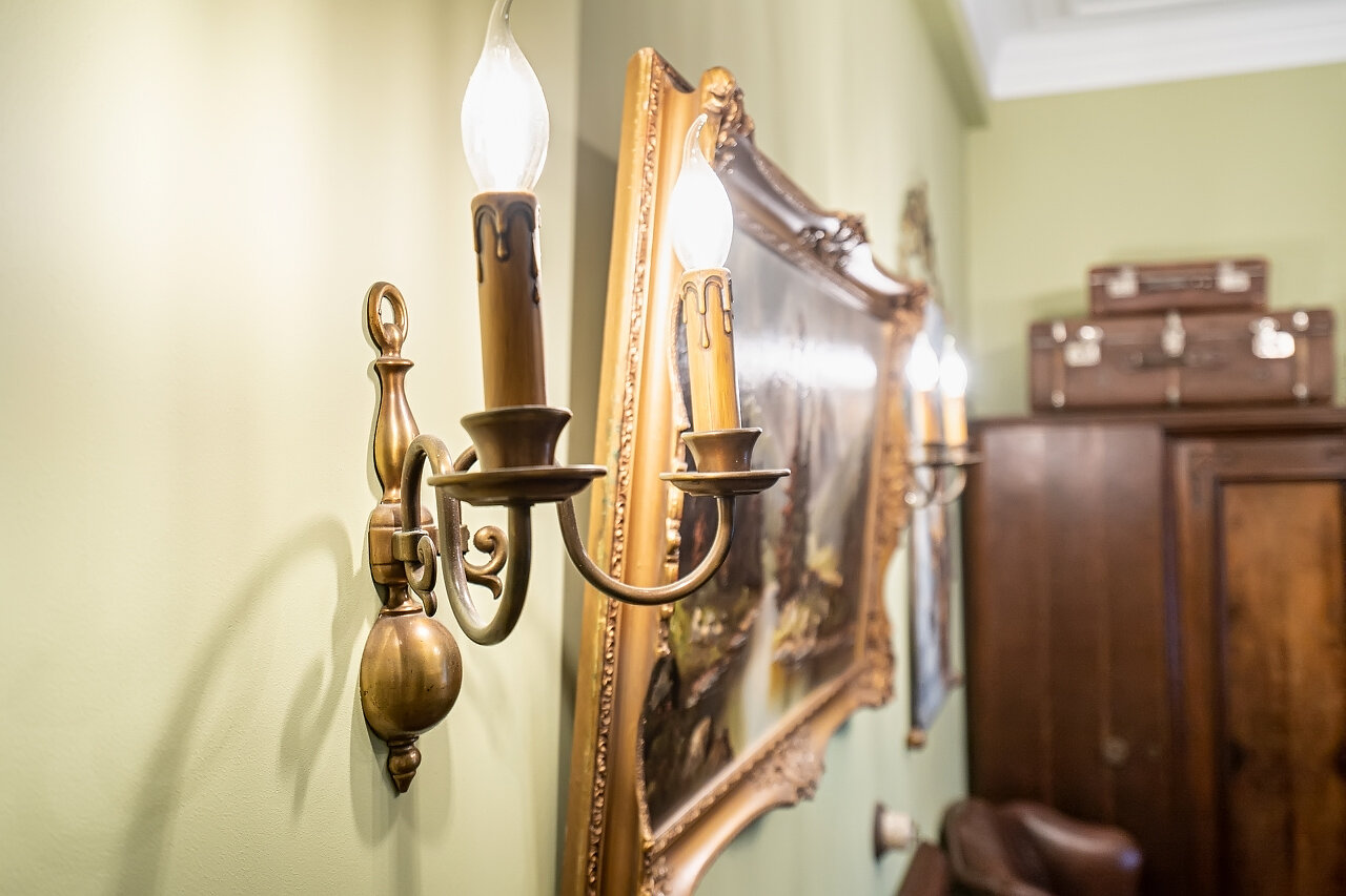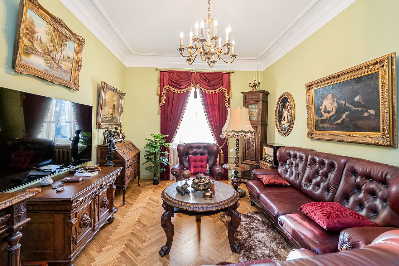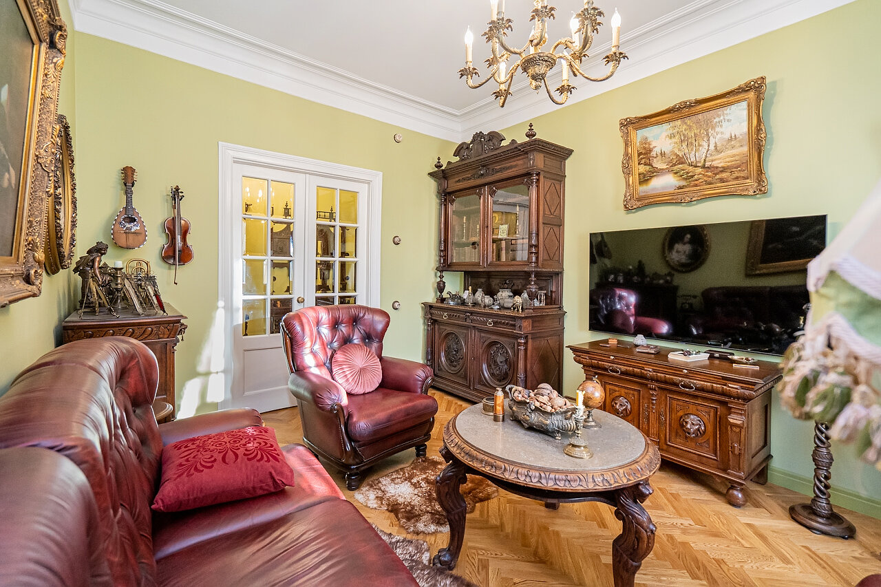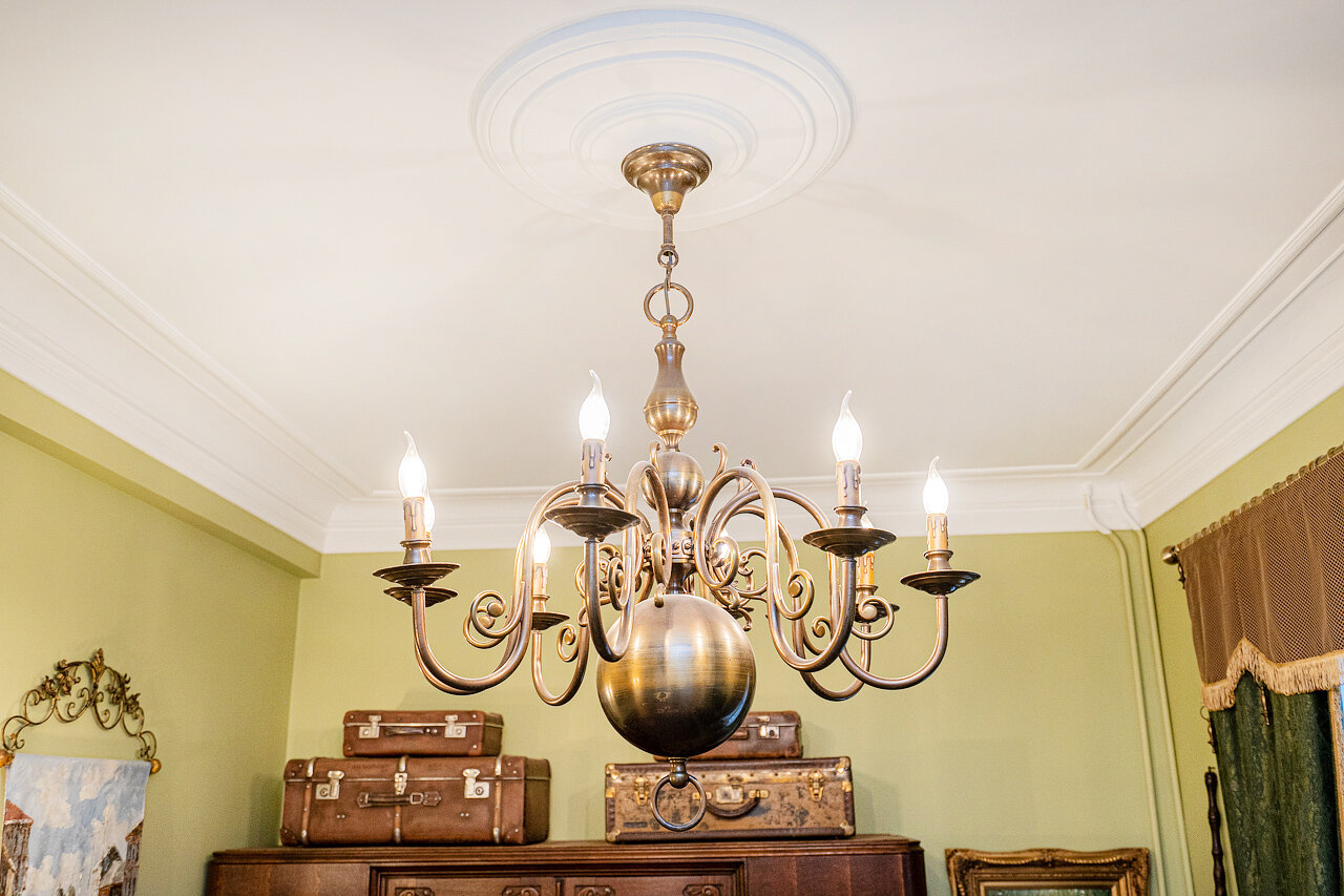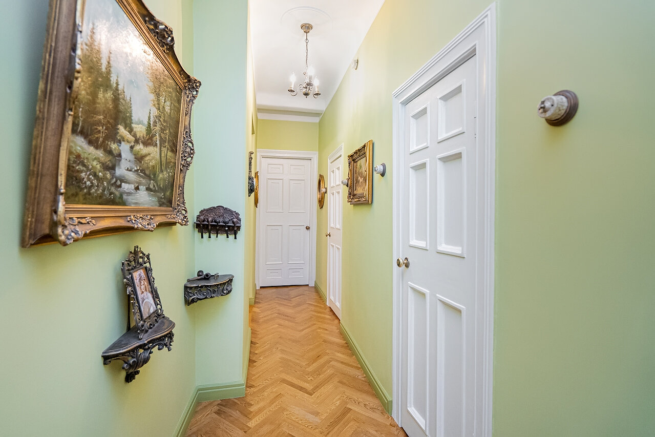 Натуральный дубовый паркет «Английская ёлка» – прочность и стильОригинальная лепнина после профессиональной реставрацииБронзовые антикварные люстры и бра – настоящий винтажШторы в стиле Викторианской эпохи создают атмосферу уюта