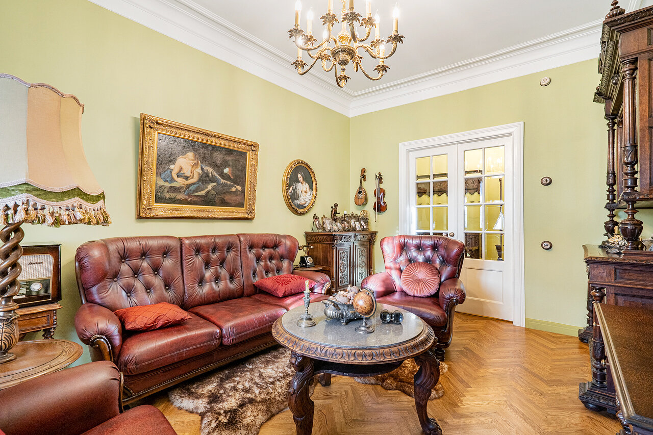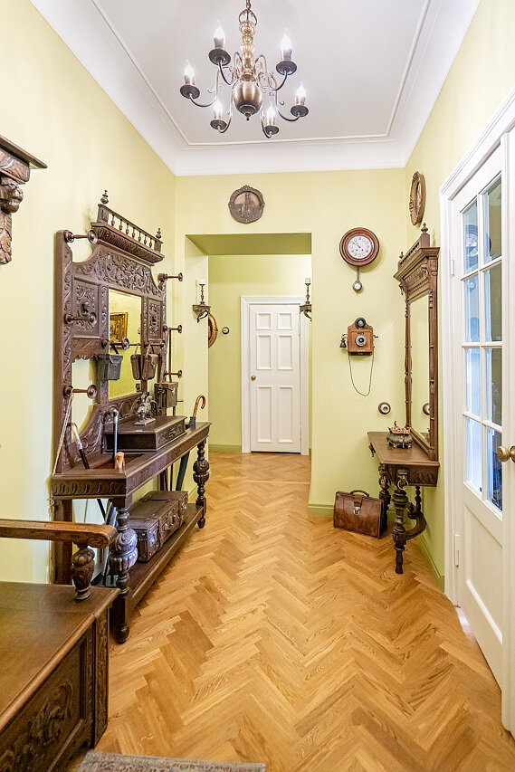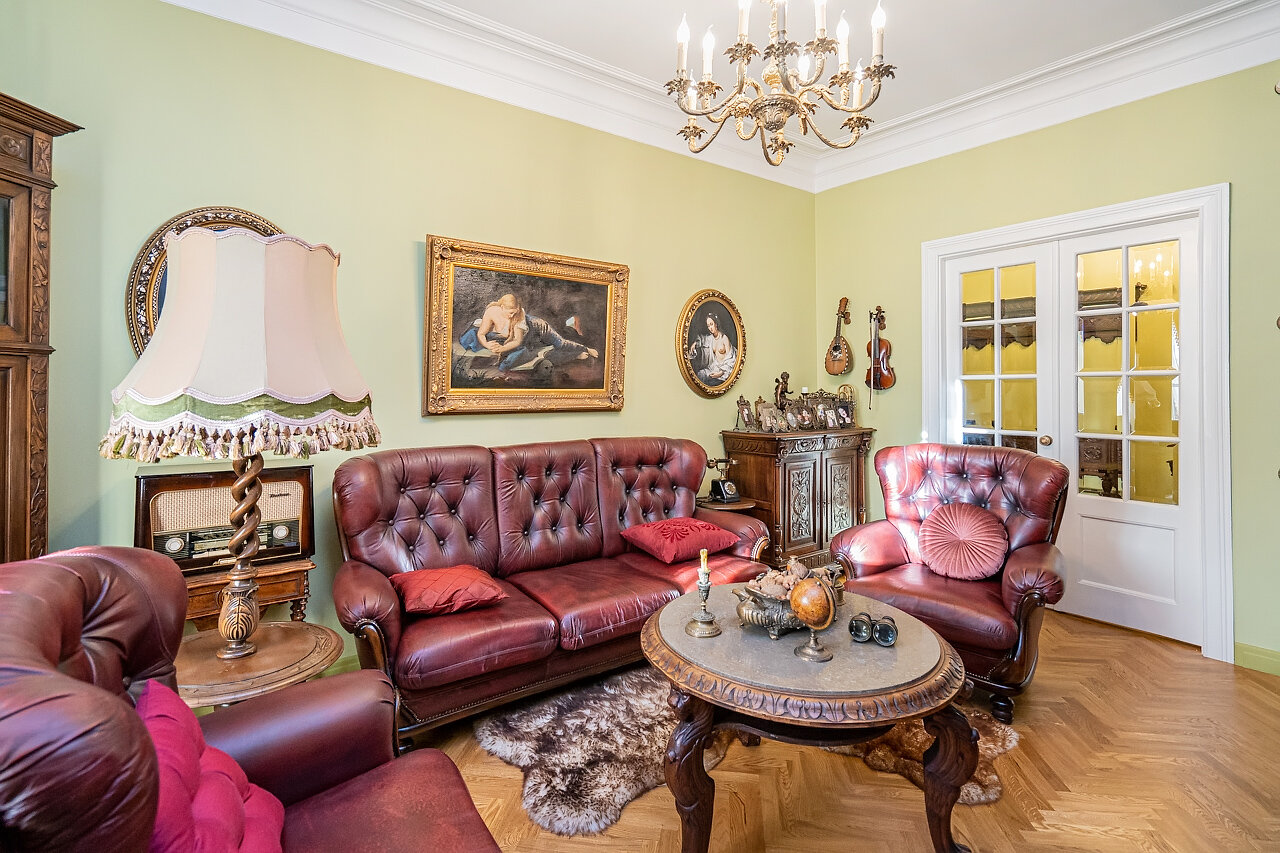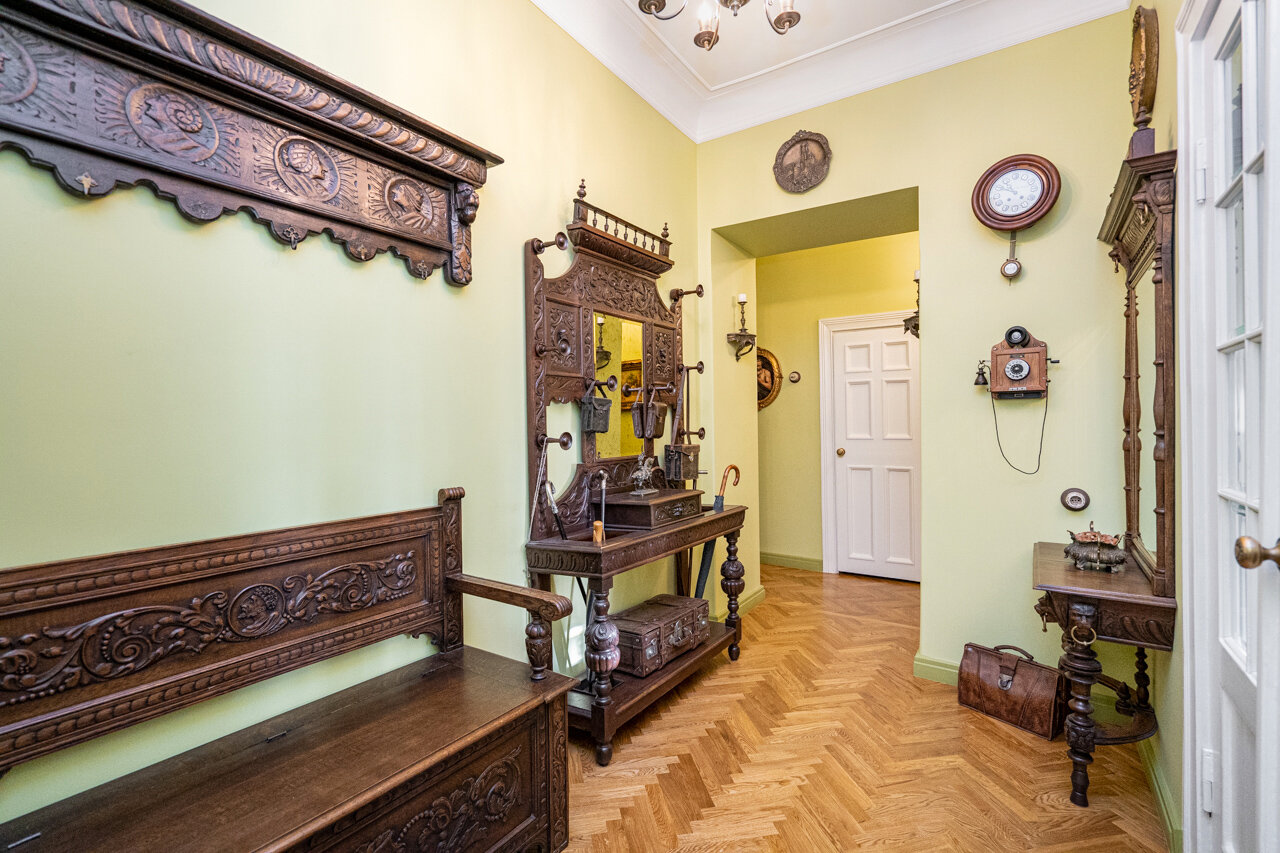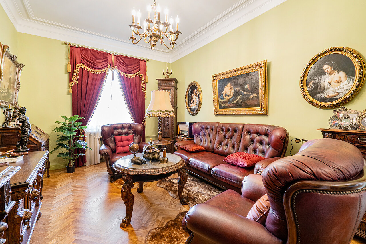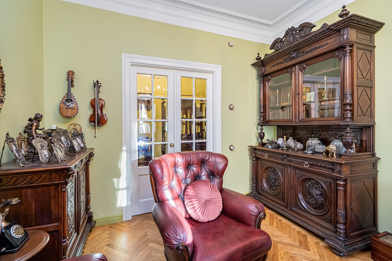 Натуральный дубовый паркет «Английская ёлка» – прочность и стильОригинальная лепнина после профессиональной реставрацииБронзовые антикварные люстры и бра – настоящий винтажШторы в стиле Викторианской эпохи создают атмосферу уюта