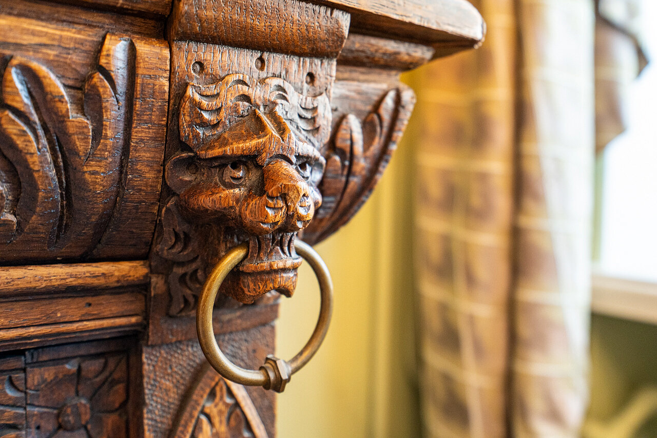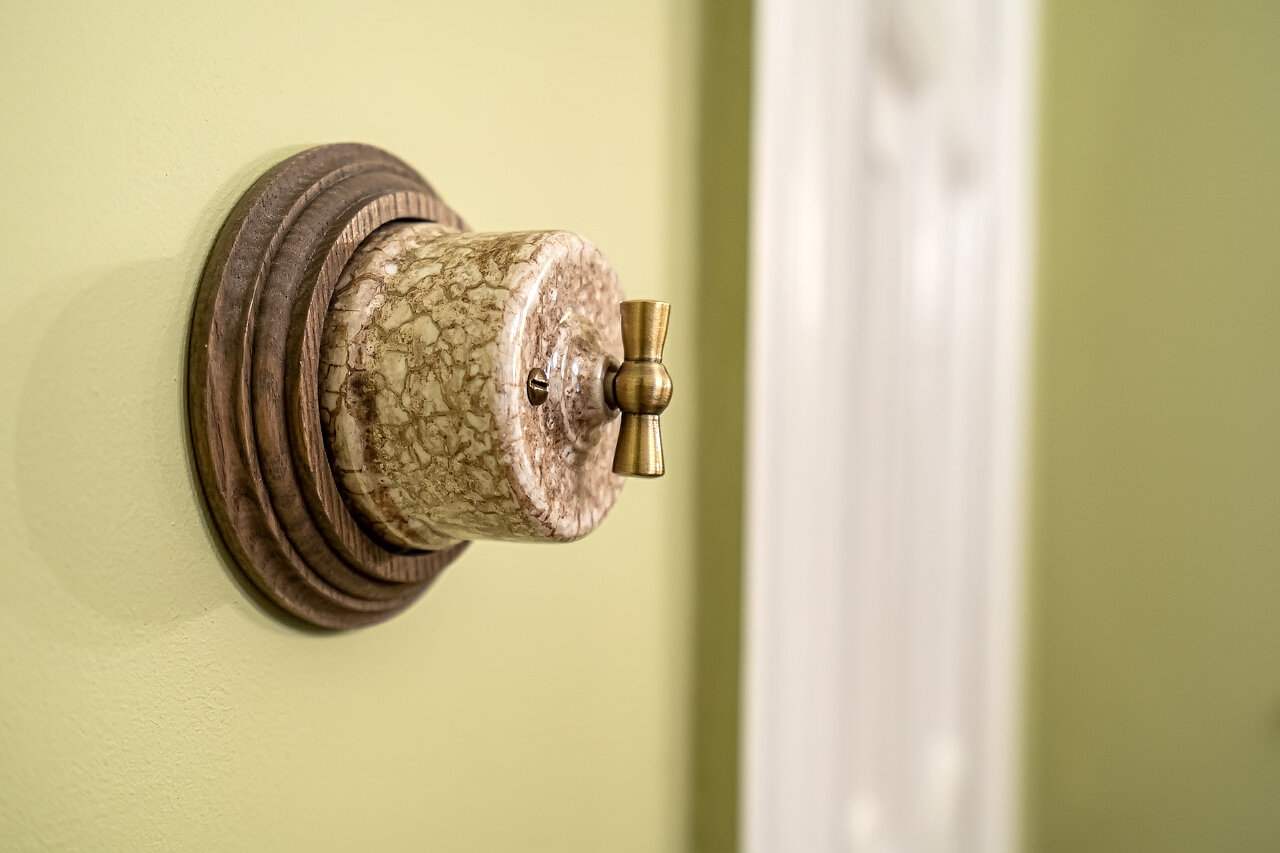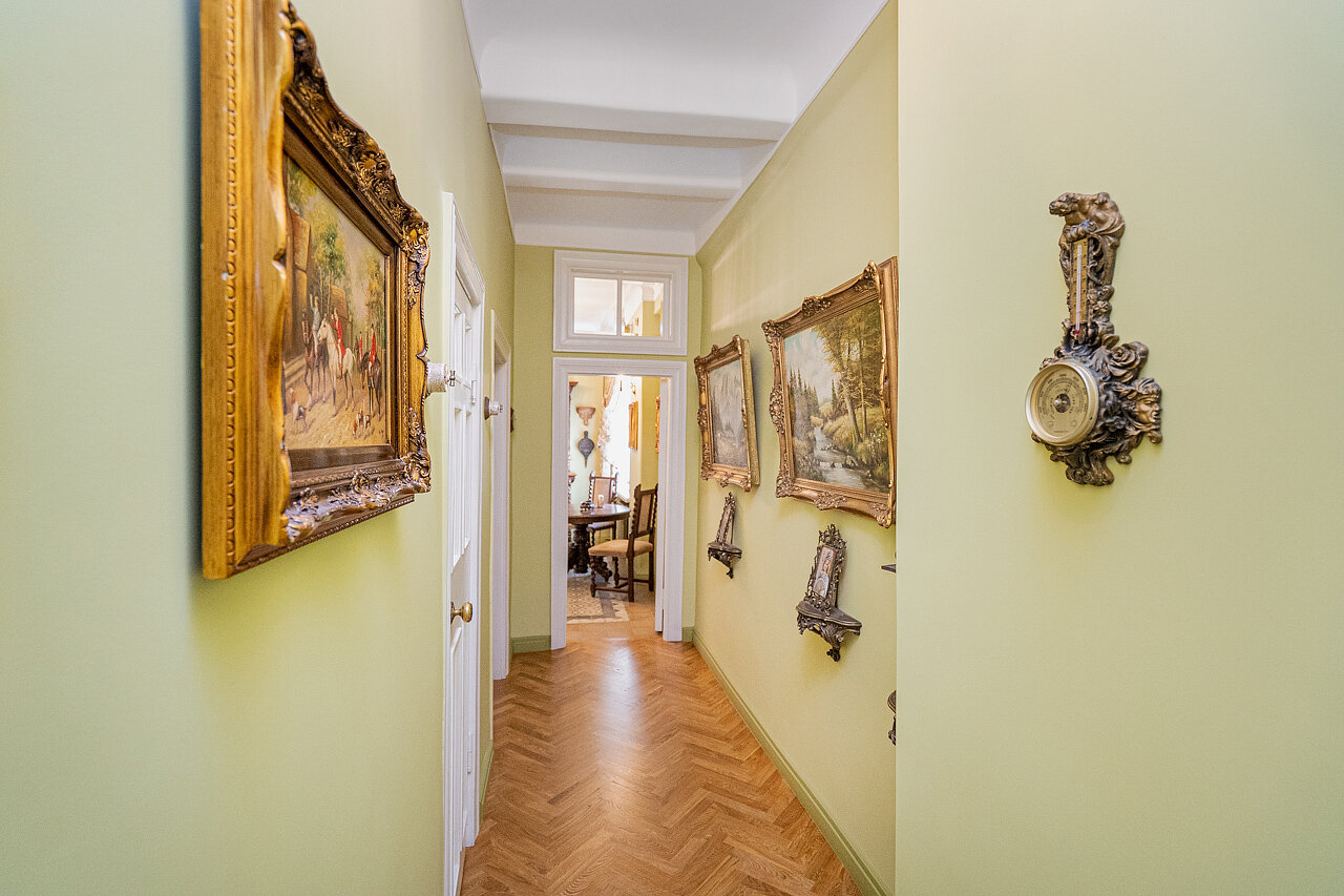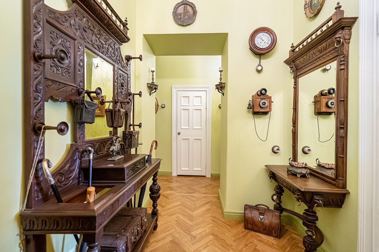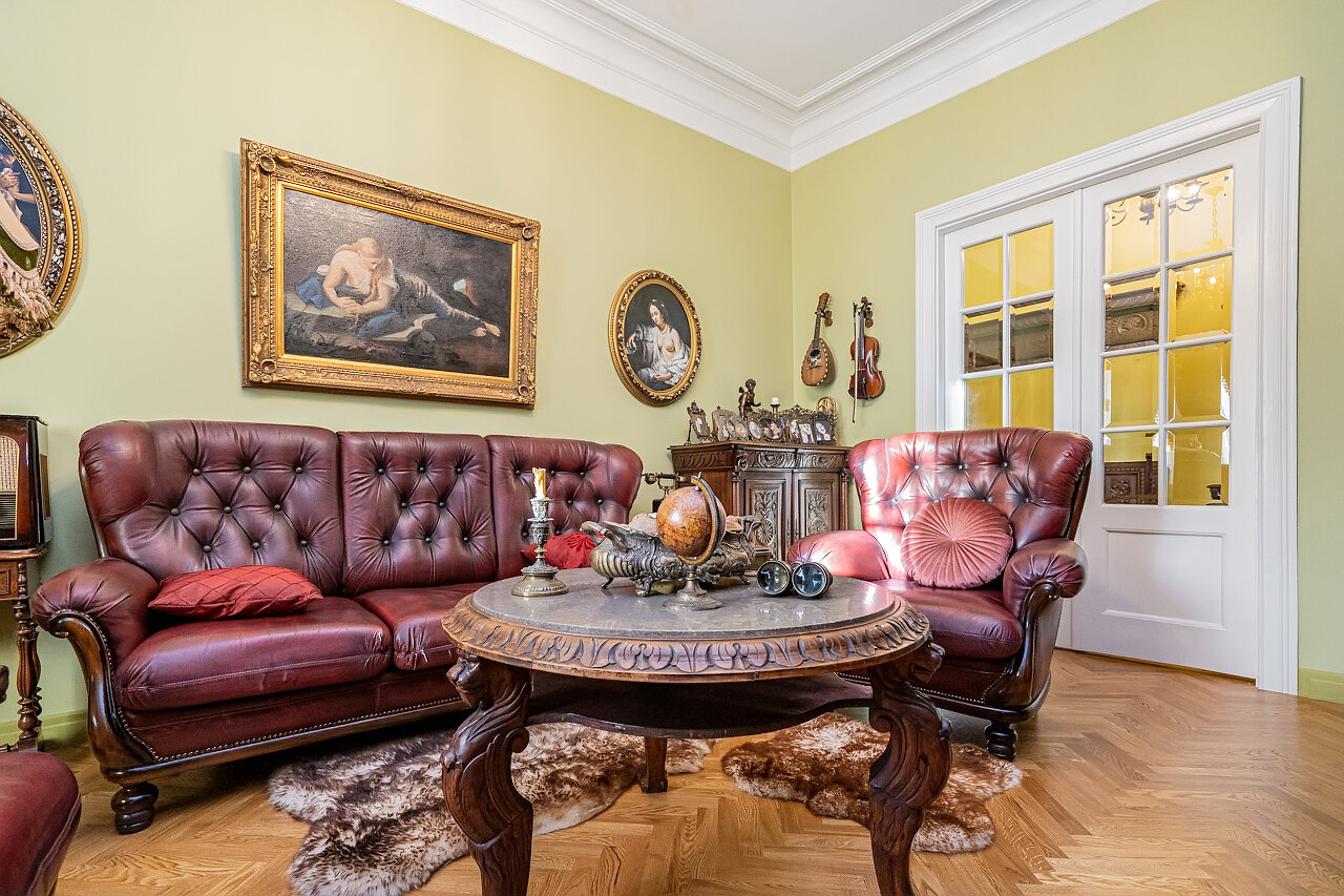 Натуральный дубовый паркет «Английская ёлка» – прочность и стильОригинальная лепнина после профессиональной реставрацииБронзовые антикварные люстры и бра – настоящий винтажШторы в стиле Викторианской эпохи создают атмосферу уюта