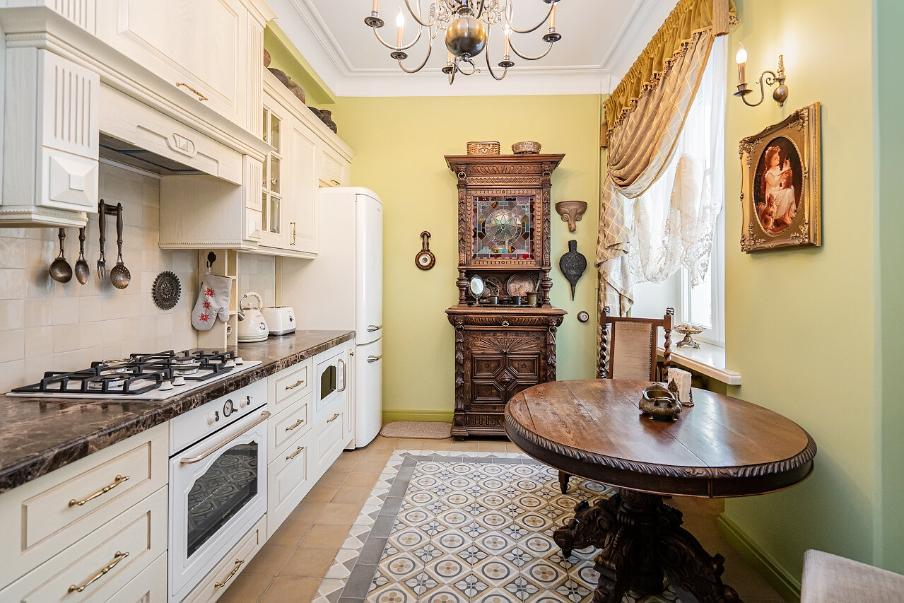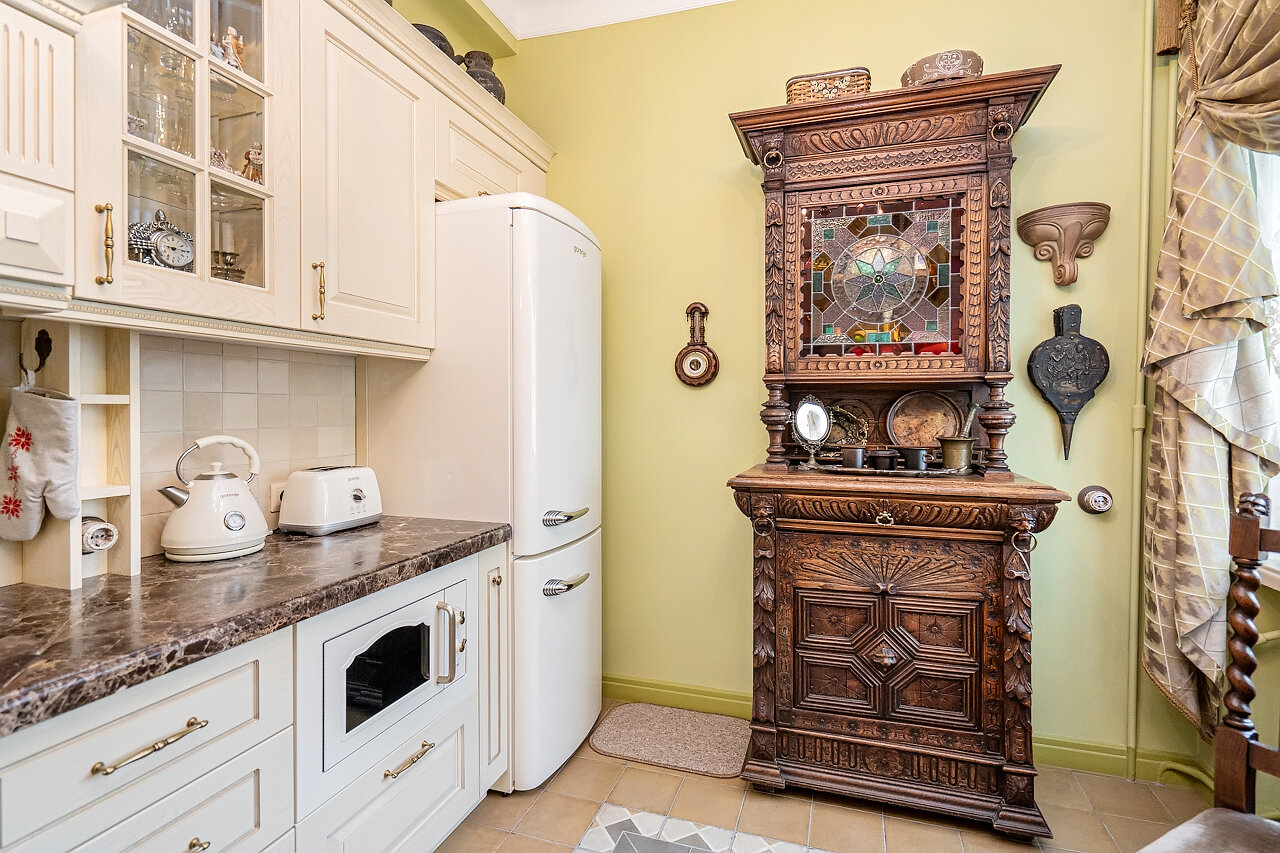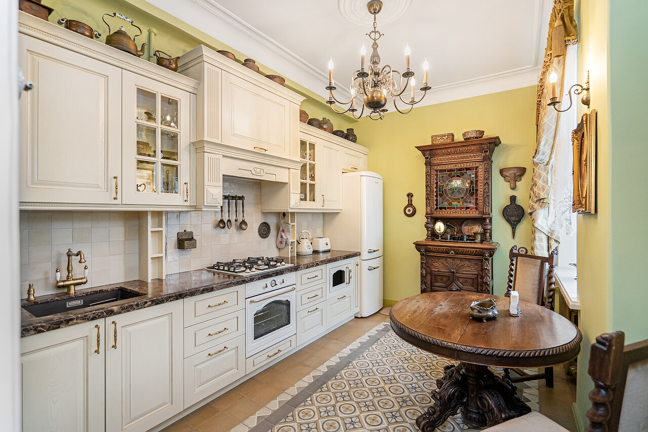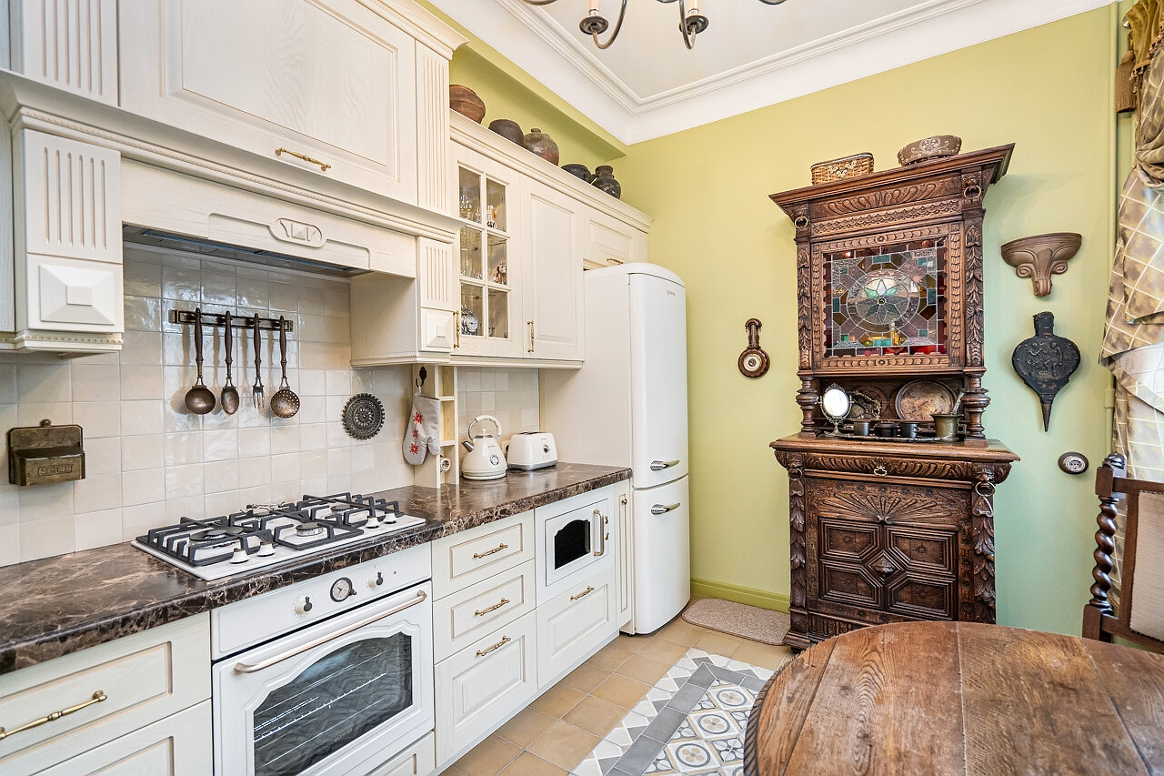 Кухня – воплощение изысканности:Выполнена из массива дуба, выдержана в ретро-стилеМраморная столешница – элегантность и долговечностьРетро-бытовая техника + мойка Blanco (Германия)Фильтр питьевой воды + система умягчения воды