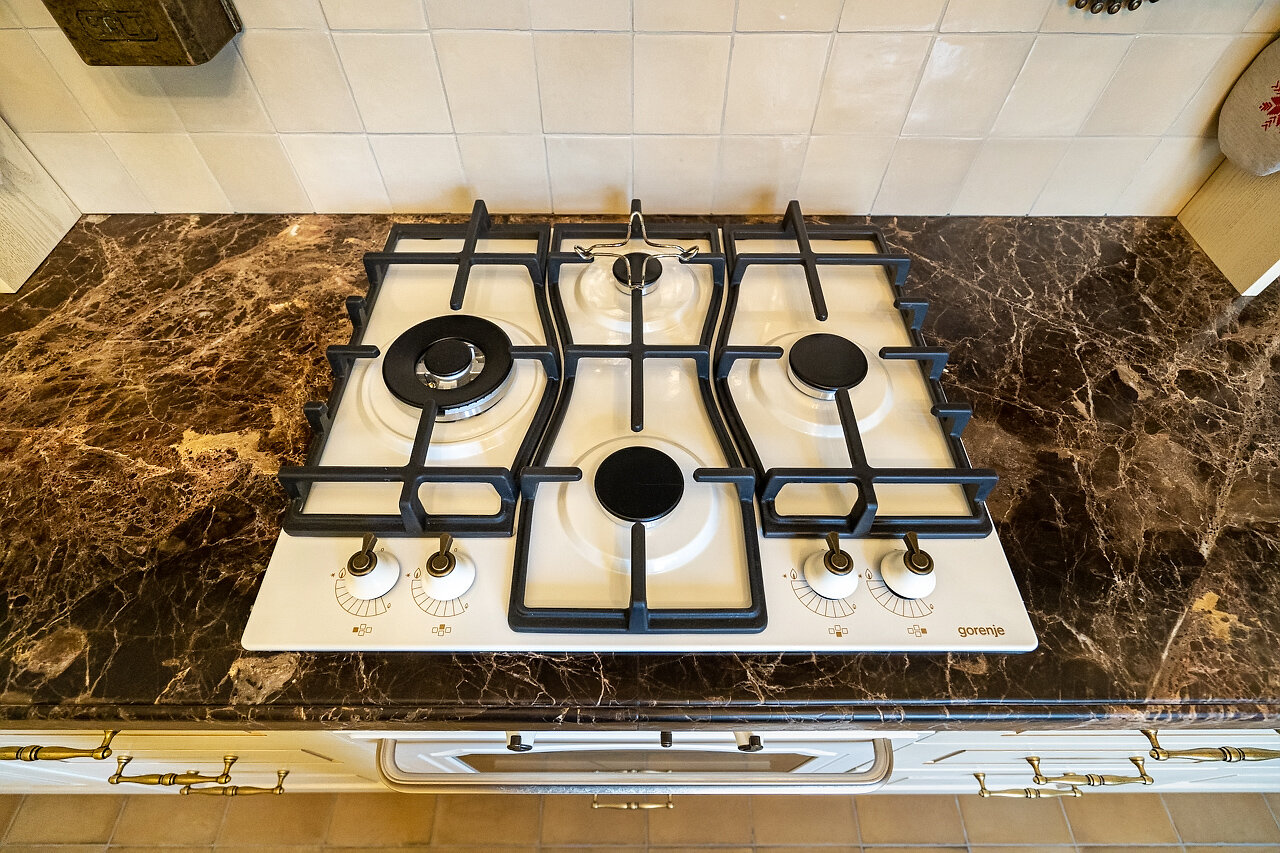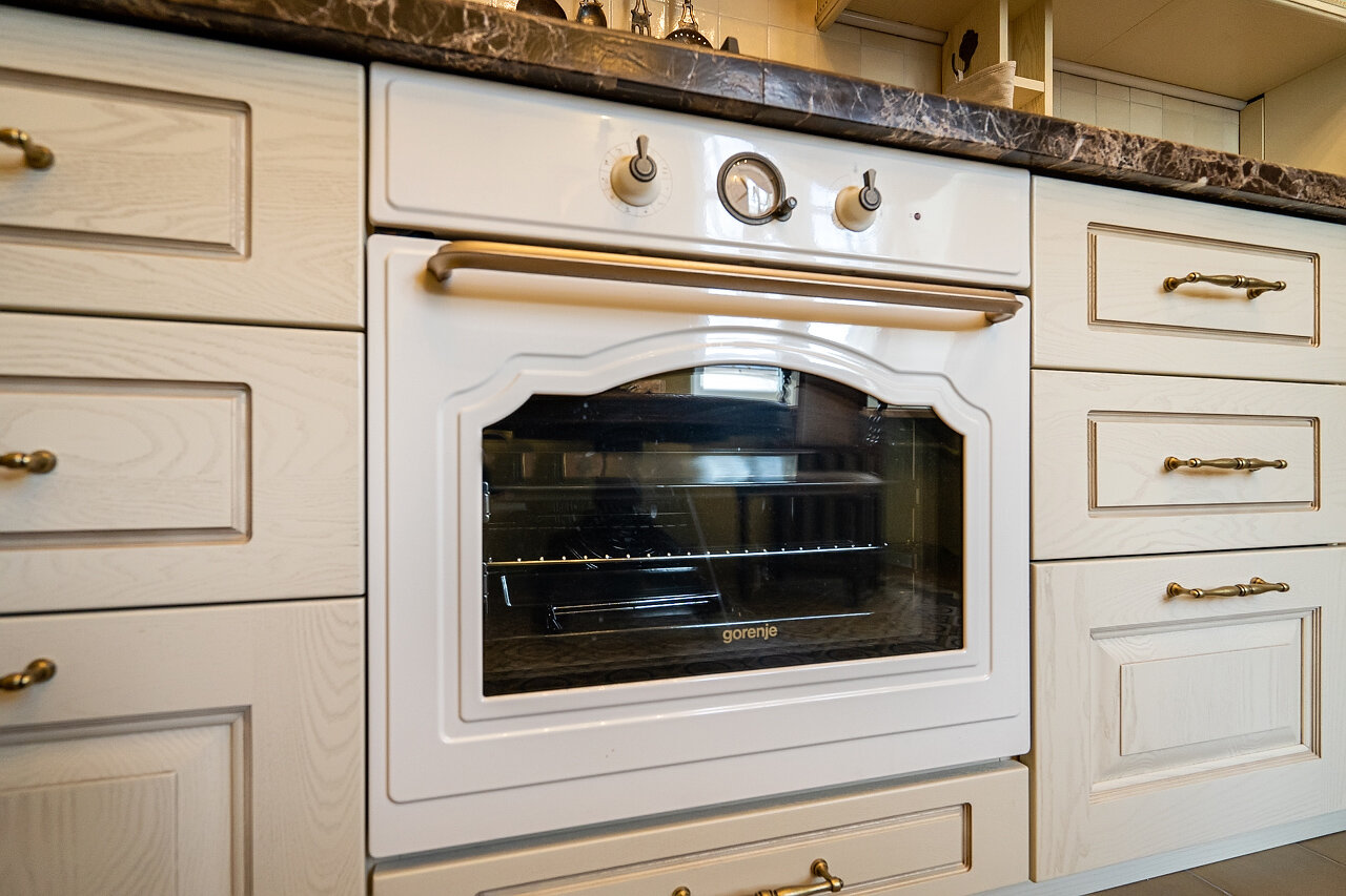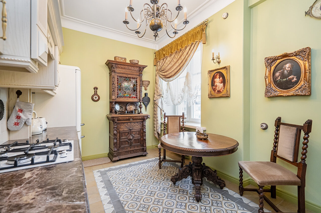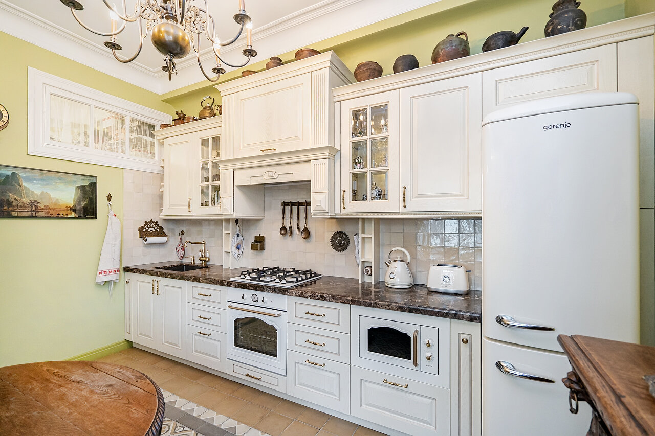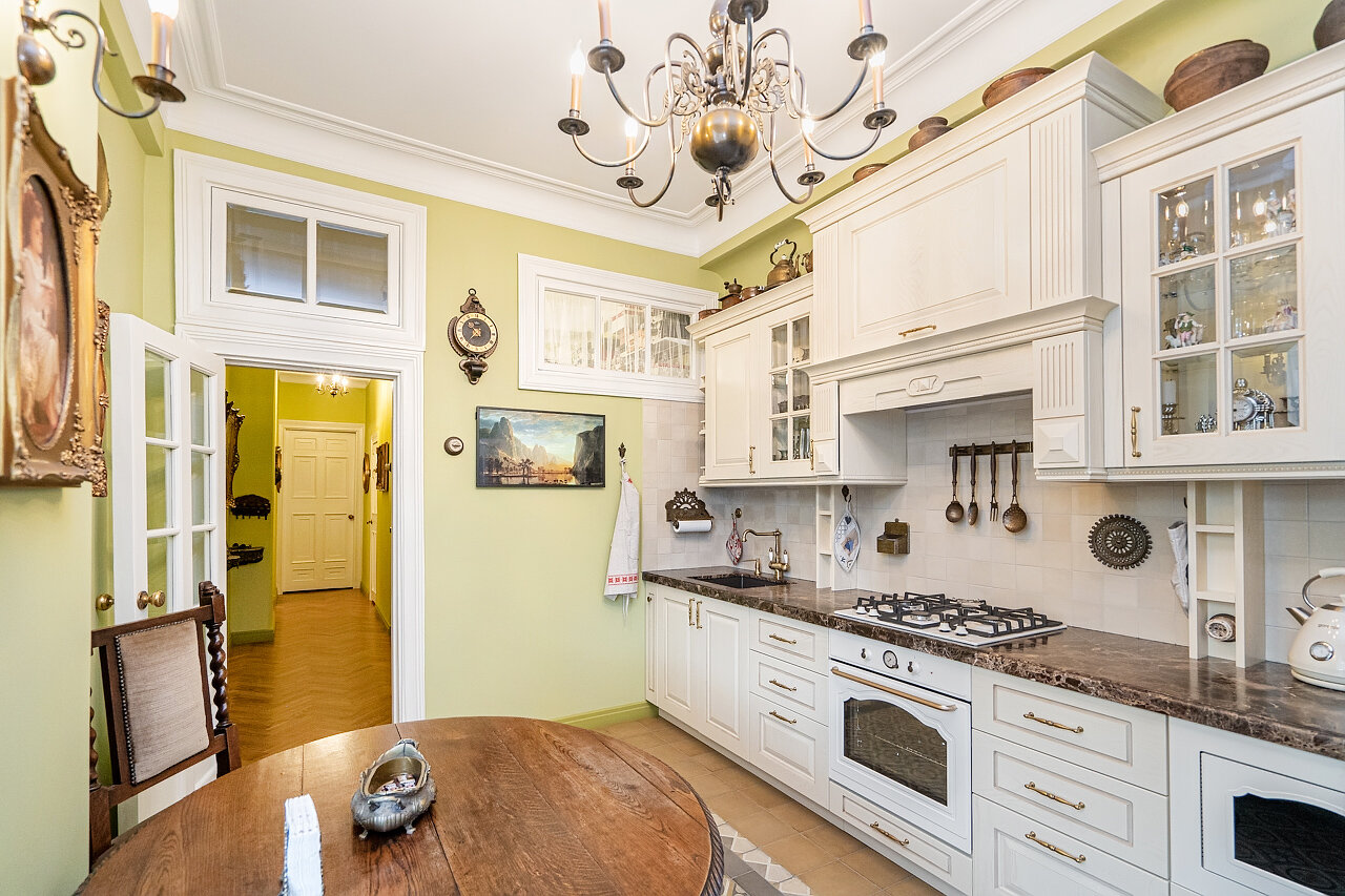 Кухня – воплощение изысканности:Выполнена из массива дуба, выдержана в ретро-стилеМраморная столешница – элегантность и долговечностьРетро-бытовая техника + мойка Blanco (Германия)Фильтр питьевой воды + система умягчения воды