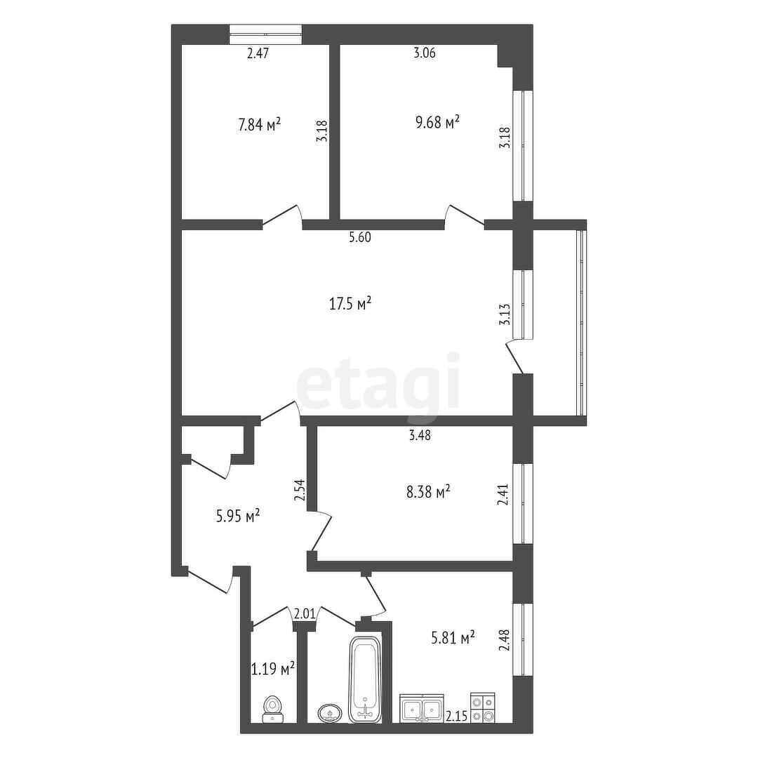 Комнаты и коридор оборудованы вместительными встроенными шкафами.