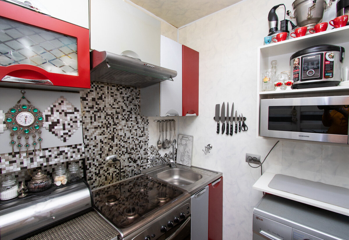 Кухня оборудована газовой плитой, кухонной мебелью, бытовой техникой.