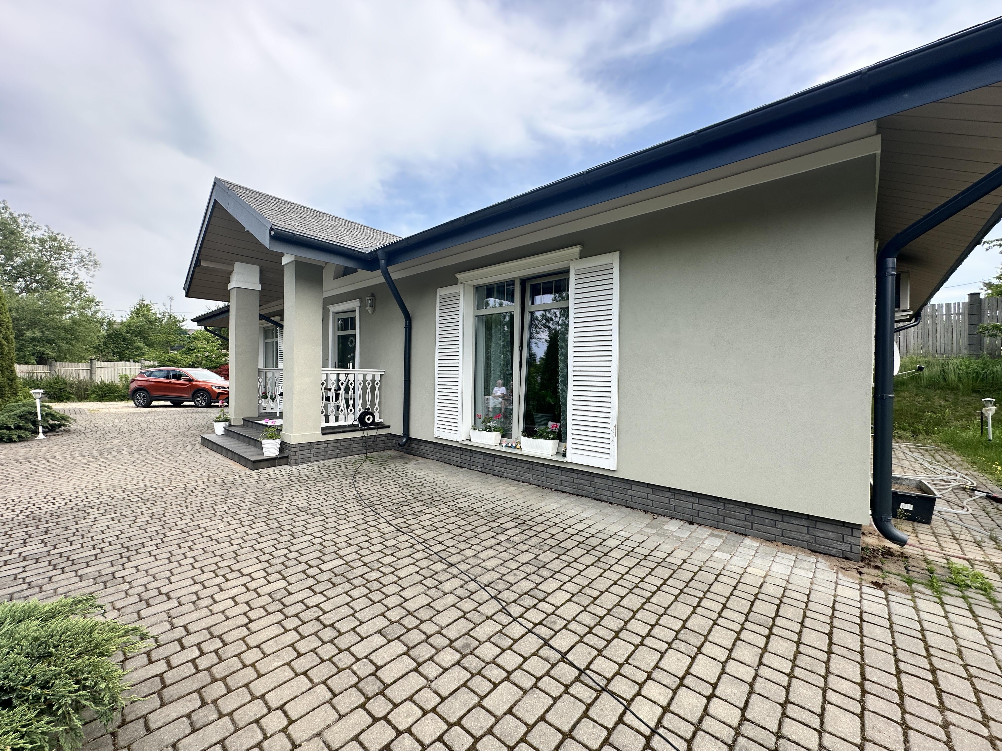 Дом в одном уровне. Современная и удобная планировка: просторная кухня, гостиная, 1 спальня, санузел, ванная комната, гараж.
