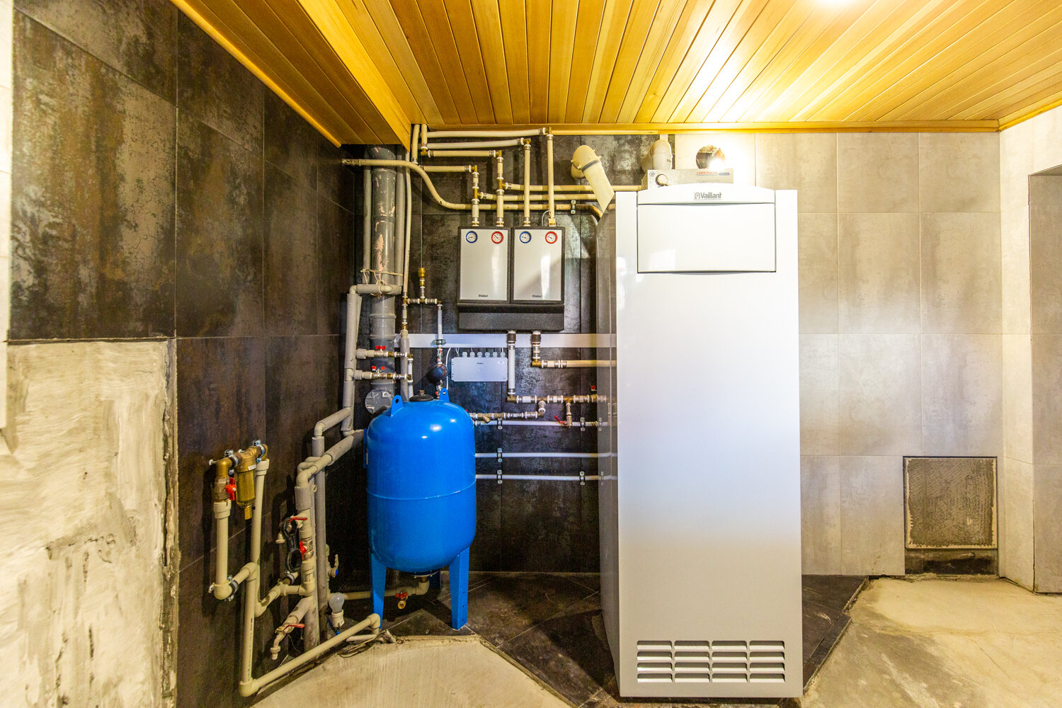 В доме подключены и функционируют все необходимые коммуникации: вода – скважина глубиной 36 метров, электричество, газ, канализация в несколько ступеней. Регулируемую систему отопления обеспечивает газовый котел Vaillant turboVIT последнего поколения с компьютером.