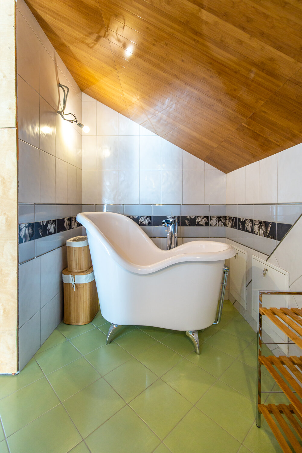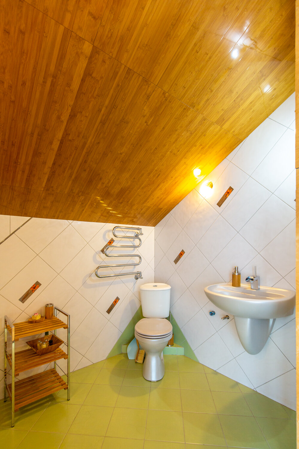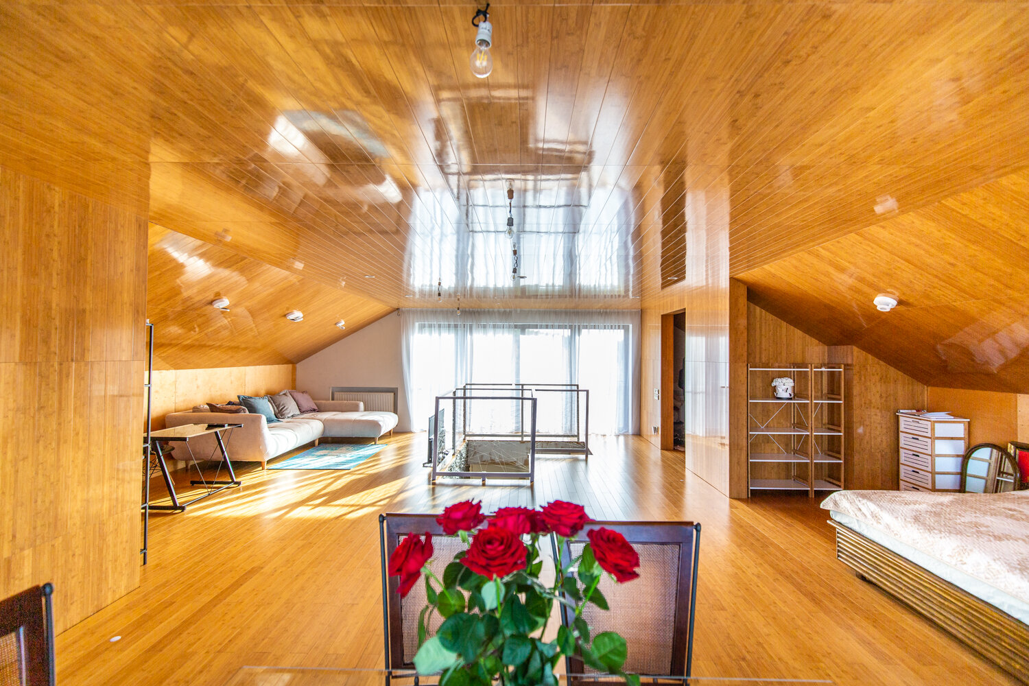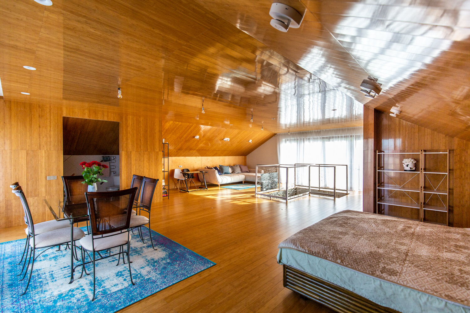 Полностью готов к жизни и оборудован всем необходимым просторный мансардный этаж. Внутренняя отделка мансардного этажа – высококачественный массив бамбука (стены, полы и даже потолки), итальянская коллекционная плитка и сантехника в санузле.