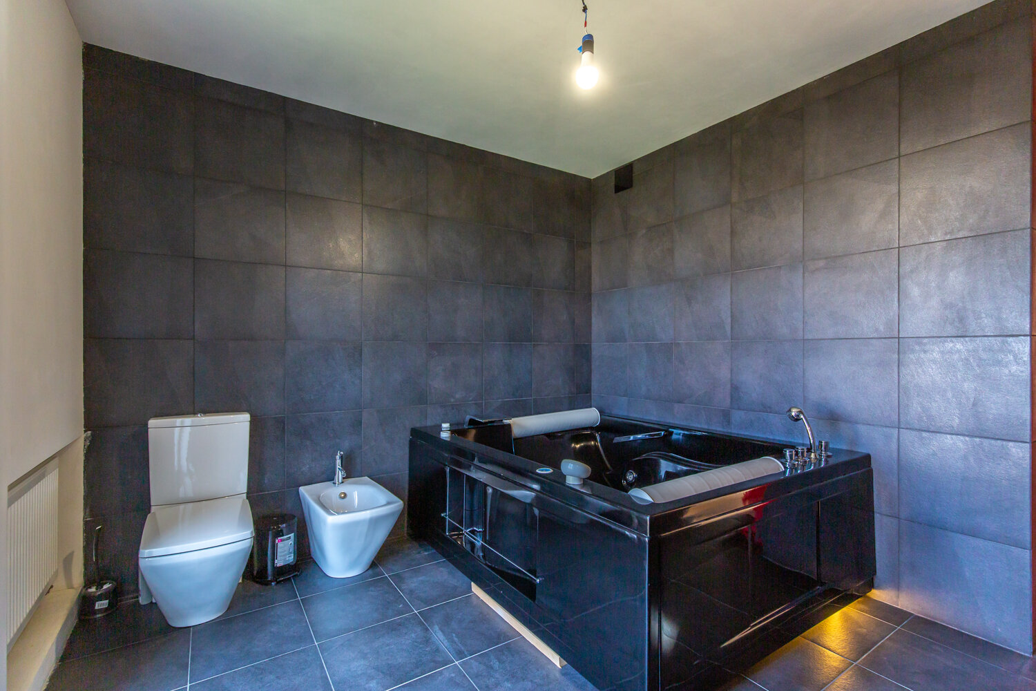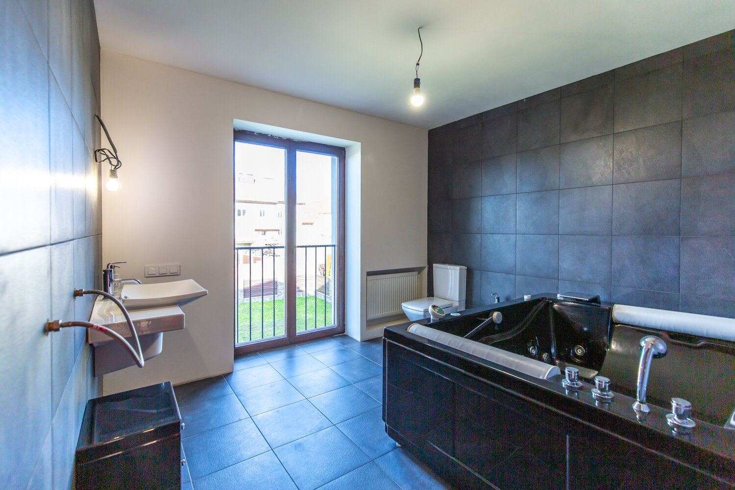 Второй жилой этаж состоит из трёх комнат и оборудованного санузла. С/у второго этажа выполнен в стильной чёрно-белой гамме и оборудован французской сантехникой и впечатляющей воображение итальянской двухместной ванной с гидро-аэромассажем, системой дезинфекции, хромотерапией и подсветкой.