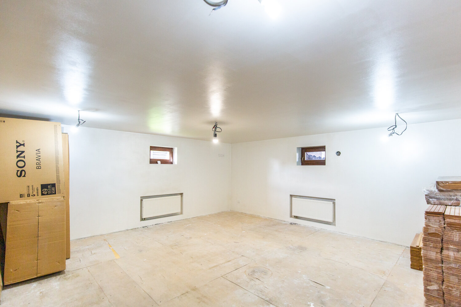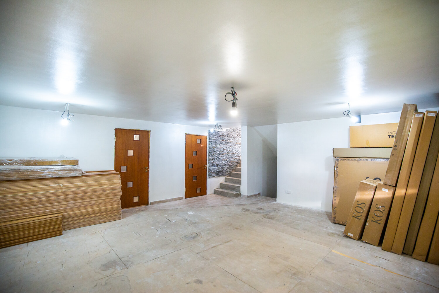 Полноценный высокий цокольный этаж содержит: подсобные помещения для хранения, топочную, гараж. Из цокольного этажа есть выход на участок.