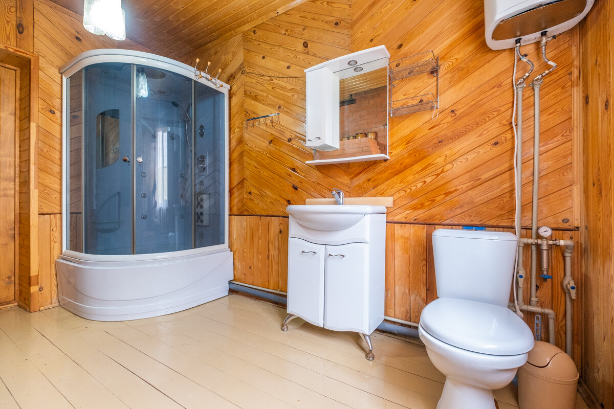- На 1-ом этаже расположены: большая кухня 15.1 м2. Две просторные комнаты (17,3 и 11,2м2), совмещённый санузел (7м2) с душевой кабиной, бойлером.