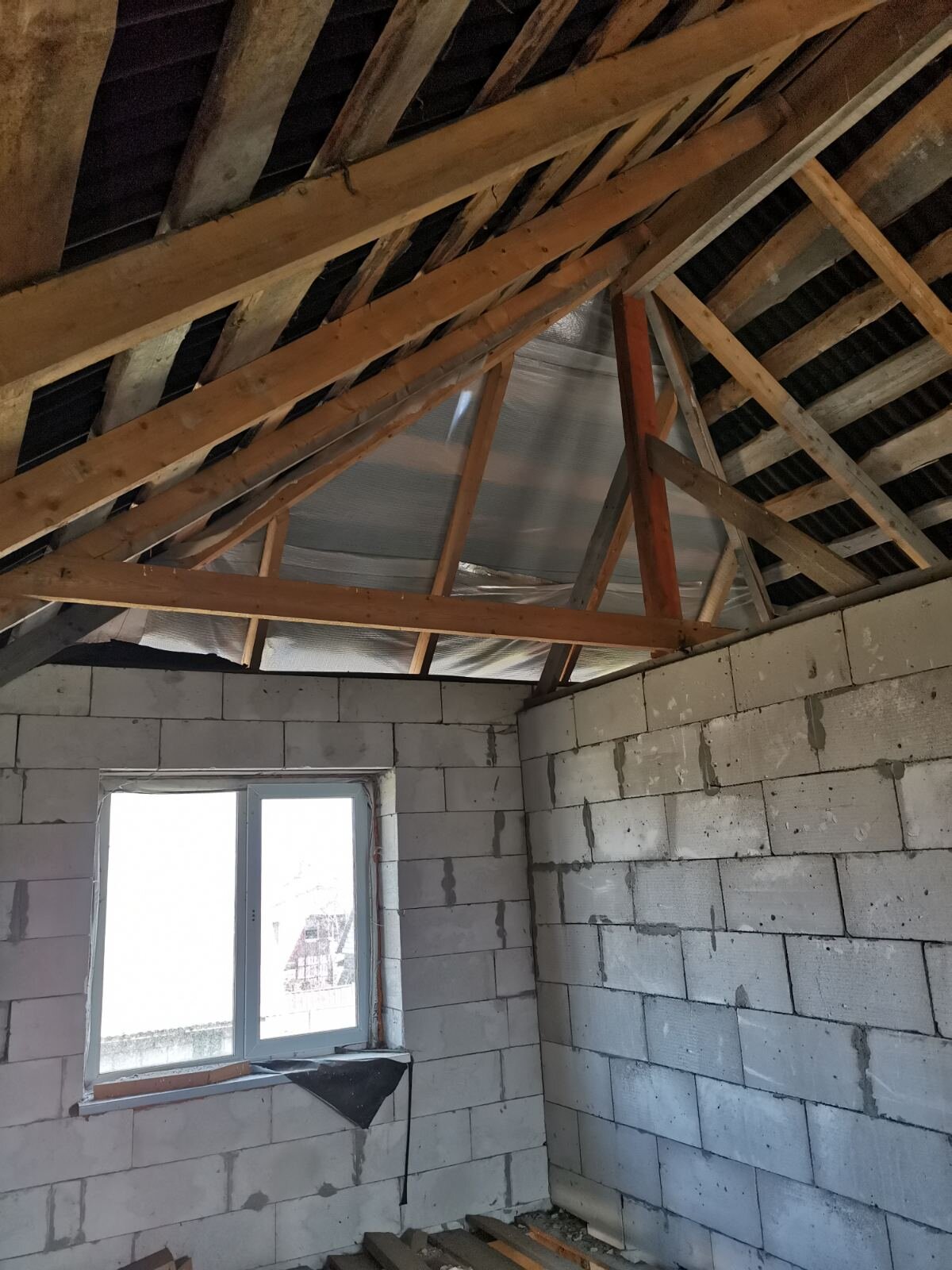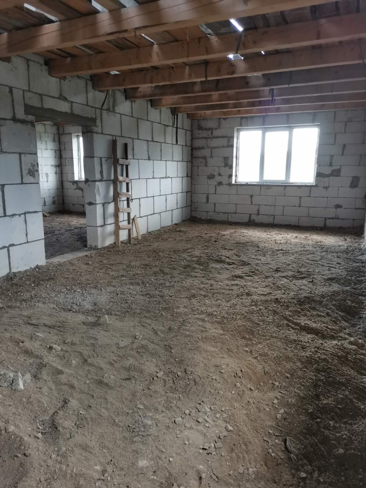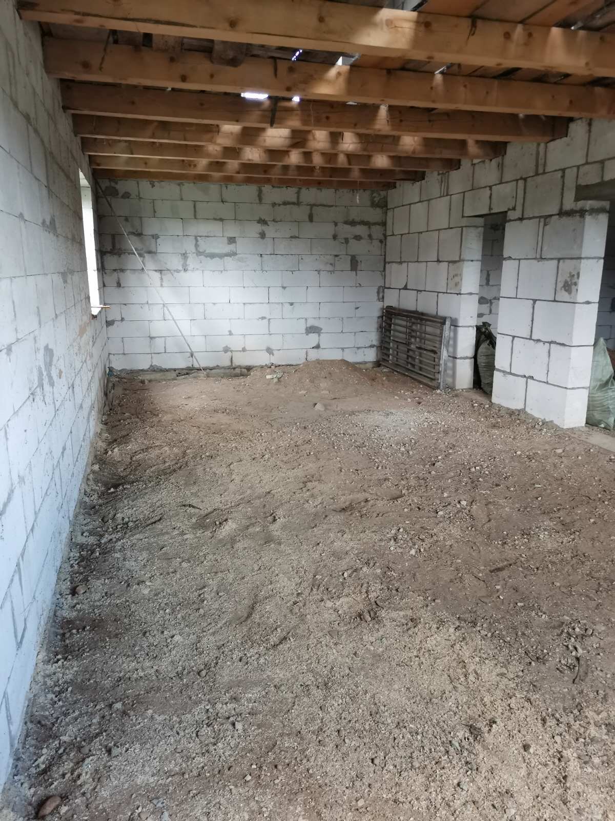 Материал стен - газосиликатные блоки, перекрытия - деревянные балки, крыша - ондулин. Большой мансардный этаж.