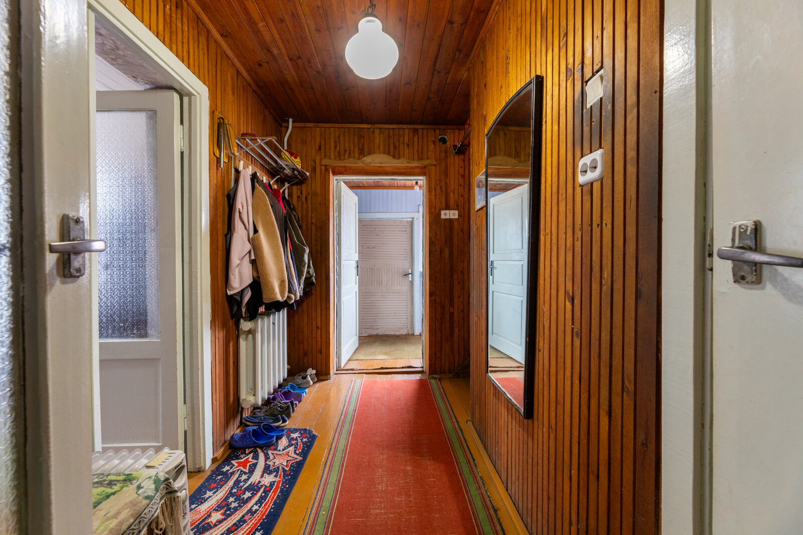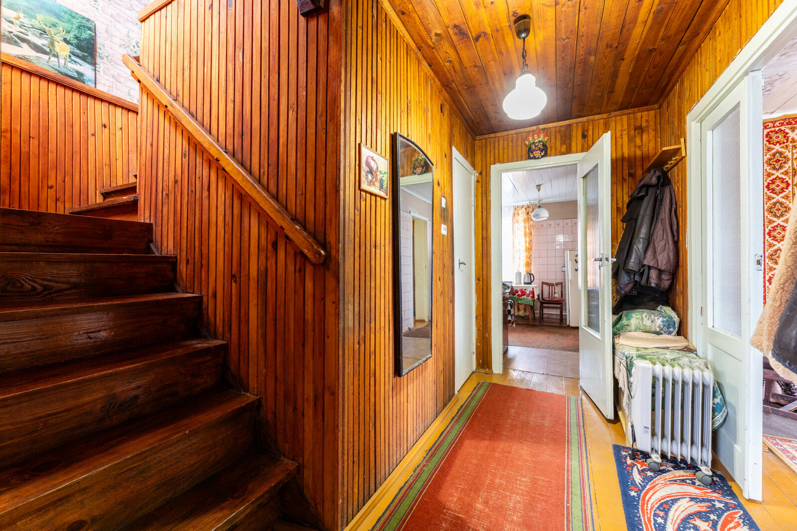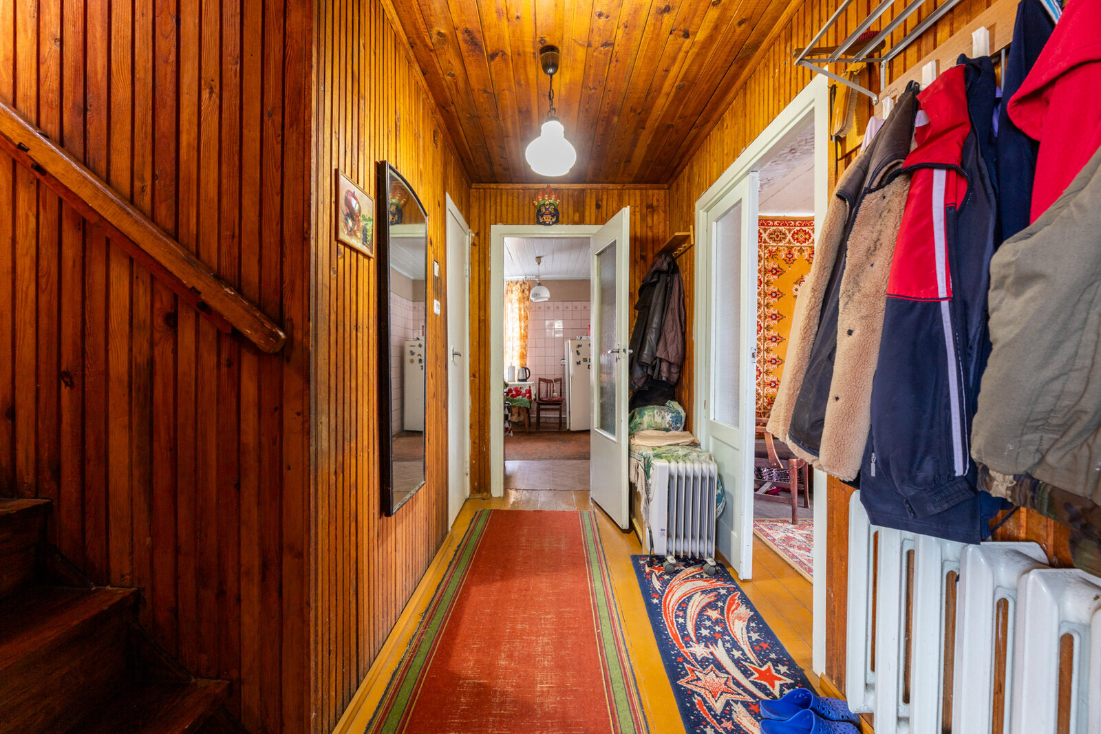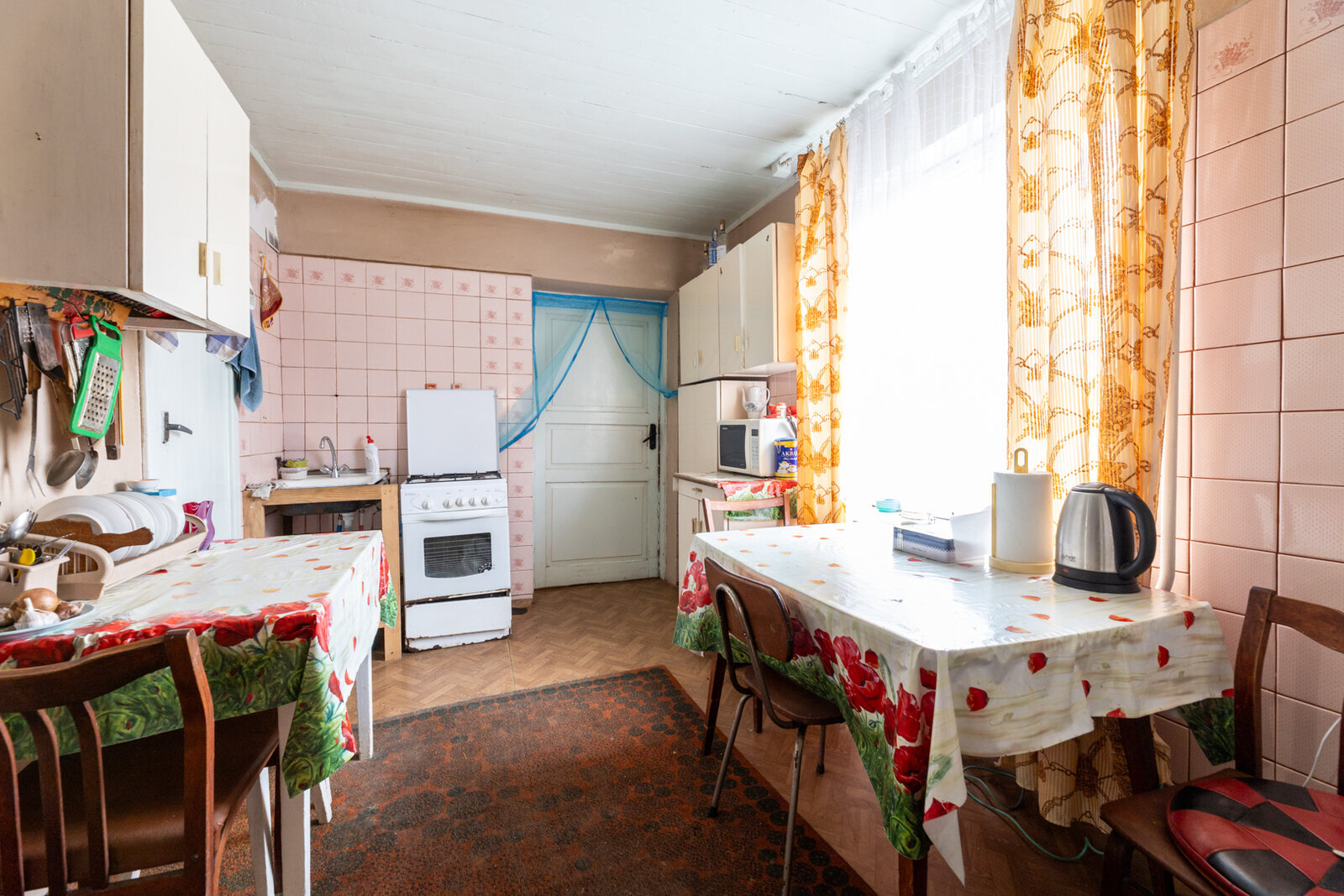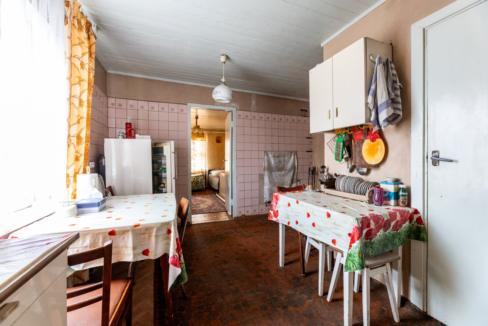 Дом блочный, утеплен и обложен кирпичом. В доме шесть жилых комнат, кухня, туалет с душевой и гараж.