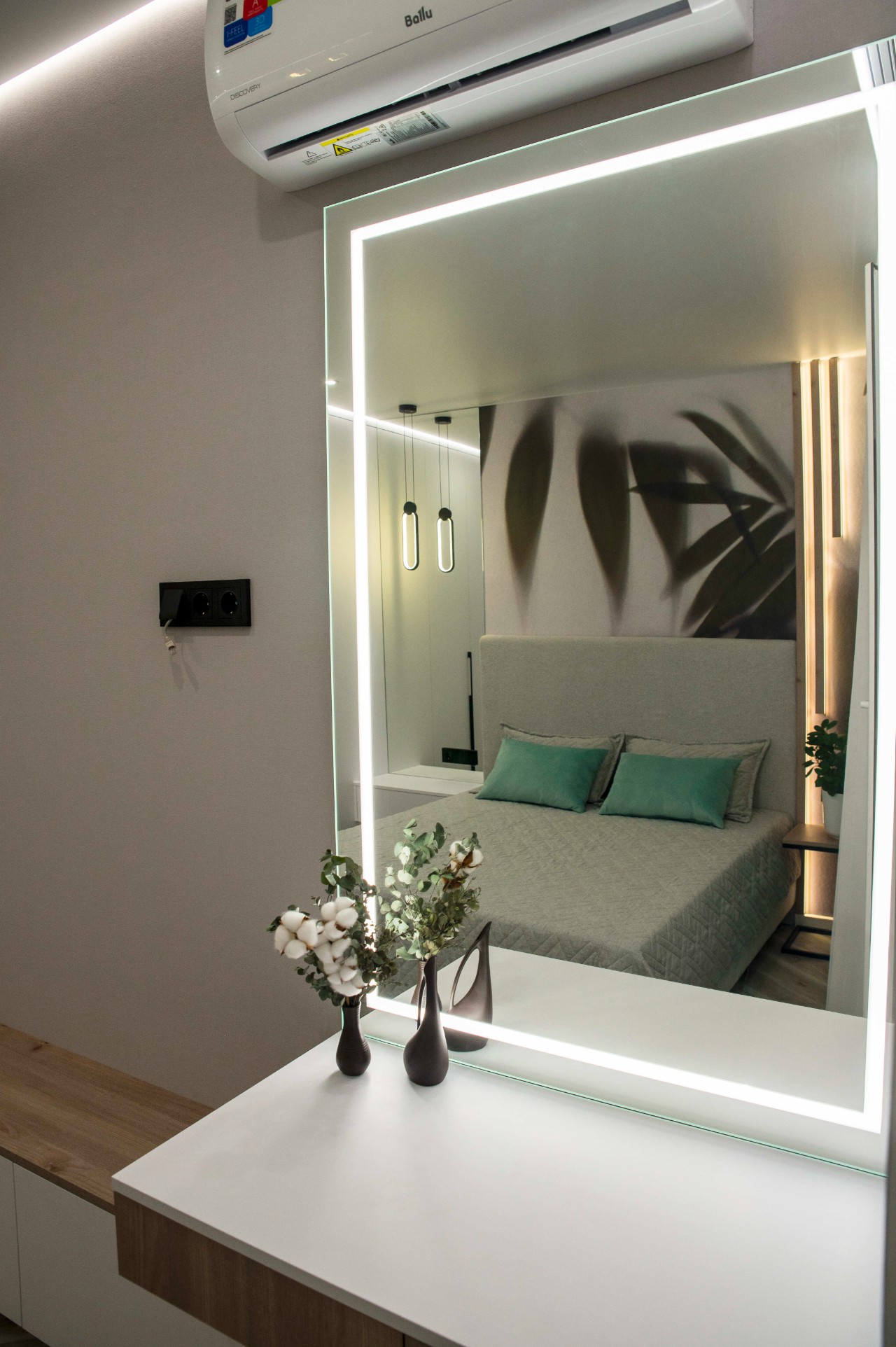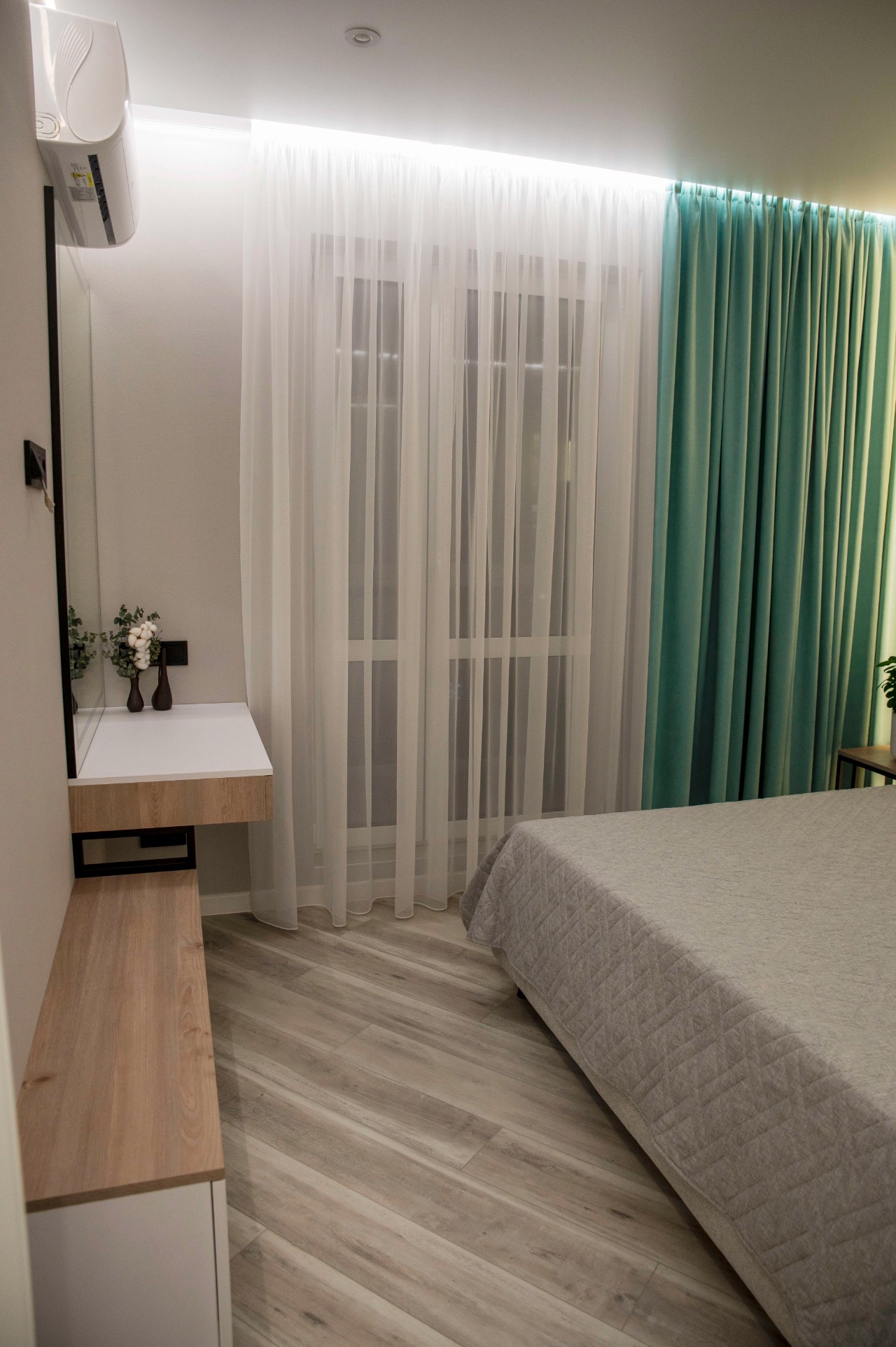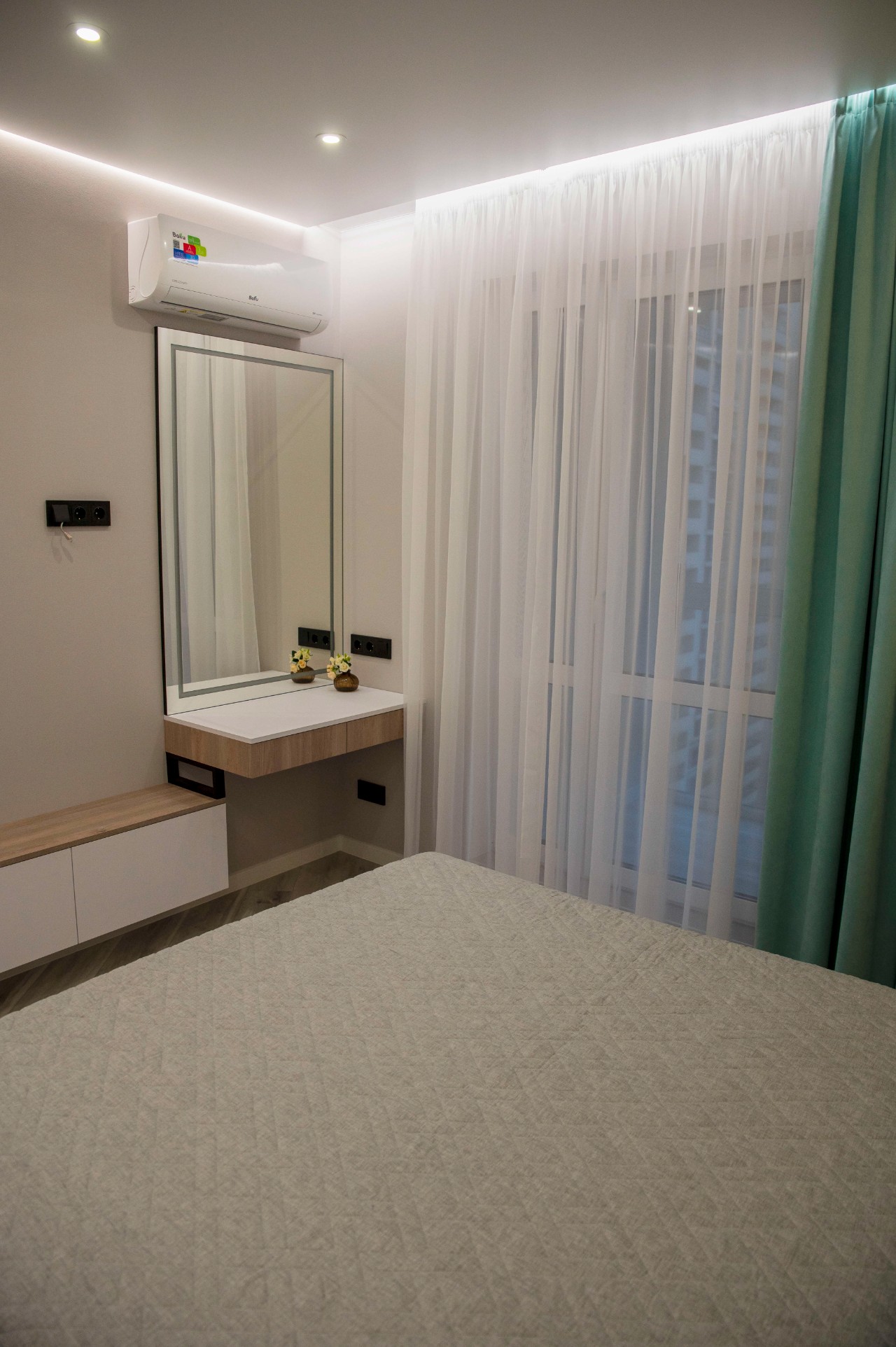 Обилие зеркал делает квартиру значительно объемнее и привлекательнее. Межкомнатные двери высотой 2.1 метров. В квартире потолки натяжные с зонированным освещением, теневыми подсветками, подсветками штор. Для комфортной жизни, в гостиной и спальне установлены отдельные кондиционеры. Мягкая мебель выполнена под заказ, с использованием качественных материалов. В квартире предусмотрен проточный водонагреватель, чтобы на время летнего отключения горячей воды, с комфортом принимать ванную.