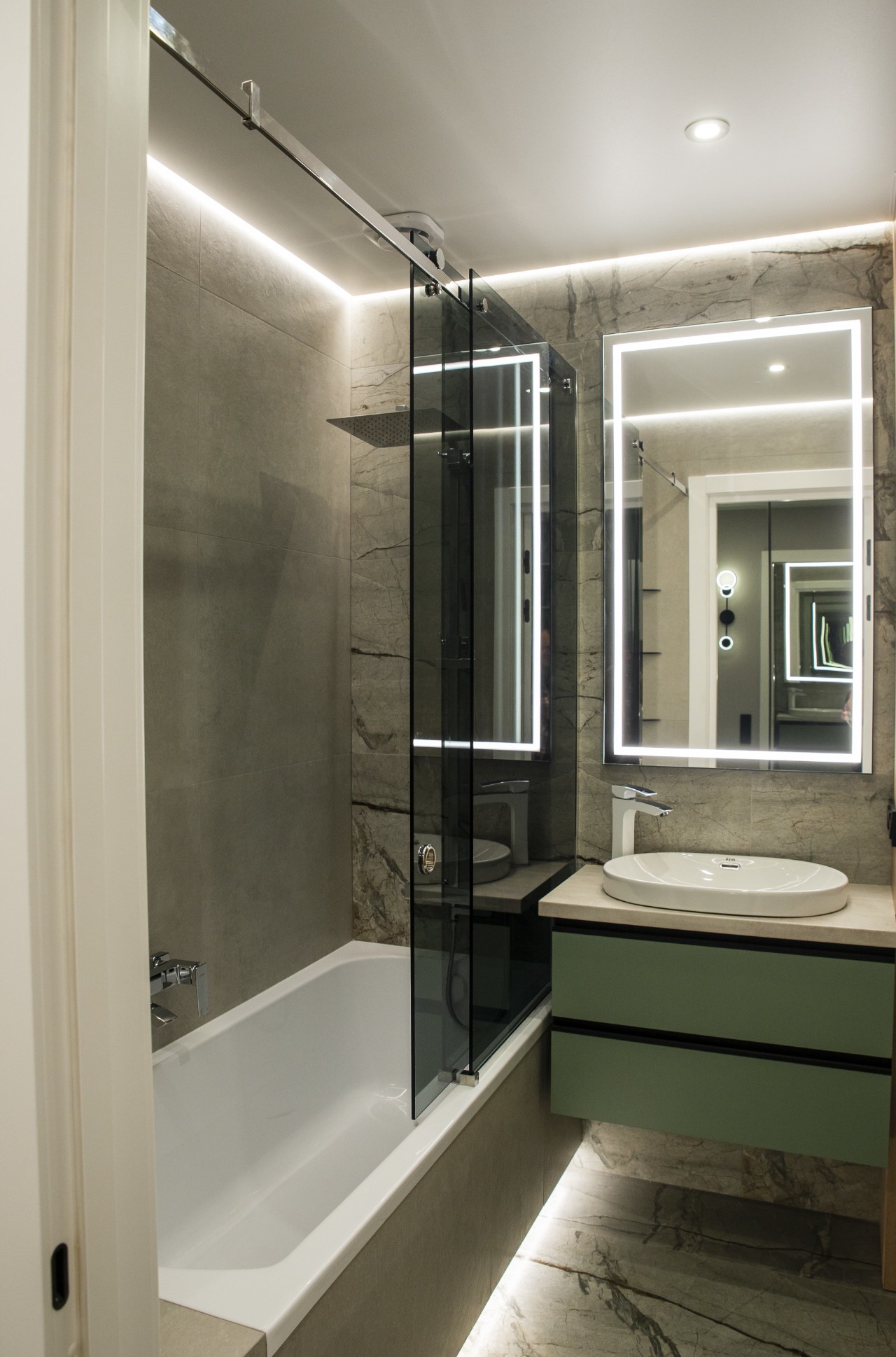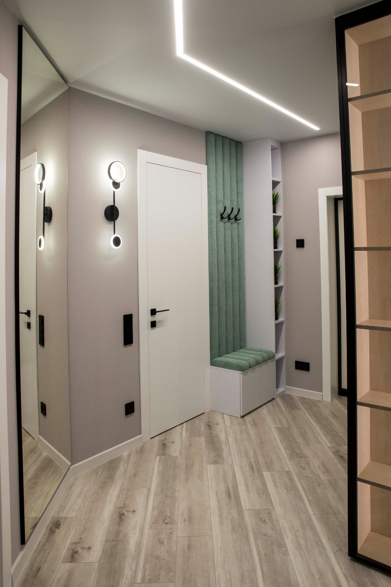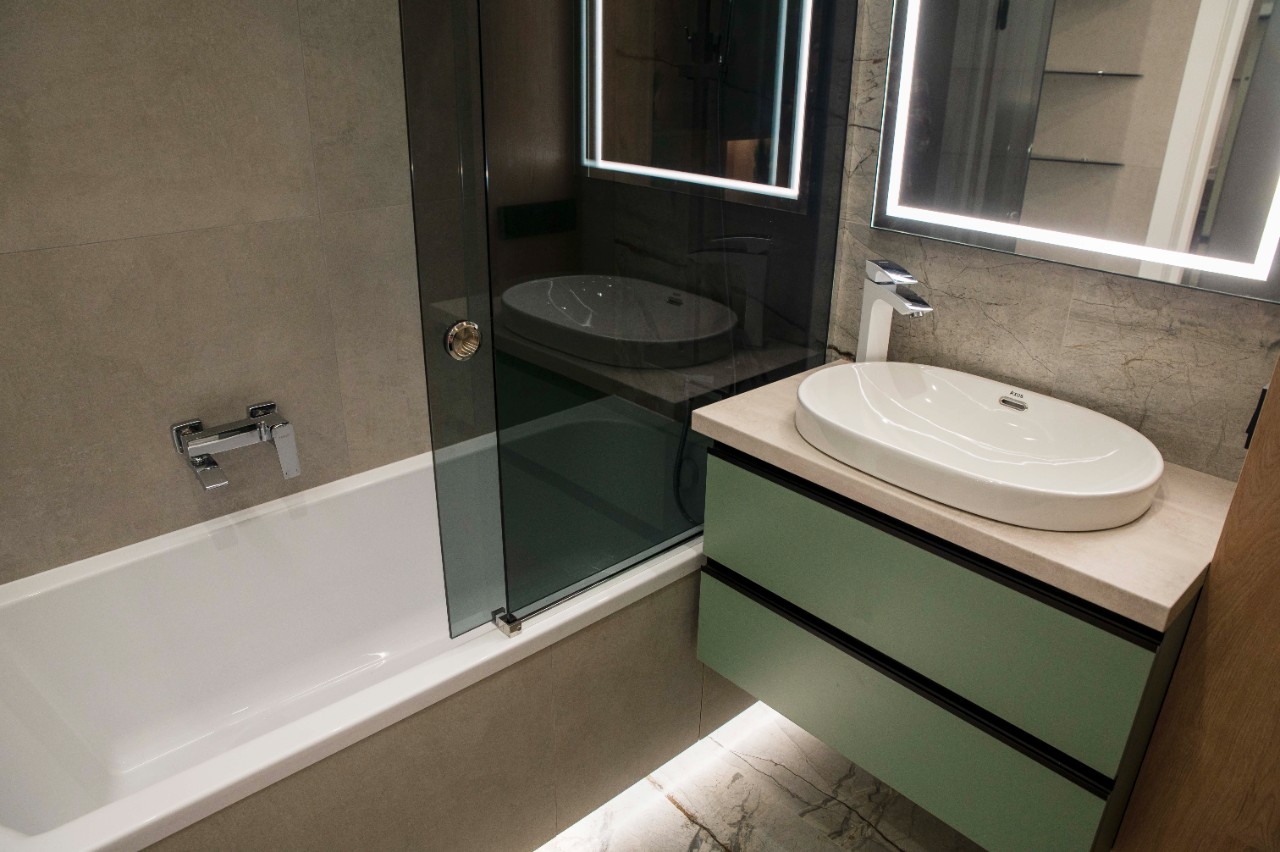 Обилие зеркал делает квартиру значительно объемнее и привлекательнее. Межкомнатные двери высотой 2.1 метров. В квартире потолки натяжные с зонированным освещением, теневыми подсветками, подсветками штор. Для комфортной жизни, в гостиной и спальне установлены отдельные кондиционеры. Мягкая мебель выполнена под заказ, с использованием качественных материалов. В квартире предусмотрен проточный водонагреватель, чтобы на время летнего отключения горячей воды, с комфортом принимать ванную.