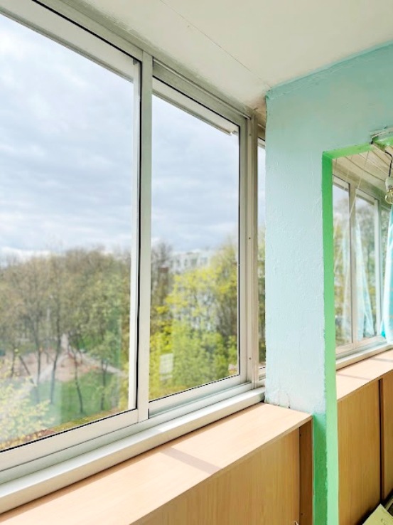 Лоджия (8,7 м. кв.) алюминиевые раздвижные рамы, встроенные,подвесные шкафы, проведен свет.