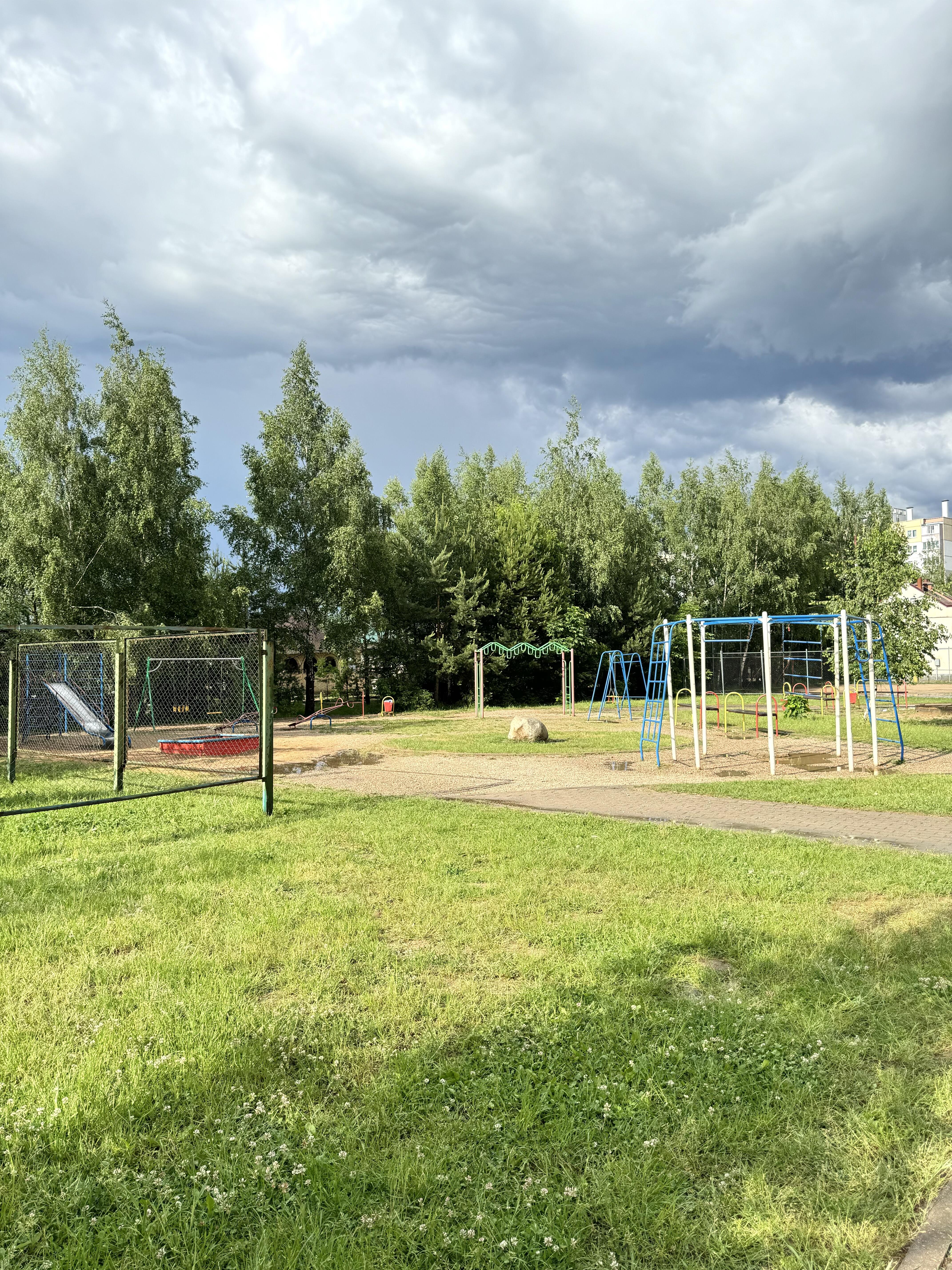 Зеленый двор с огороженной детской площадкой и парковкой для автомобилей.