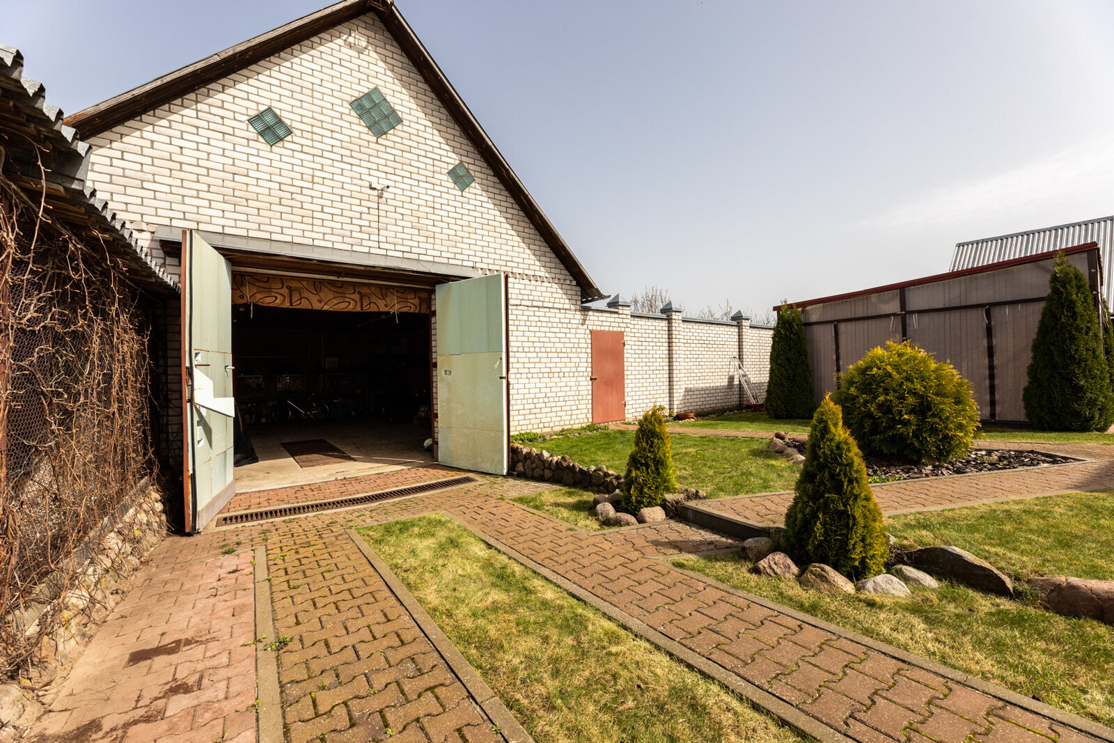 В саду плодоносящие деревья и кустарники: груши, сливы, вишни, черешни, яблони, деревья грецкого ореха. По периметру сад а- берёзы. Около дома- голубые ели.
