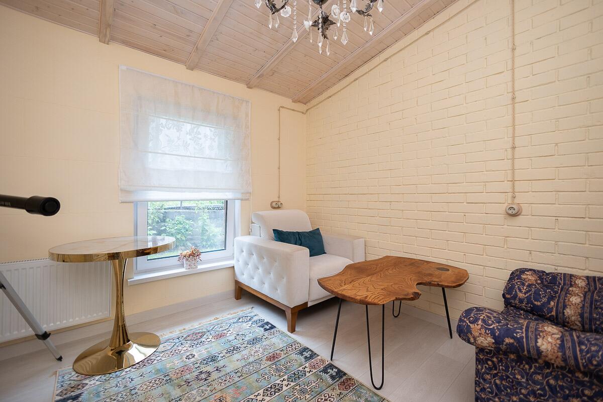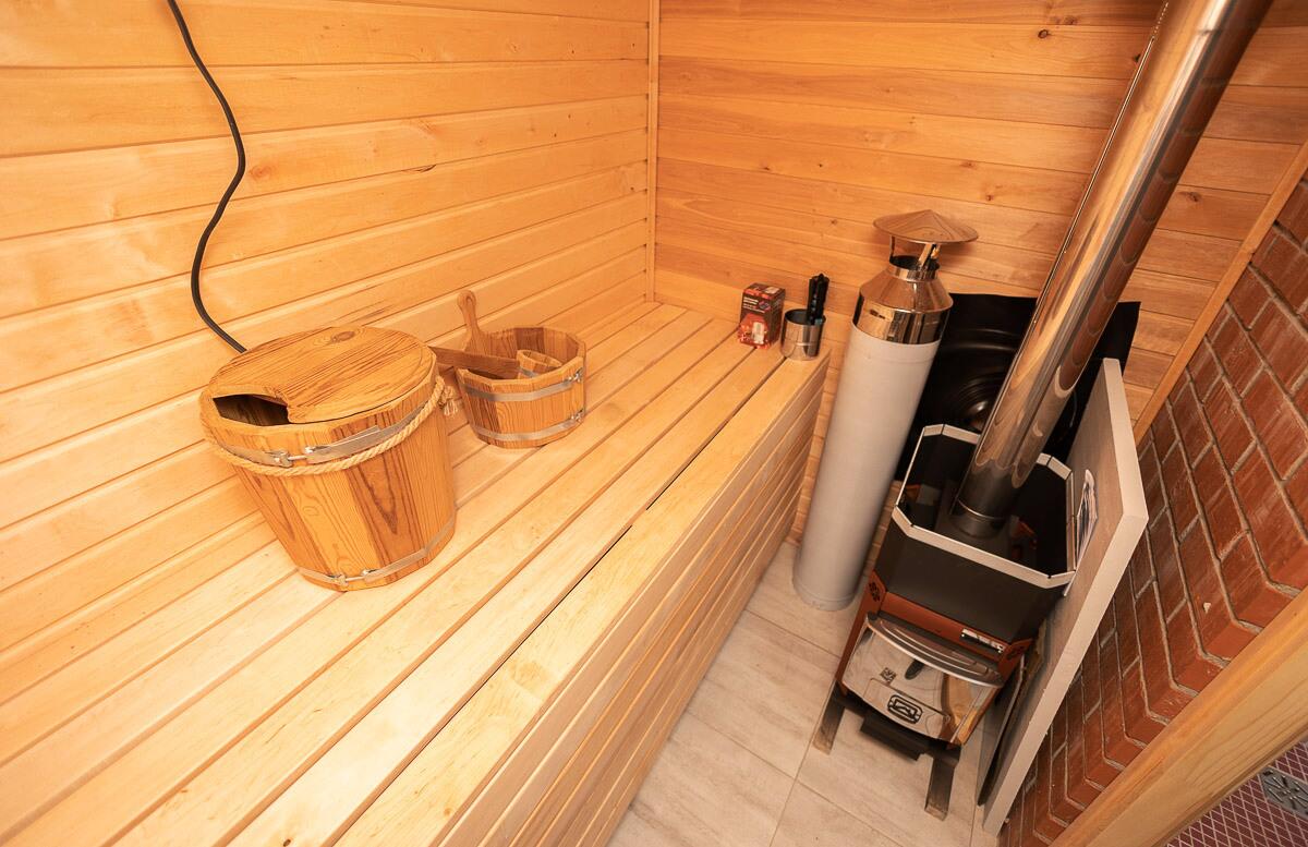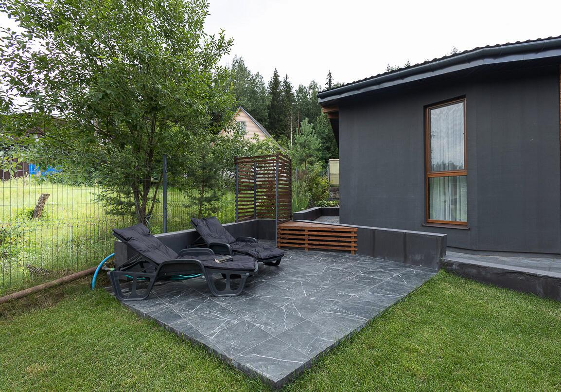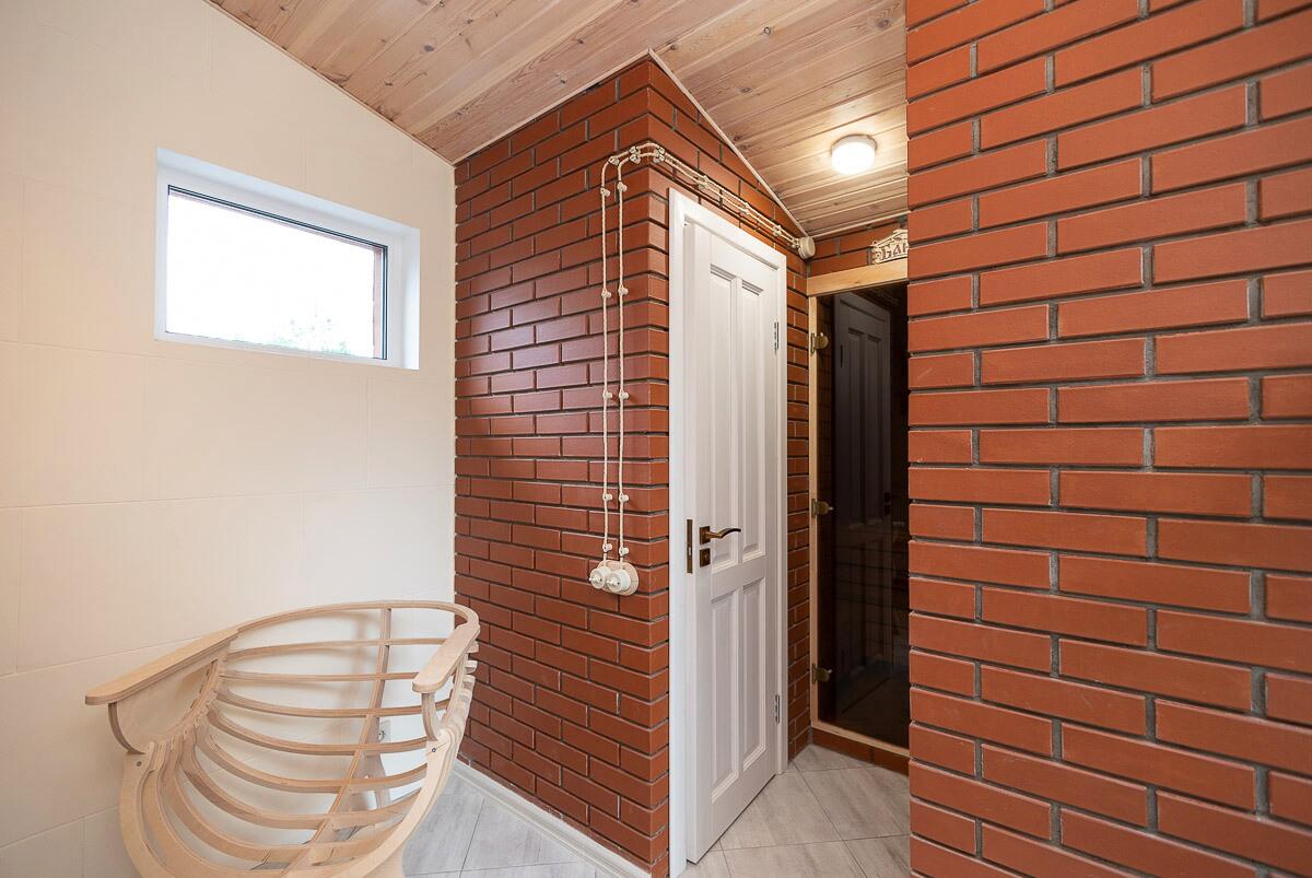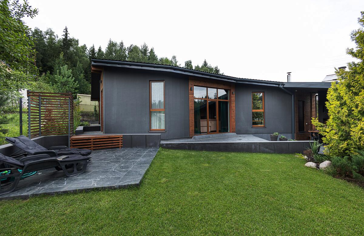 4 жилые комнаты и гостинную 2 санузла, кухню-столовую, котельную и прихожую На участке сауна с комнатой отдыха и выходом на террасуСантехника, керамика, мебель, освещение, бытовая техника - все известных европейских производителей