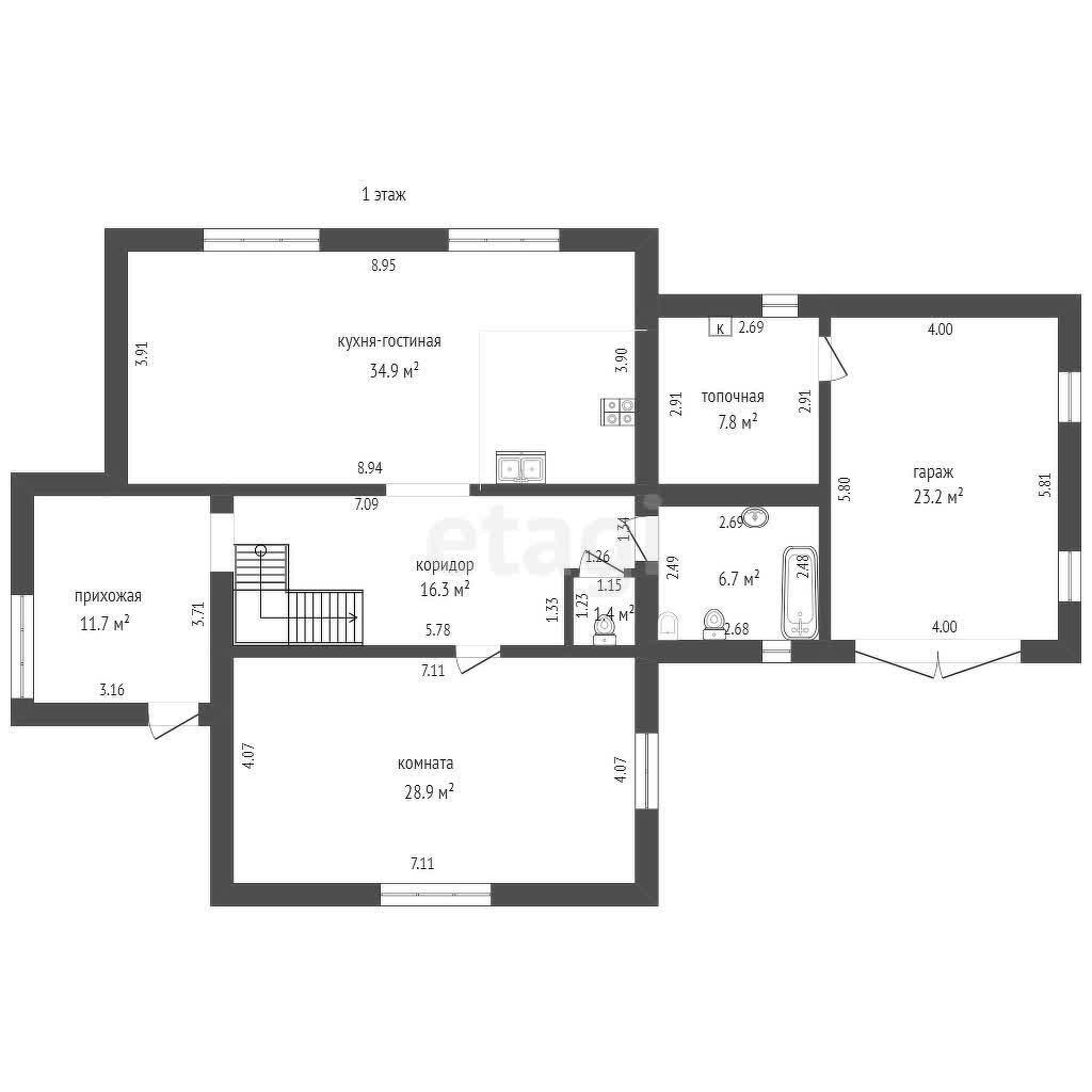 На первом этаже дома расположены: прихожая 11,7 м2, коридор 16,3 м2, кухня-гостиная 34,9 м2, 1 комната 28,9 м2, раздельный санузел. Топочная и гараж находятся также на первом этаже с отдельным входом. Полы на первом этаже дома с подогревом, покрытия нет, только бетонная стяжка.