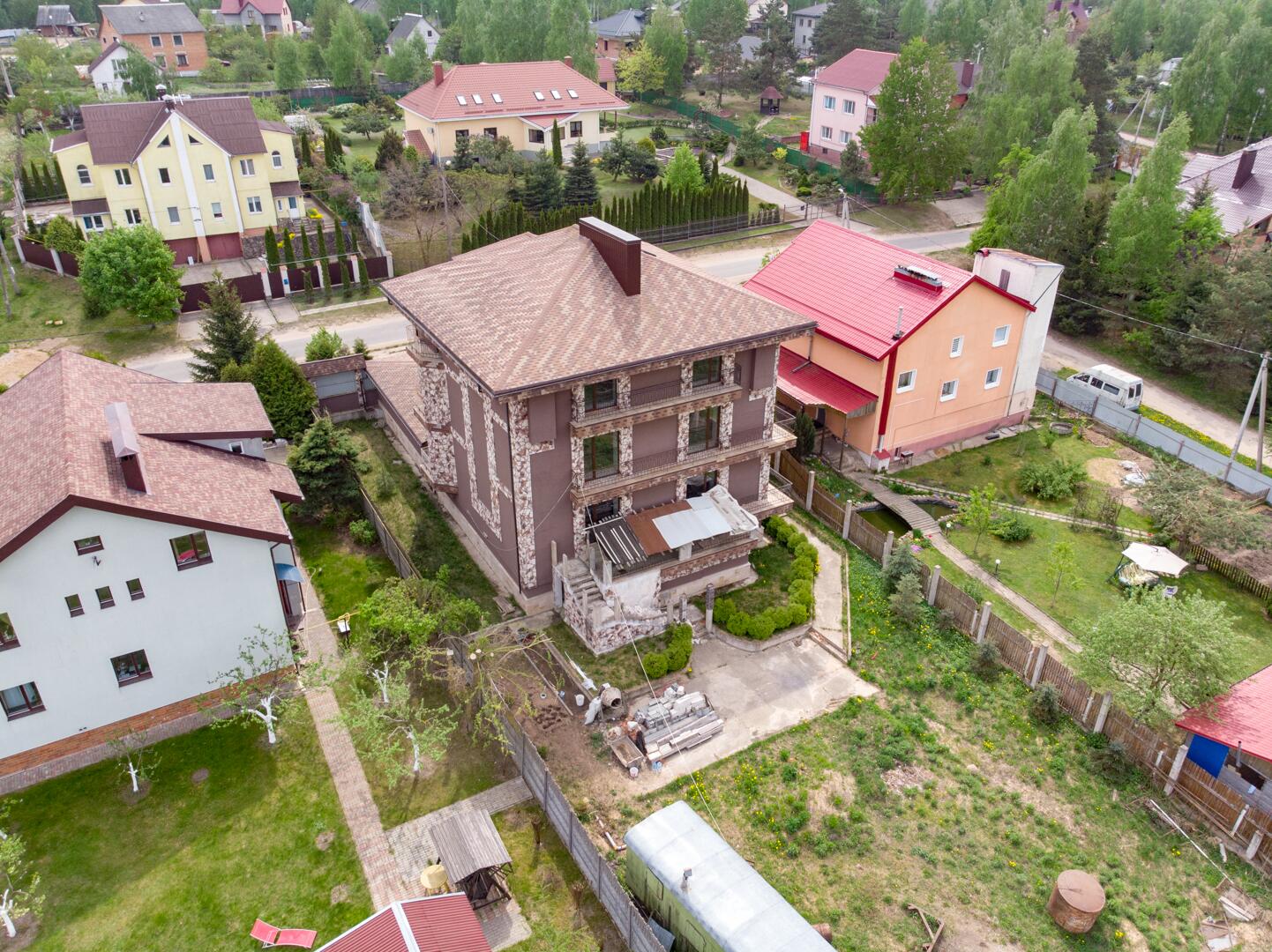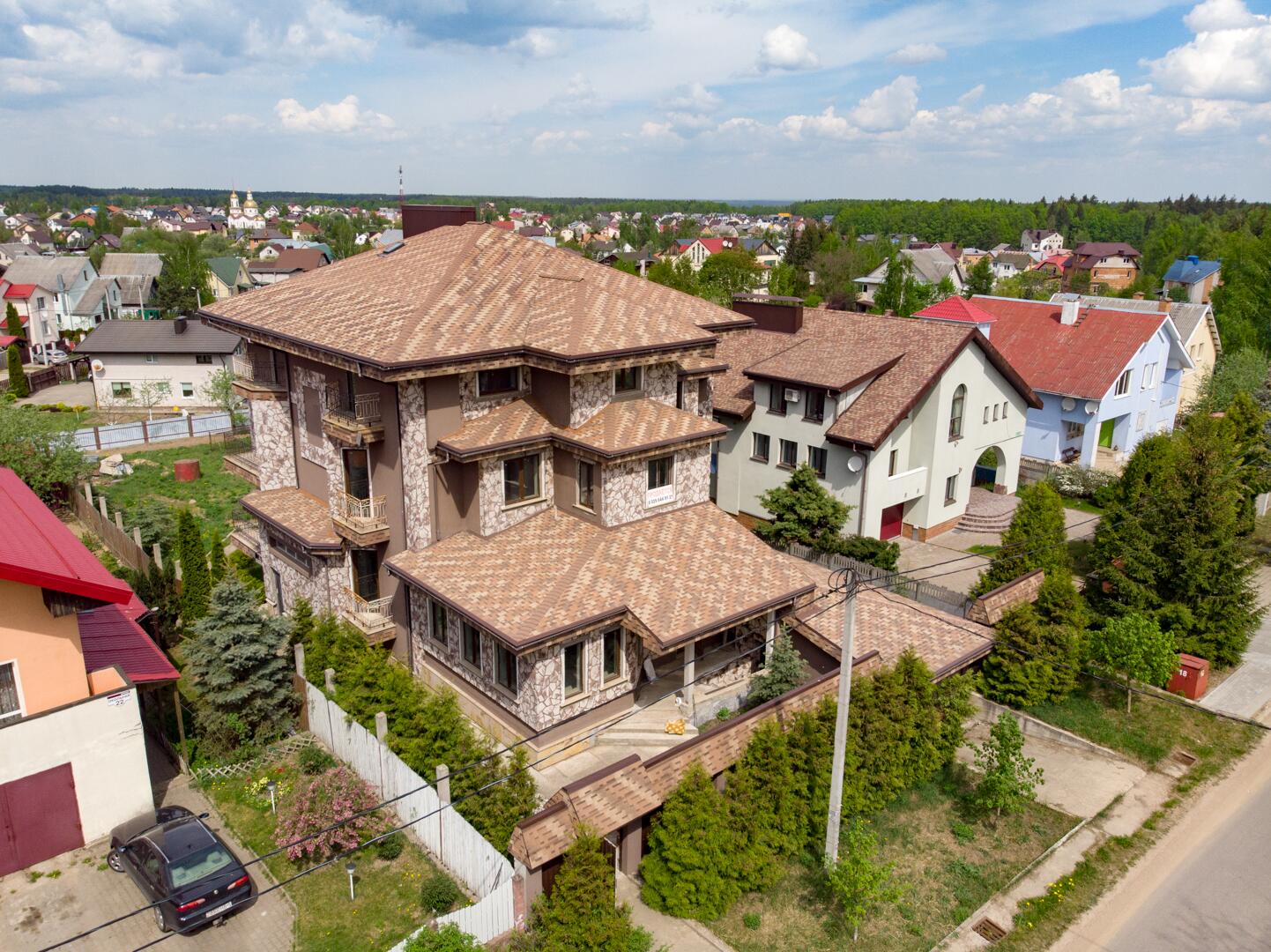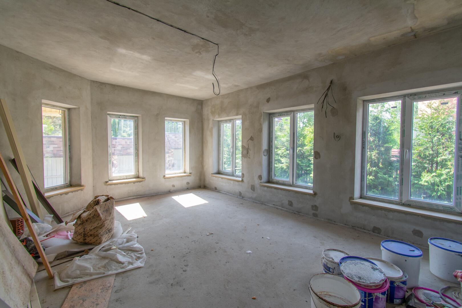 Дом кирпичный, что обеспечивает отличную тепло- и шумоизоляцию, построен в 2021 году. Снаружи стены (600мм) утеплены (100мм) и отделаны декоративным камнем. Общая площадь здания 630,4 м2. Фундамент – ФБС, перекрытия железобетонные, крыша – битумная черепица. На окнах ПВХ-профиль (почти все эркерные и французские), подоконники из натурального камня, полы залиты черновой стяжкой. Входная дверь металлическая. Межкомнатные двери отсутствуют. Высота потолков 1,2 этажи и подвал составляет 3,2 м2, 3 этаж 3м2. На первом этаже установлен камин, дымоход проведен на каждом этаже. Вентиляция с естественным побуждением.