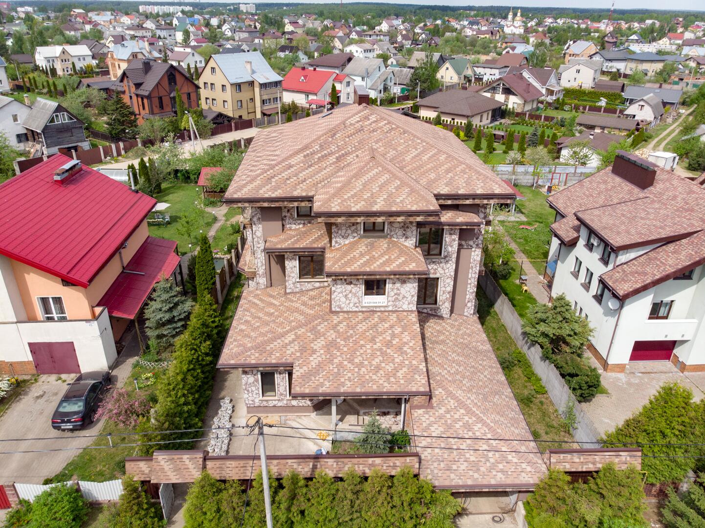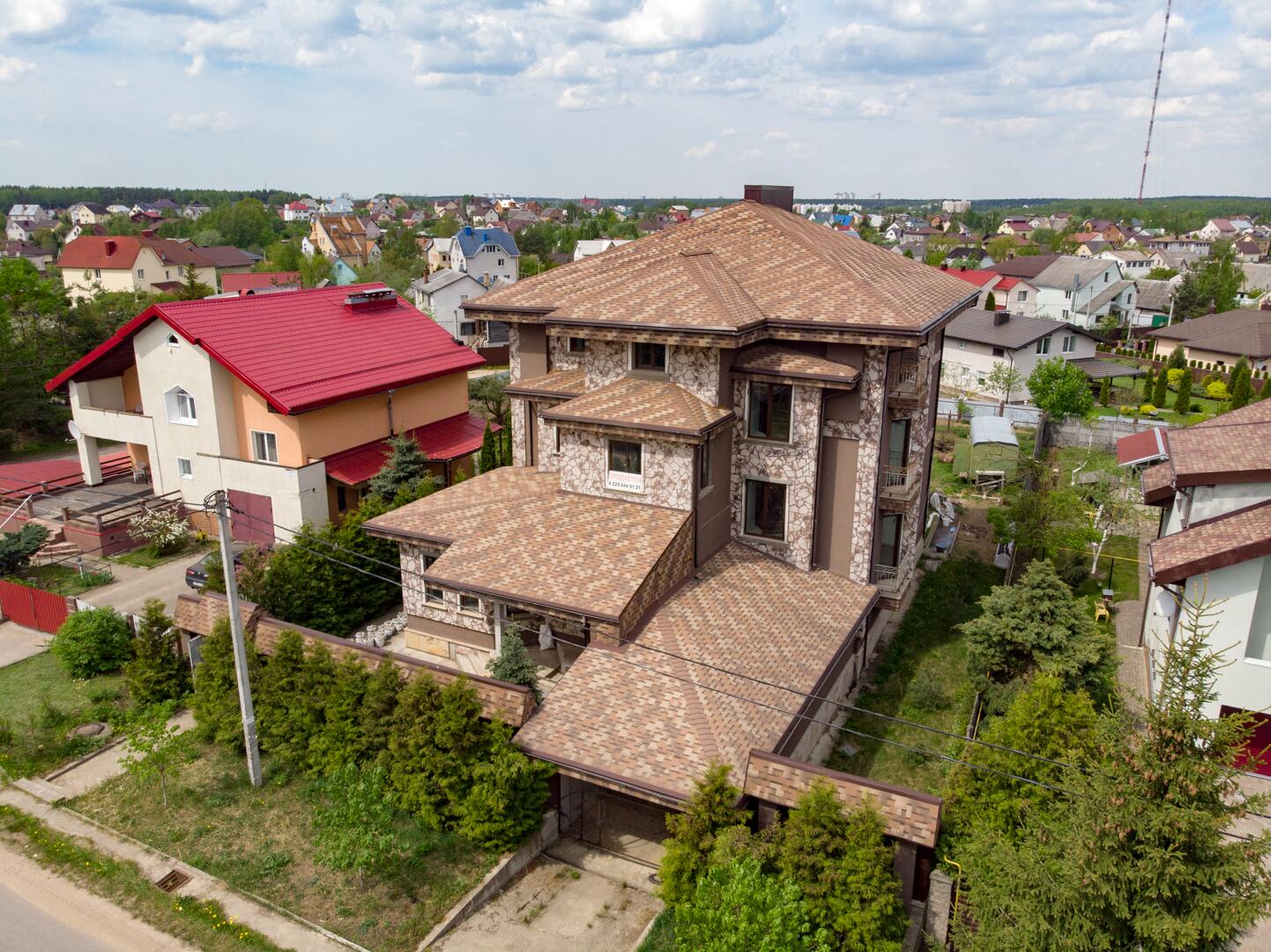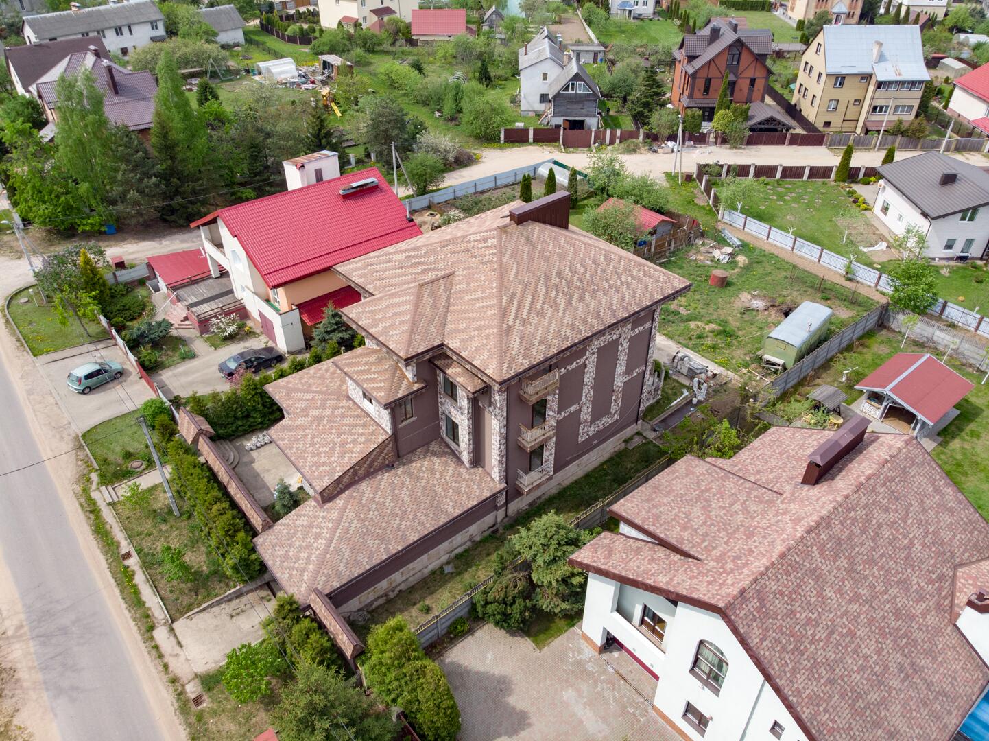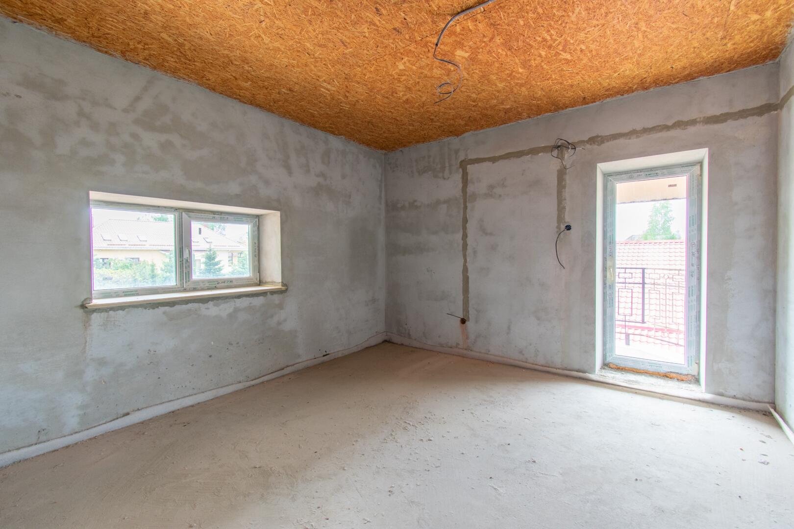 Дом кирпичный, что обеспечивает отличную тепло- и шумоизоляцию, построен в 2021 году. Снаружи стены (600мм) утеплены (100мм) и отделаны декоративным камнем. Общая площадь здания 630,4 м2. Фундамент – ФБС, перекрытия железобетонные, крыша – битумная черепица. На окнах ПВХ-профиль (почти все эркерные и французские), подоконники из натурального камня, полы залиты черновой стяжкой. Входная дверь металлическая. Межкомнатные двери отсутствуют. Высота потолков 1,2 этажи и подвал составляет 3,2 м2, 3 этаж 3м2. На первом этаже установлен камин, дымоход проведен на каждом этаже. Вентиляция с естественным побуждением.