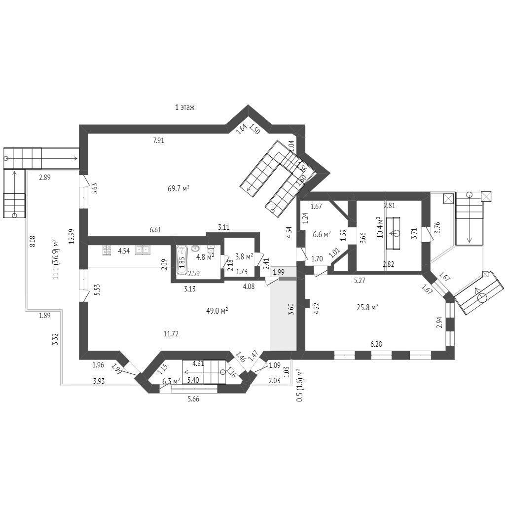 1 этаж: просторная кухня-гостиная 49,0 м2 с выходом на террасу 11м2, 2 больших комнаты общего пользования (69,7м2, 25,8м2), раздельный санузел. С 1 этажа можно спуститься на цокольный этаж не выходя из дома, что удобно. Отличное решение для отдыха большой компанией!