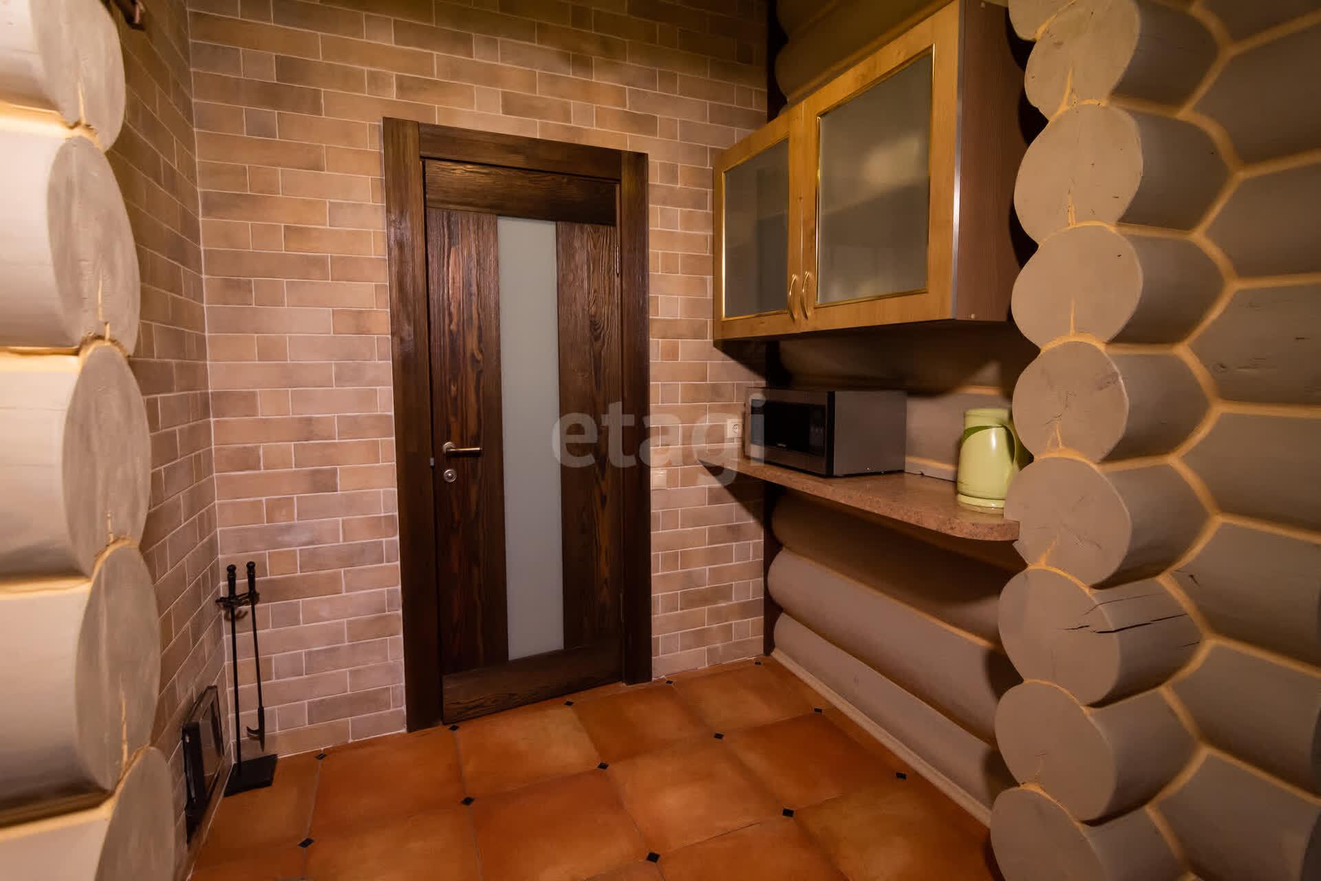 баня с террасой общей площадью 74 м.кв. Материал стен сруб-кругляк, наружные швы – американская мастика, крыша утеплена каменной ватой 250 мм. Полы тёплые, плитка итальянская. В отделке сауны использована вагонка из липы, полки-дерево абаш. Печь финская Harvia. В цокольном этаже расположился гараж для храниния лодок, квадро и гидроциклов.