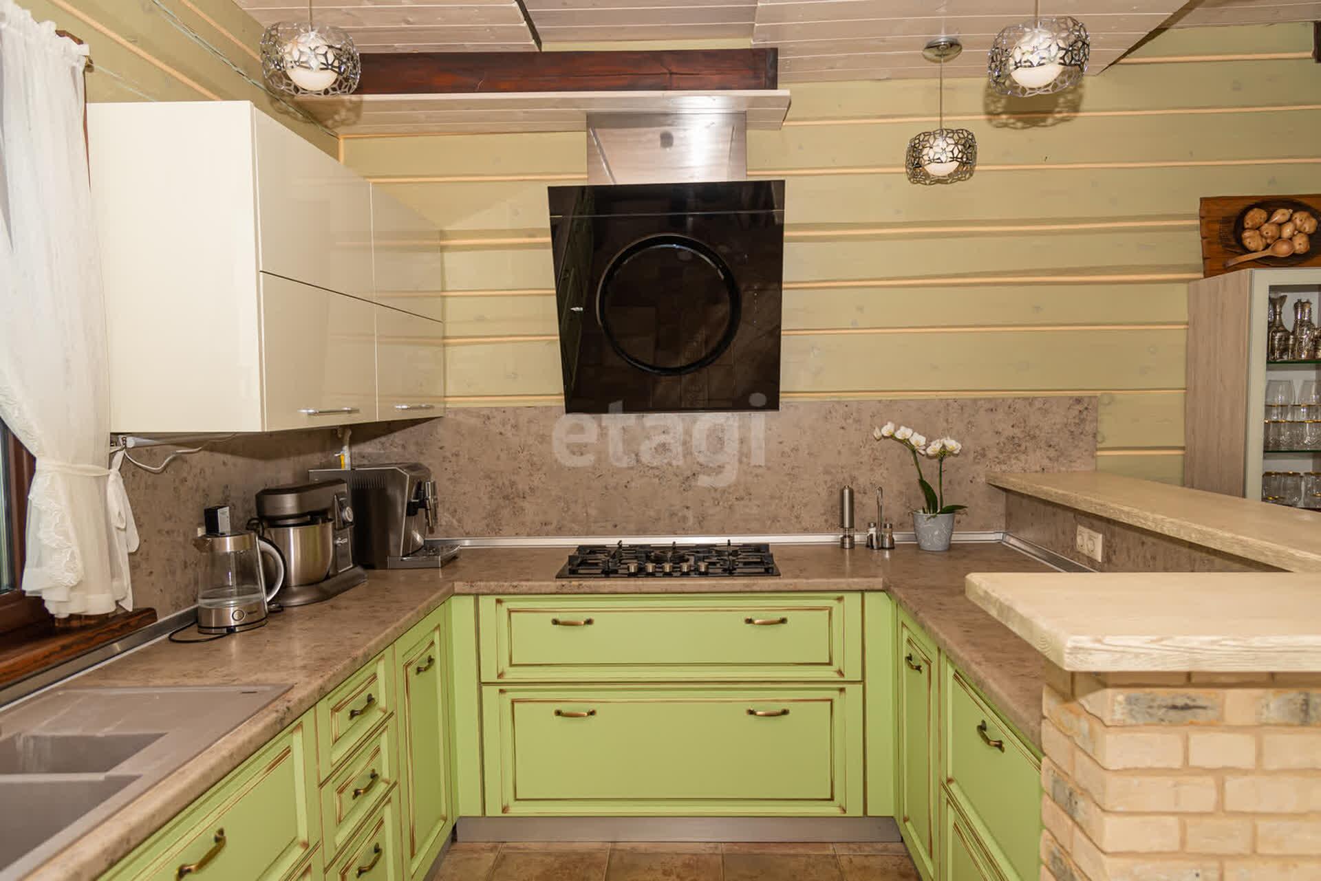 Кухонный гарнитур выполнен по индивидуальному проекту из массива, встроенная техника Siemens (посудомоечная машина, духовой шкаф, газовая варочная поверхность, печь СВЧ, стиральная машина), вытяжка Elica, холодильник Liebherr.
