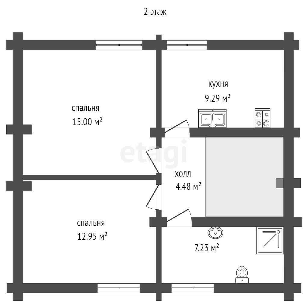 На втором мансардном этаже размещены 2 спальни 15 м2 и 12,95 м2, а также кухня 9,29м2.