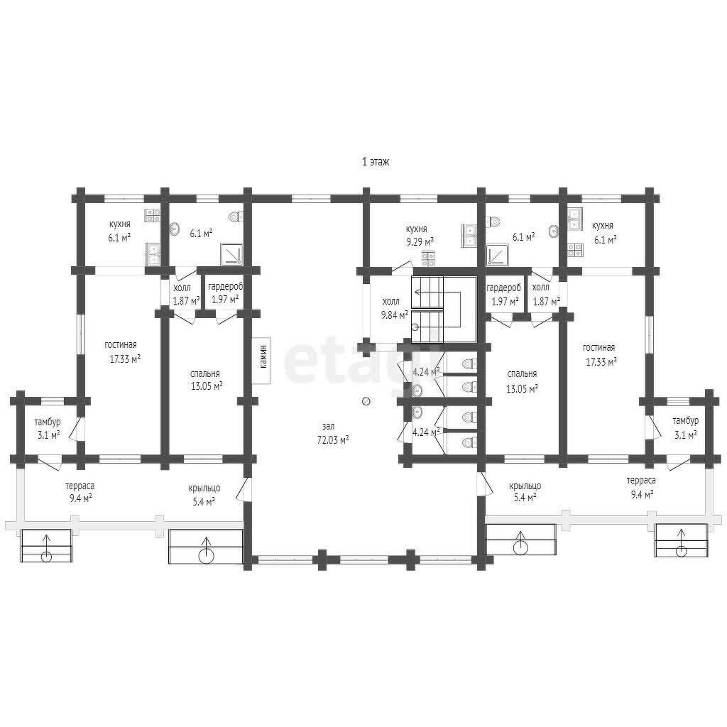 На первом этаже дома расположены: 2 блока, состоящие из кухни 6,1 м2, санузла 6,1 м2, гостиной 17,33 м2, спальней 13,05 м2. Имеют выход в 3 блок с кухней 9,29 м2, залом 72,03 м2 и 2-мя санузлами.
