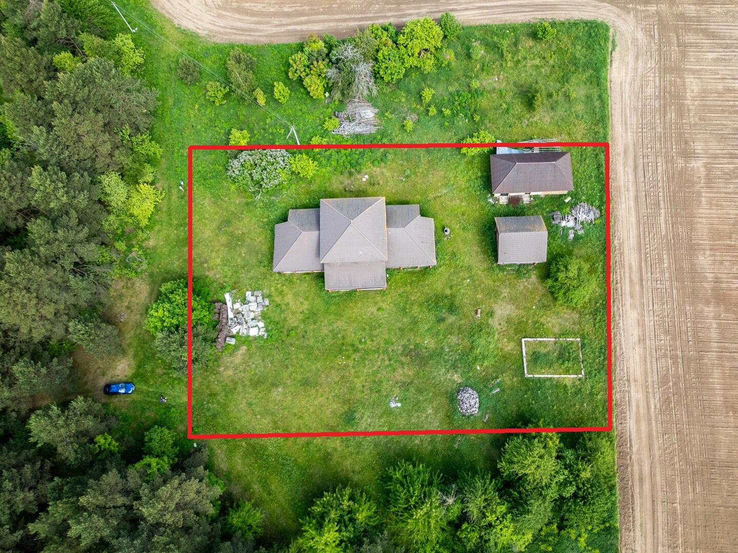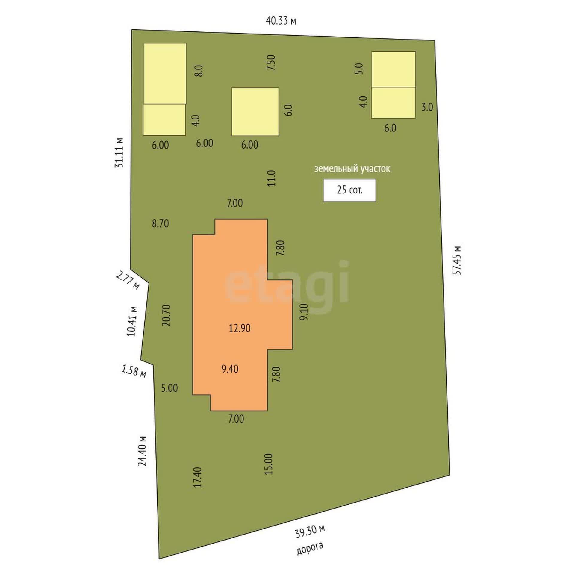 Земельный участок вокруг дома составляет 25 соток, ровный, сухой, находится в отдалении от других домов, фактически хутор. Граничит с лесом, рядом пролегает грунтовая дорога. Не огорожен забором. Находится в пожизненном наследуемом владении. Из хозяйственных построек в наличии баня и сарай. Насаждений нет.