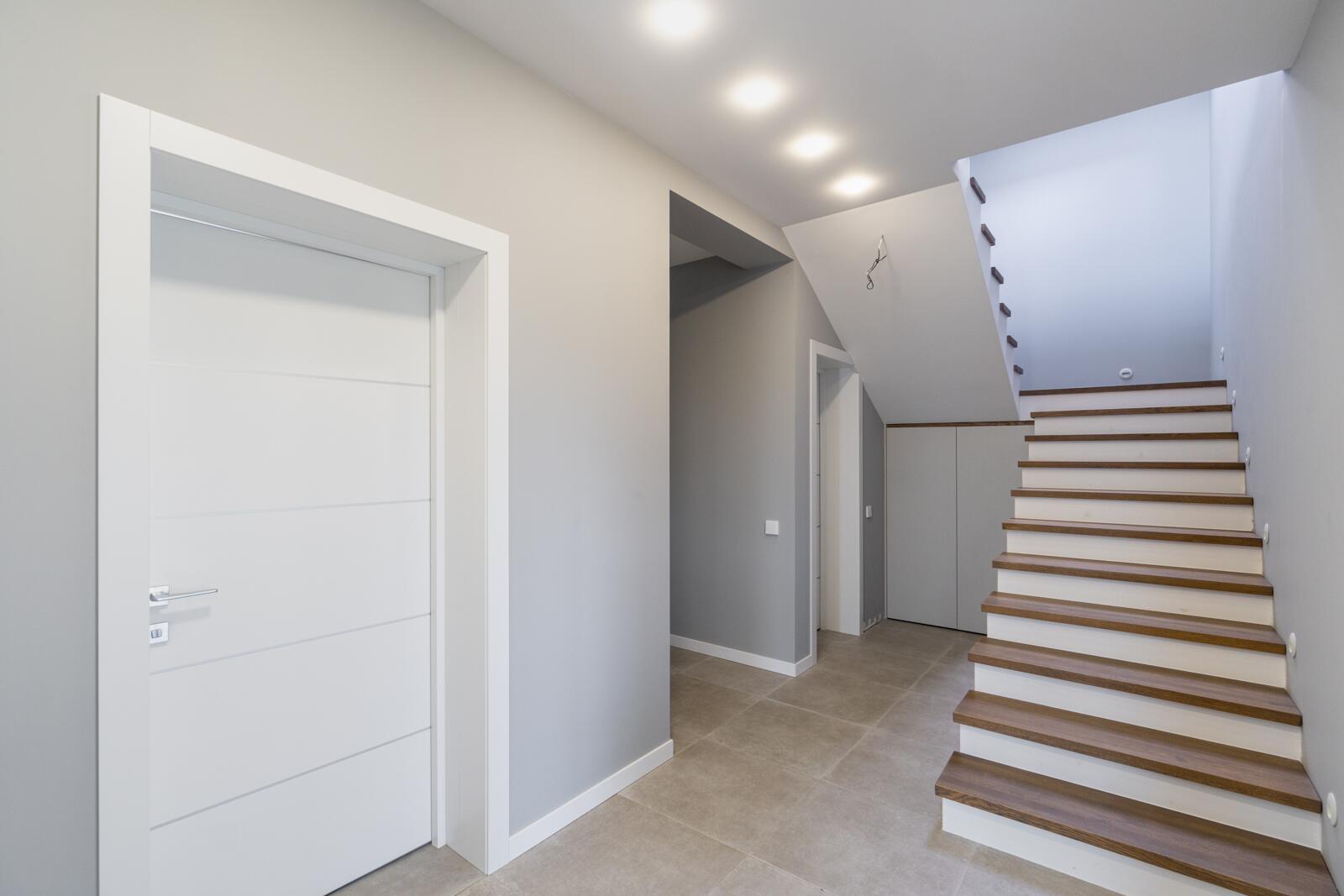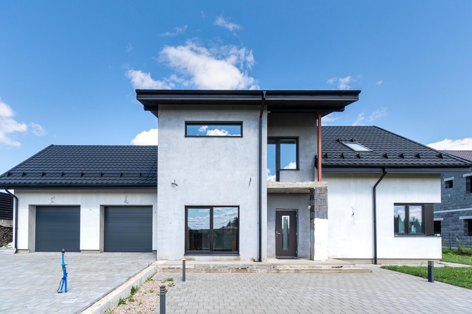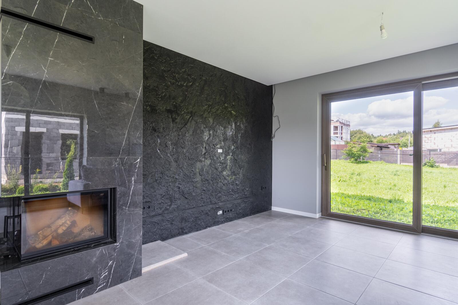 Отделка: широкоформатный керамогранит в зоне камина, керамогранит на первом этаже, на втором – ламинат 12мм, лестница выполнена из дуба. Двухкамерные стеклопакеты немецкого производителя.